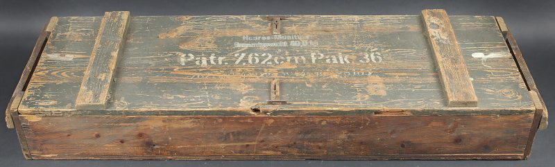 Détails de la vente >Caisse 3 obus 7,62 cm Pak.36. Caisse en bois pour 3 obus de 7,62 cm Pak.36 (r). Canon antichar de 7,62 cm 36 russe monté également sur Marder 2. Fermeture par deux loquets. Deux poignées en... en savoir plus