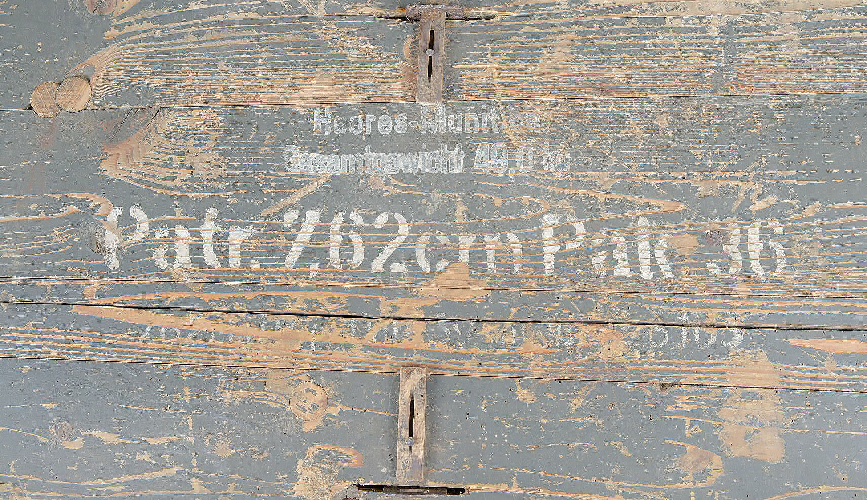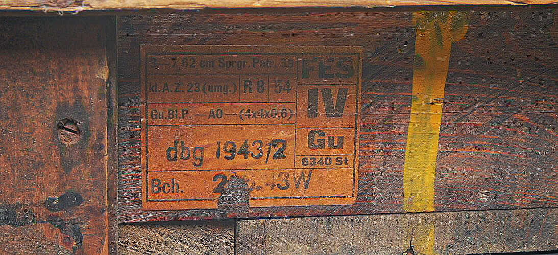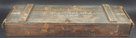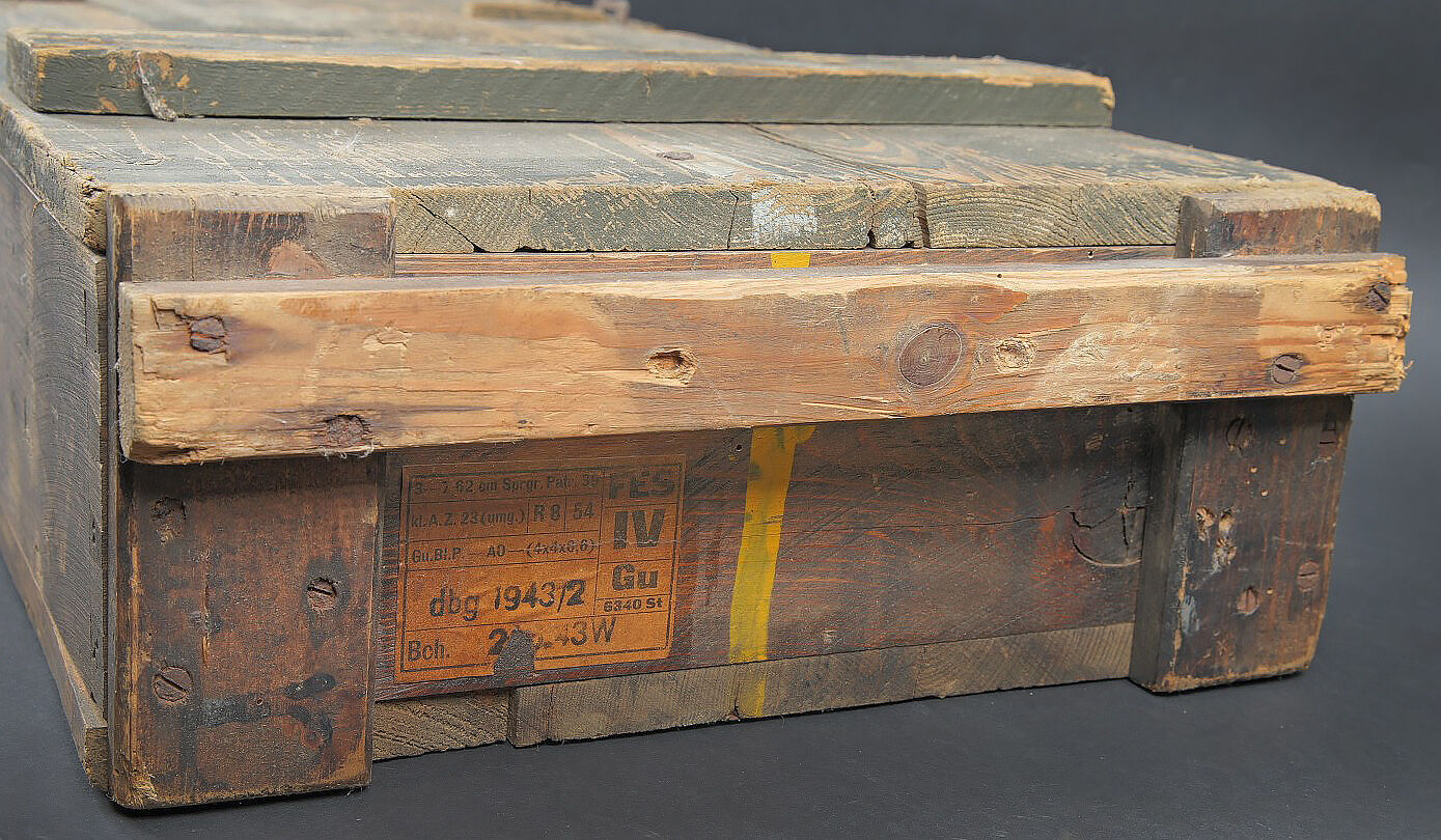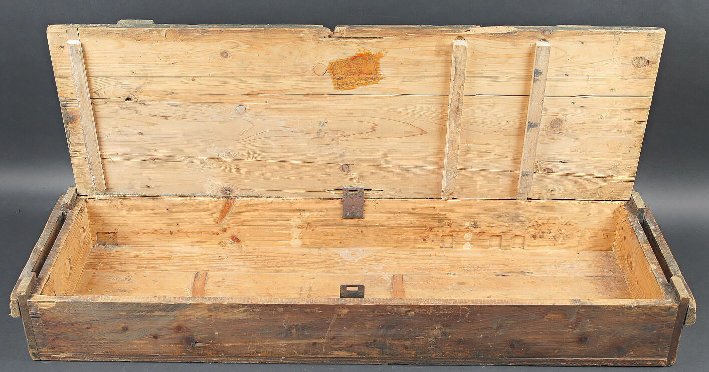 Caisse 3 obus 7,62 cm Pak.36. Caisse en bois pour 3 obus de 7,62 cm Pak.36 (r). Canon antichar de 7,62 cm 36 russe monté également sur Marder 2. Fermeture par deux loquets. Deux poignées en bois. Caisse de confection allemande. Couvercle marqué Heeres Munition Patr 7,62 cm Pak 36. Les racks sont absents. Dimensions 75 x 31 x 14 cm. A noter une certaine usure et patine de la pièce. Etat II+. Crate for three 7.62 cm Pak.36(r) rounds Wooden crate for three rounds for 7.62 cm Pak.36(r) (Russian field gun used on Marder II). Two latch closures and two wooden carrying handles. German manufacture. Lid stencilled Heeres Munition Patr 7.62 cm Pak.36. Internal racks missing. Dimensions 75 × 31 × 14 cm. Showing normal wear and patina. Condition II+.