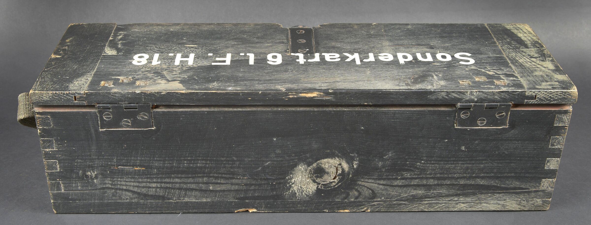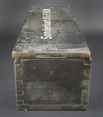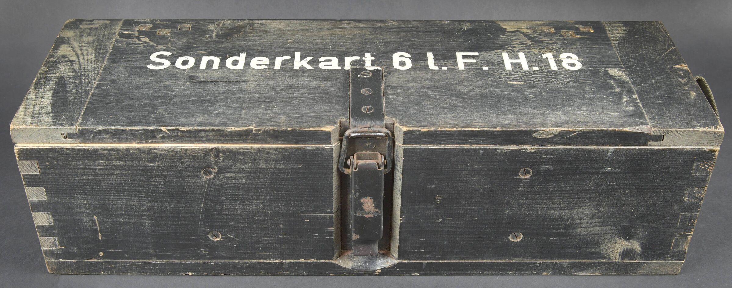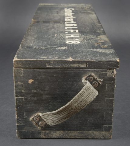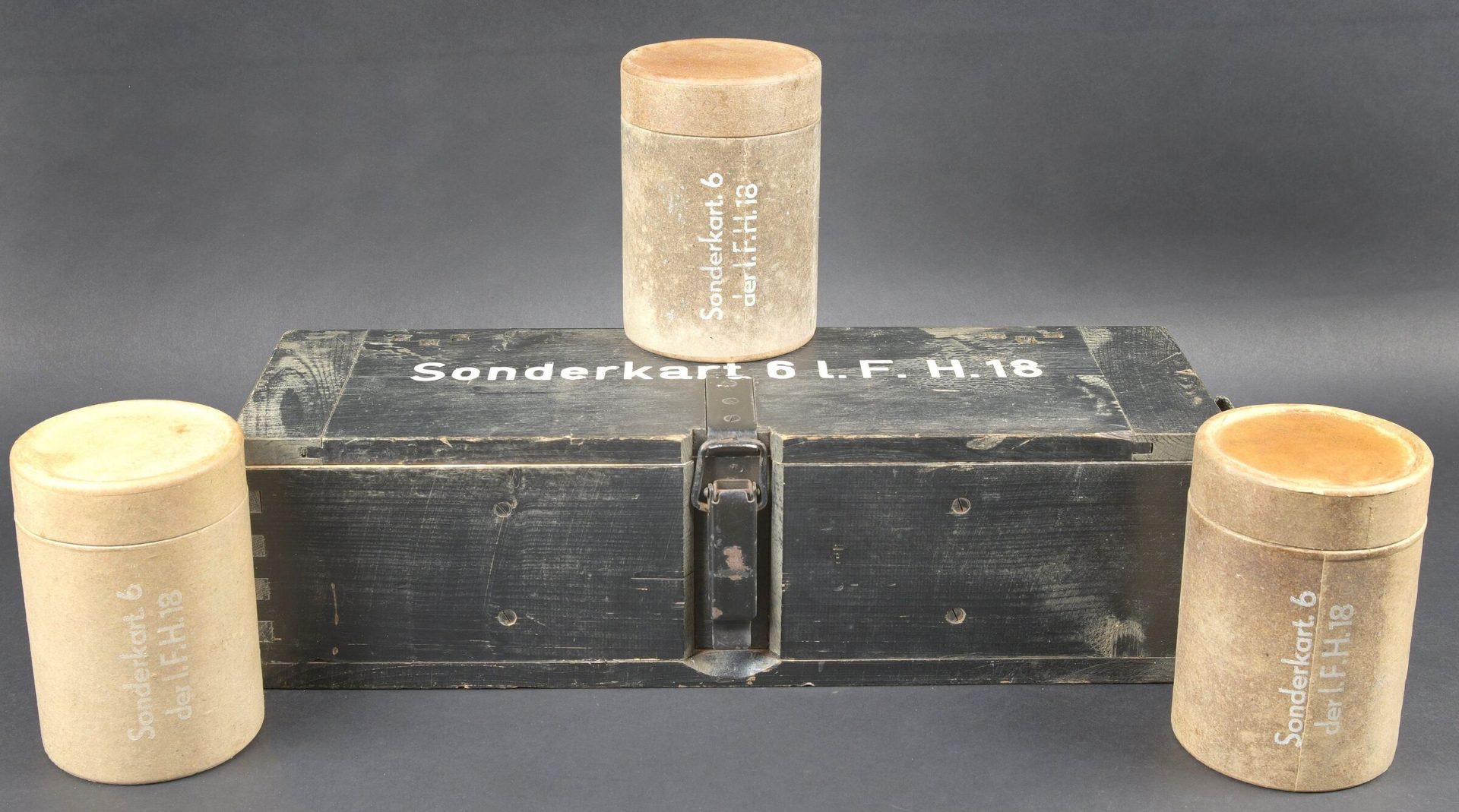 Caisse 6 L F H 18. Belle caisse en bois. Peinture noire à 70%. Le crochet de fermeture est complet. Sangle de transport en toile. Couvercle marqué Sonderkart 6 L F H 18. Contenant trois container en carton avec couvercle, marqués Sonderkart 6 der LFH 18. A noter une certaine usure et patine de la pièce. Etat II+. Crate for 6 le.F.H.18 Beautiful wooden crate with black paint at 70%. Complete hook closure and web carrying strap. Lid stencilled Sonderkart 6 le.F.H.18. Containing three cardboard containers with lids marked Sonderkart 6 der le.F.H.18. Showing normal wear and patina. Condition II+.