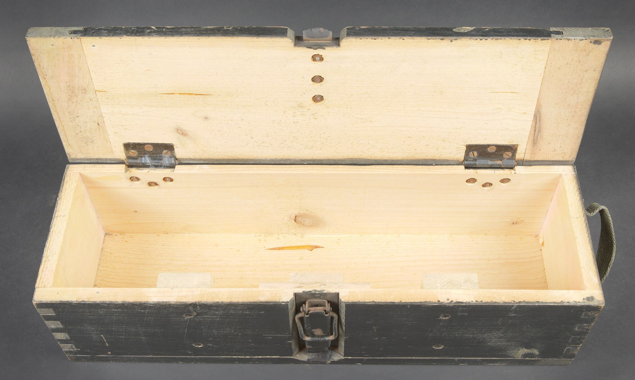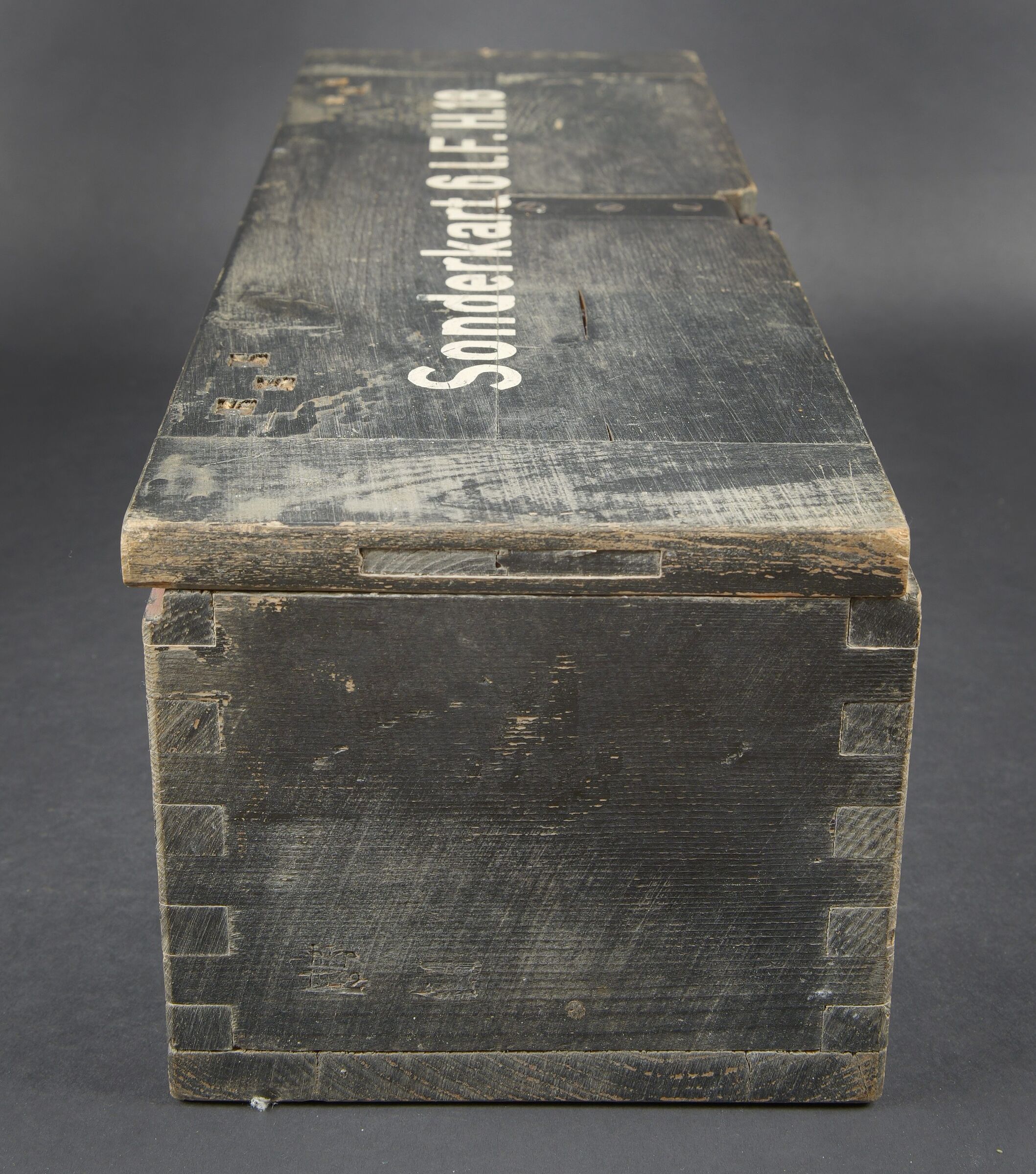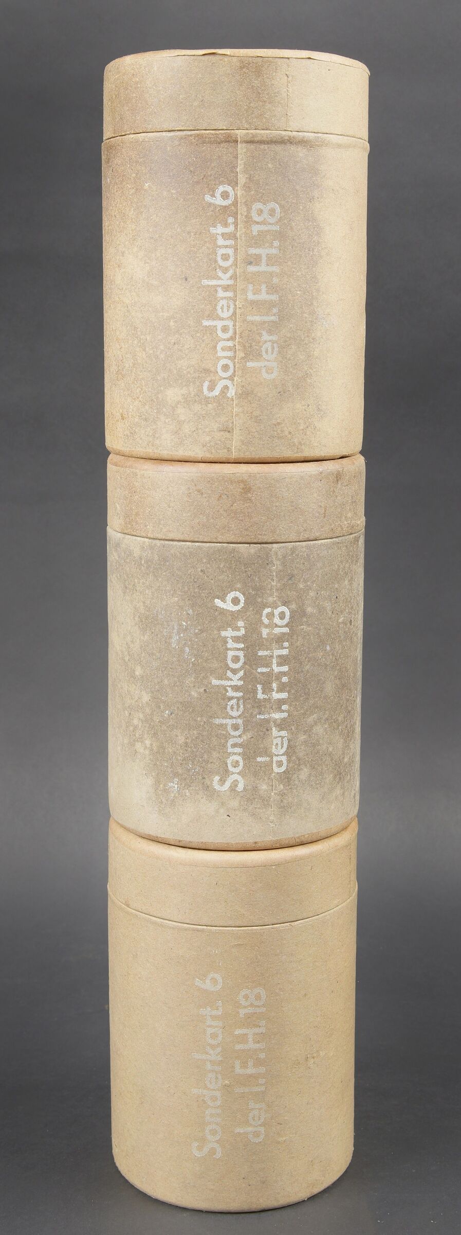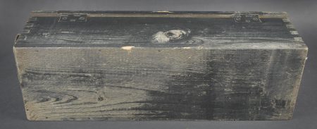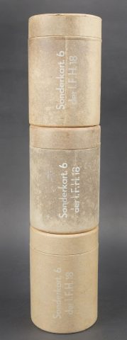 Caisse 6 L F H 18. Belle caisse en bois. Peinture noire à 70%. Le crochet de fermeture est complet. Sangle de transport en toile. Couvercle marqué Sonderkart 6 L F H 18. Contenant trois container en carton avec couvercle, marqués Sonderkart 6 der LFH 18. A noter une certaine usure et patine de la pièce. Etat II+. Crate for 6 le.F.H.18 Beautiful wooden crate with black paint at 70%. Complete hook closure and web carrying strap. Lid stencilled Sonderkart 6 le.F.H.18. Containing three cardboard containers with lids marked Sonderkart 6 der le.F.H.18. Showing normal wear and patina. Condition II+.