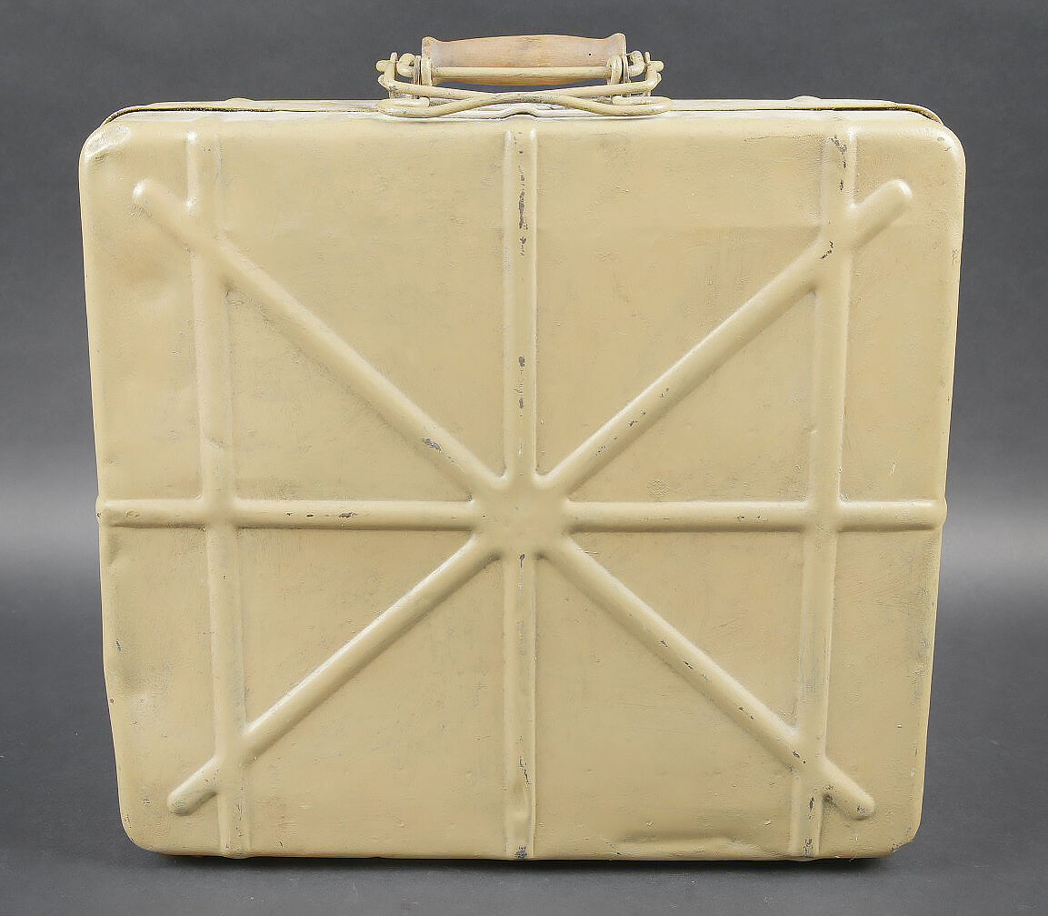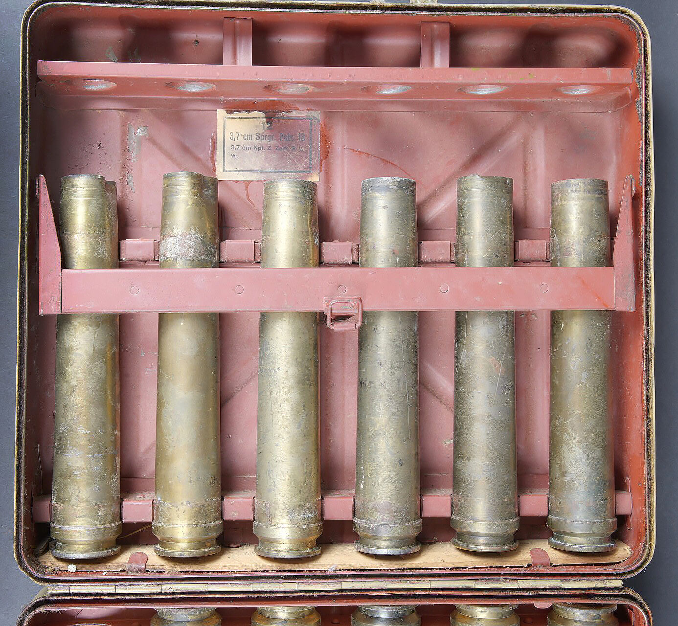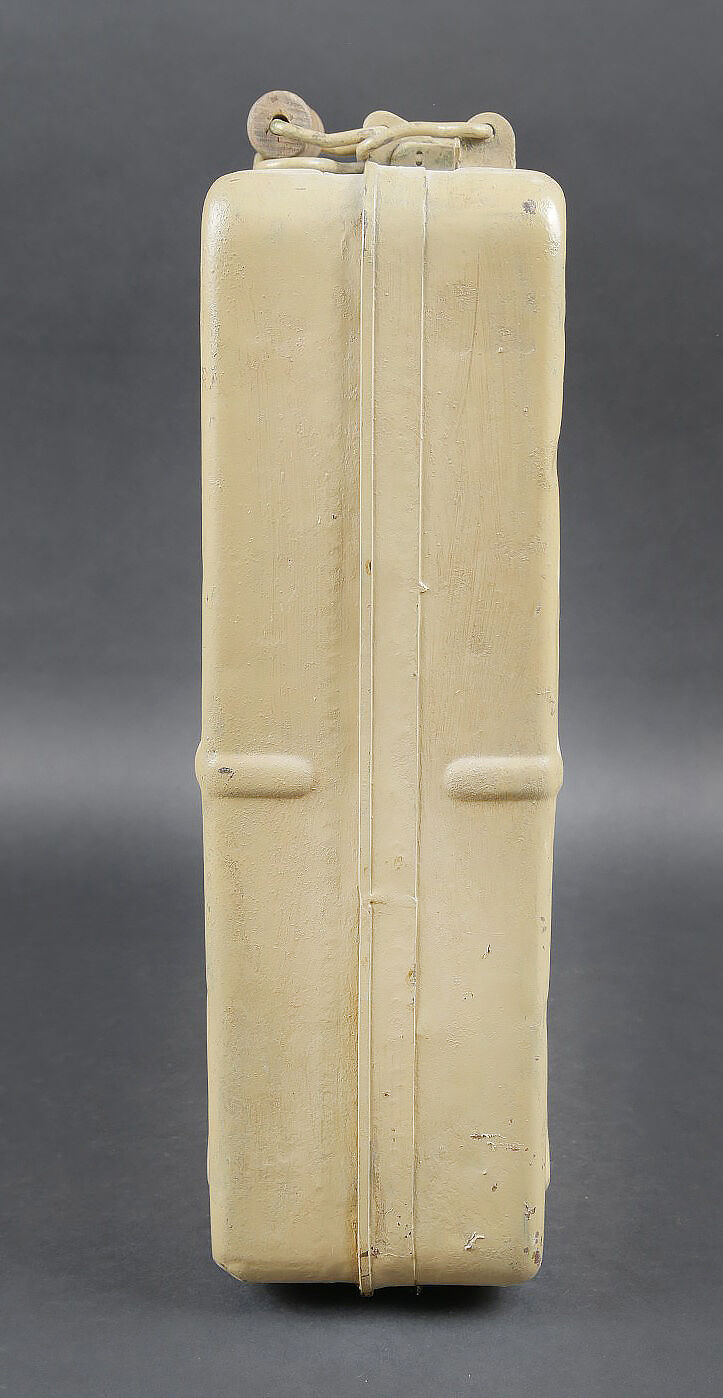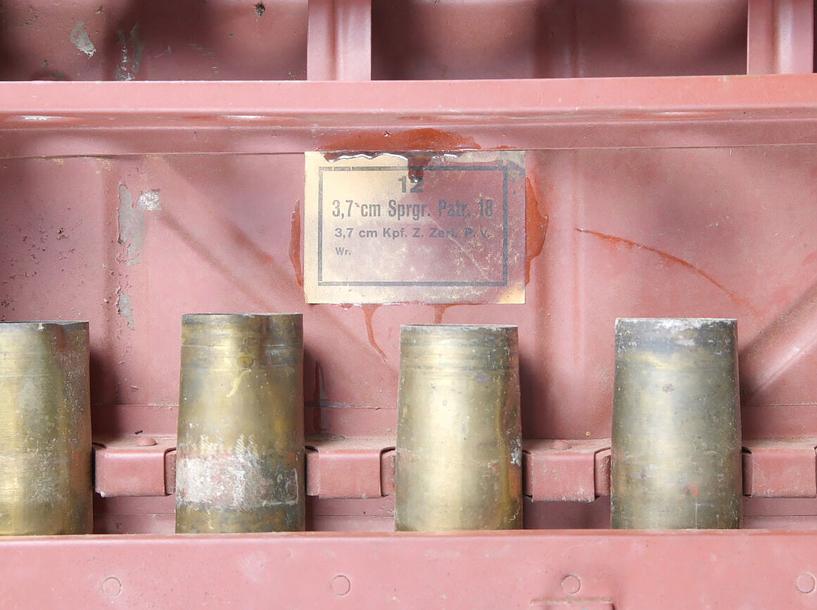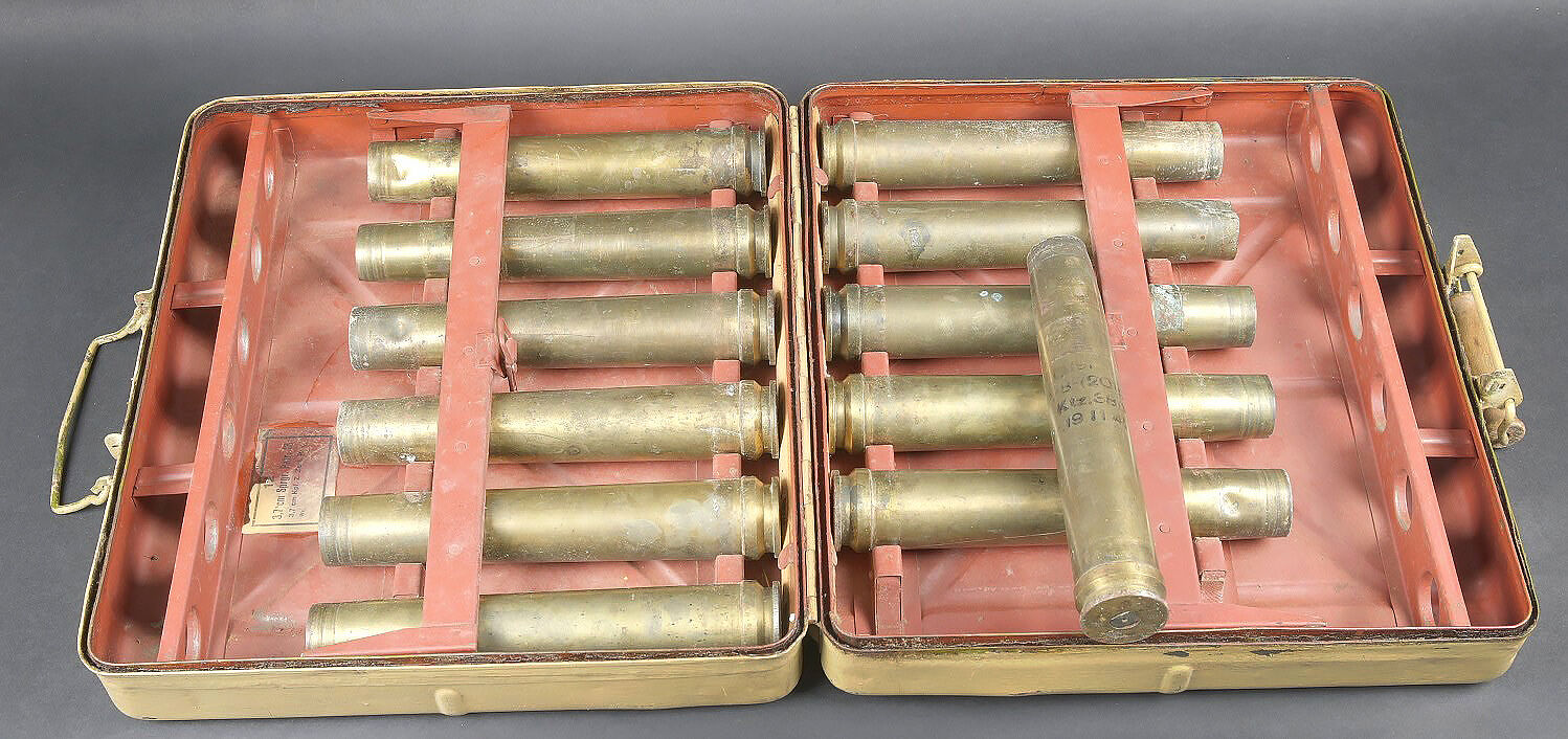 Caisse pour obus de 3,7 Sprg. Belle caisse en métal, le système de fermeture est complet. Le peinture jaune sable est postérieure. Le rack interne est présent. Reste d’étiquette marquée 12 3,7 cm Sprgr Patr 10. On y joint 10 douilles en laiton, certaines sont datées 1939,1940 et1942. Toutes les douilles sont vides et ont été tirées. Toutes les douilles disposent d’un beau marquage WAA. A noter une certaine usure et patine de la pièce. Etat II+. Crate for 3.7 cm Sprgr. ammunition Metal case with complete locking system. Sand-yellow repaint. Internal rack present. Remains of label 12 – 3.7 cm Sprgr Patr 10. Including ten fired brass cartridge cases dated 1939, 1940 and 1942, all empty with clear WaA markings. Showing normal wear and patina. Condition II+.