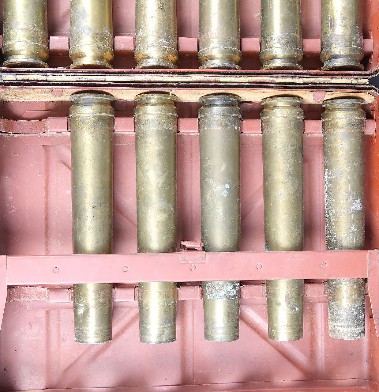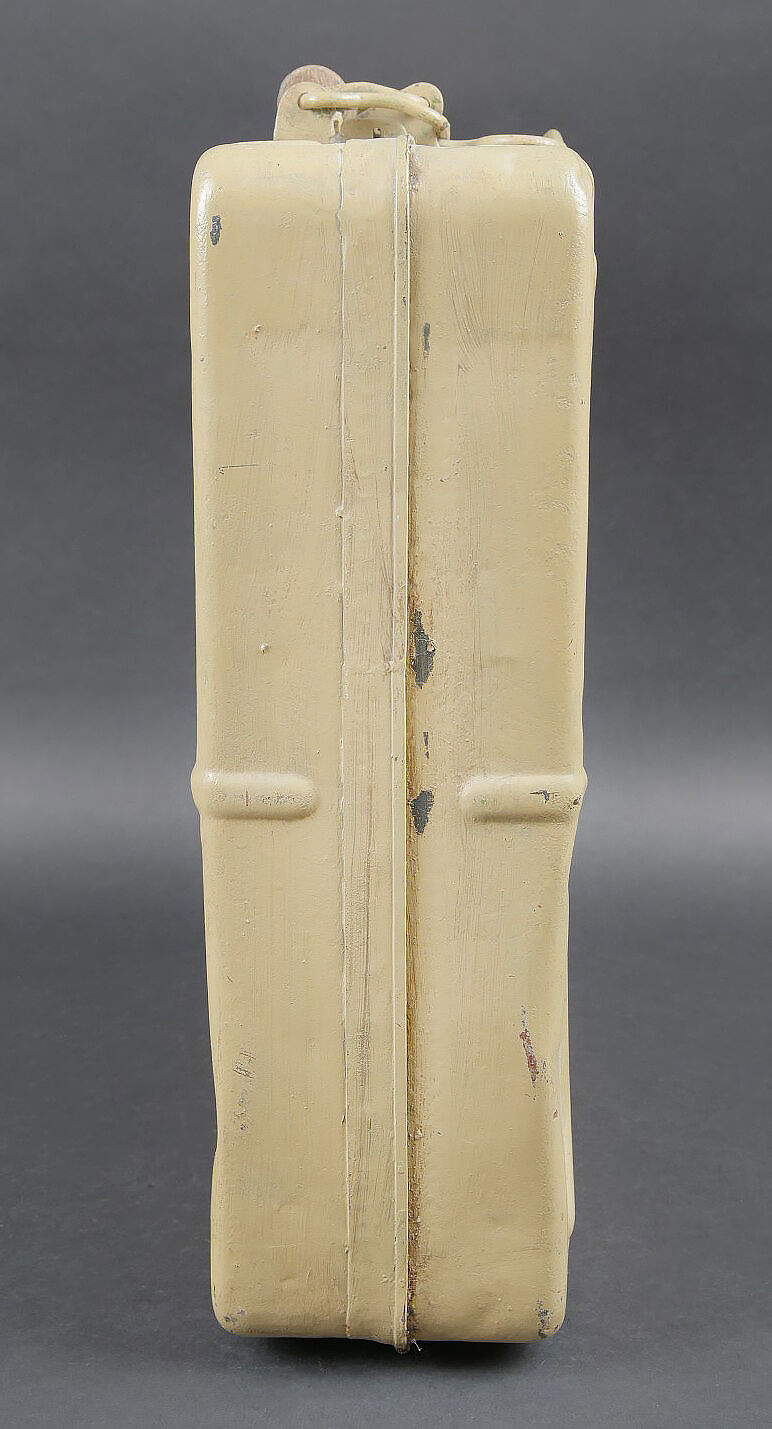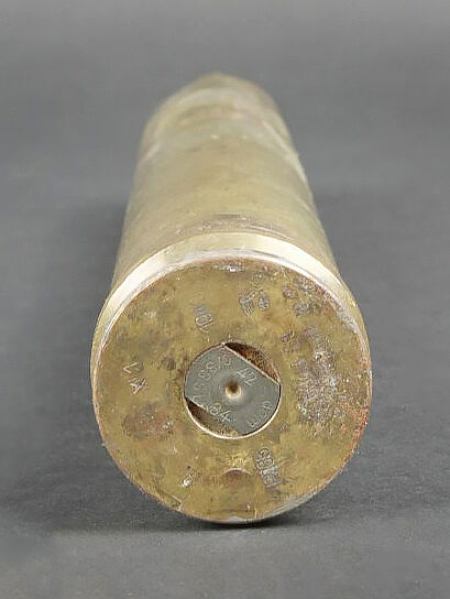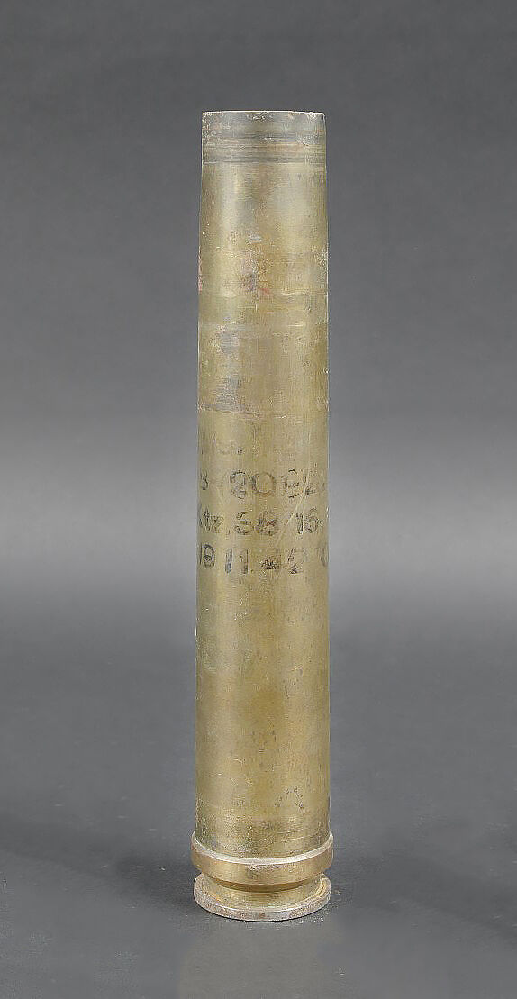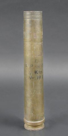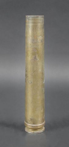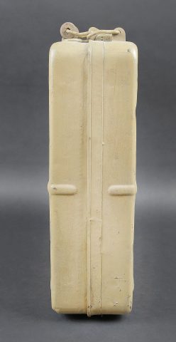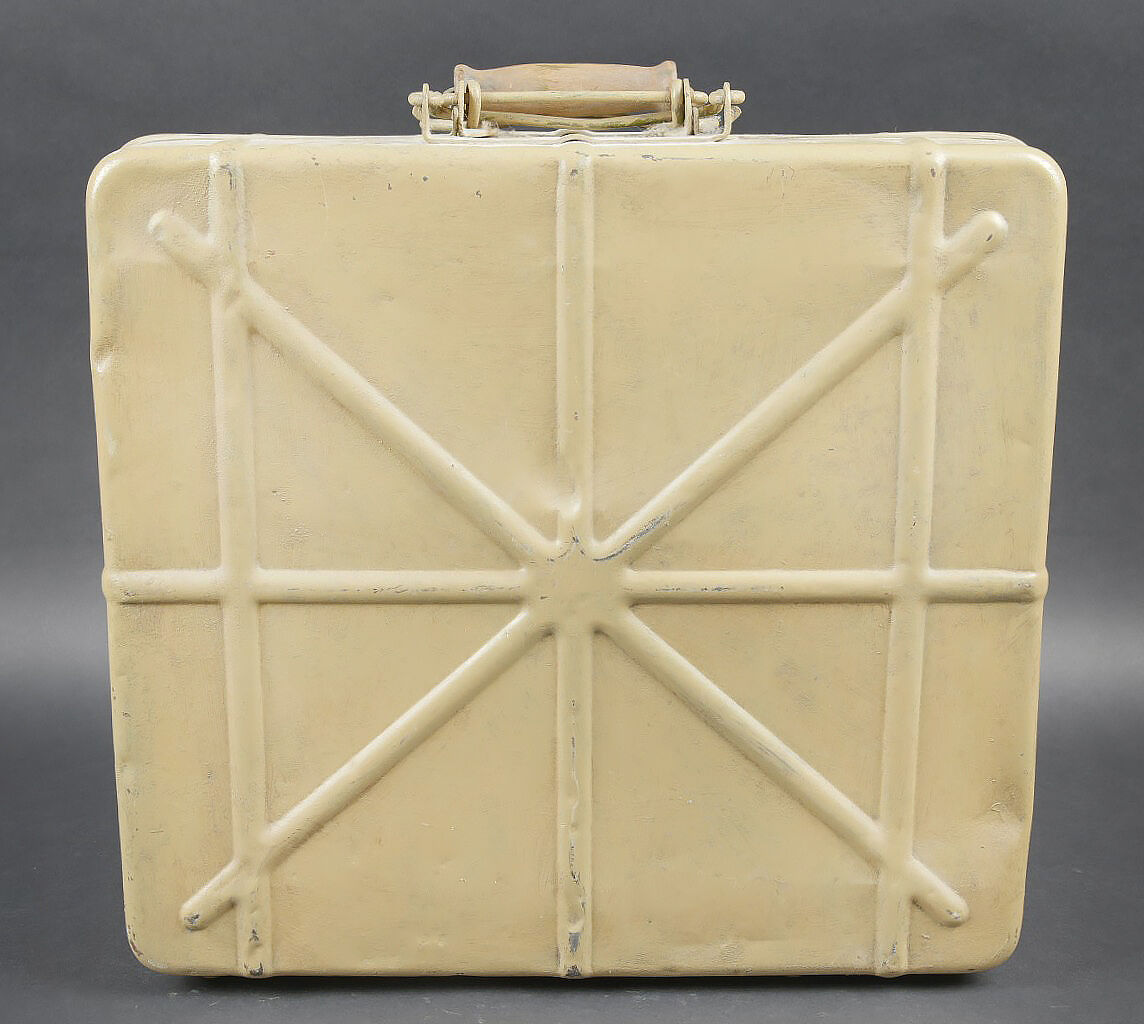 Caisse pour obus de 3,7 Sprg. Belle caisse en métal, le système de fermeture est complet. Le peinture jaune sable est postérieure. Le rack interne est présent. Reste d’étiquette marquée 12 3,7 cm Sprgr Patr 10. On y joint 10 douilles en laiton, certaines sont datées 1939,1940 et1942. Toutes les douilles sont vides et ont été tirées. Toutes les douilles disposent d’un beau marquage WAA. A noter une certaine usure et patine de la pièce. Etat II+. Crate for 3.7 cm Sprgr. ammunition Metal case with complete locking system. Sand-yellow repaint. Internal rack present. Remains of label 12 – 3.7 cm Sprgr Patr 10. Including ten fired brass cartridge cases dated 1939, 1940 and 1942, all empty with clear WaA markings. Showing normal wear and patina. Condition II+.