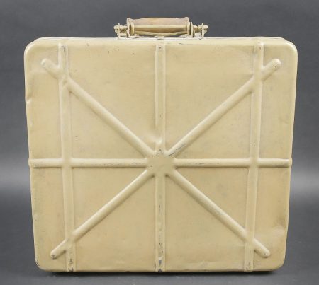 Caisse pour obus de 3,7 Sprg. Belle caisse en métal, le système de fermeture est complet. Le peinture jaune sable est postérieure. Le rack interne est présent. Reste d’étiquette... en savoir plus