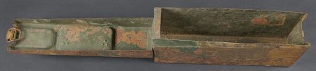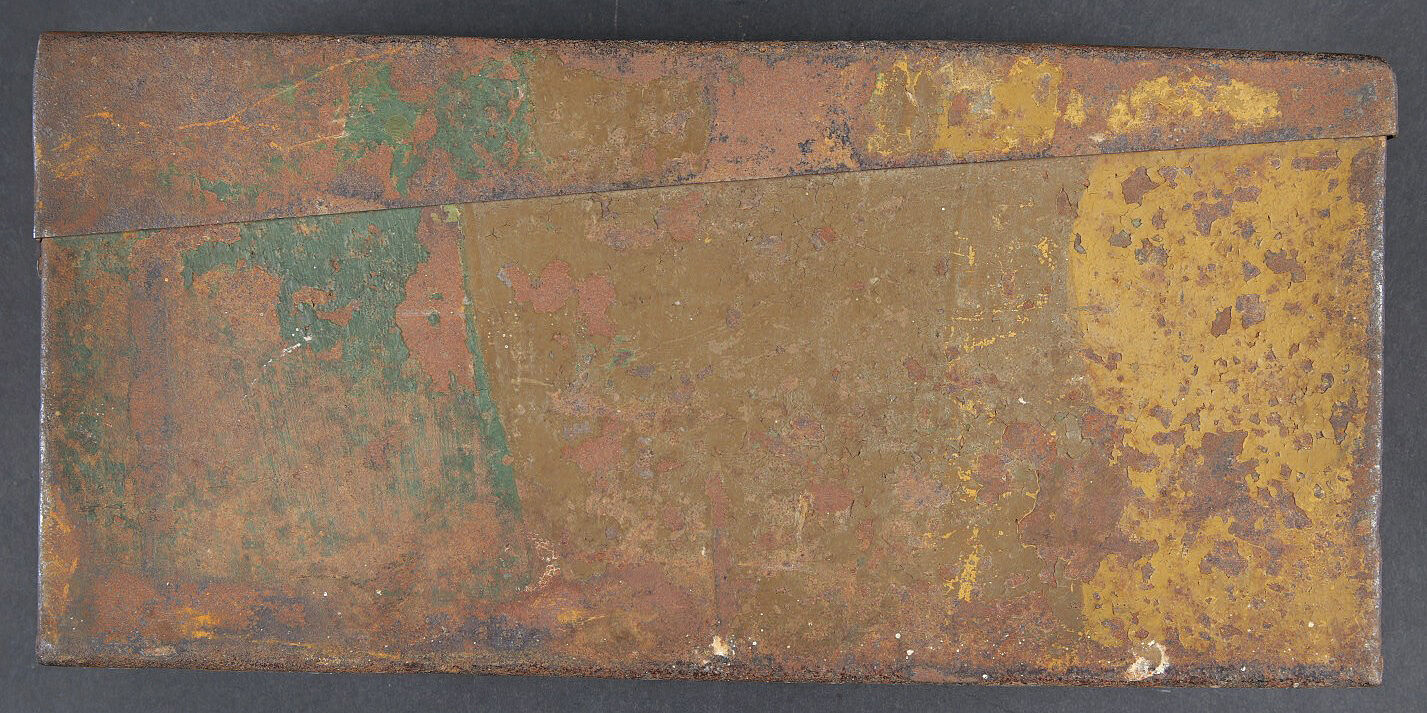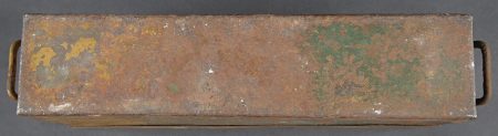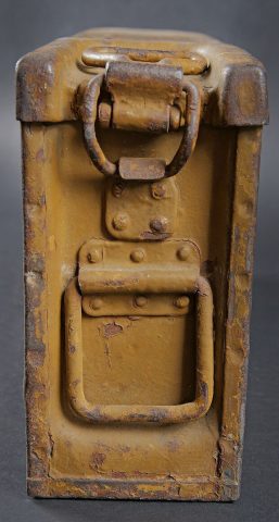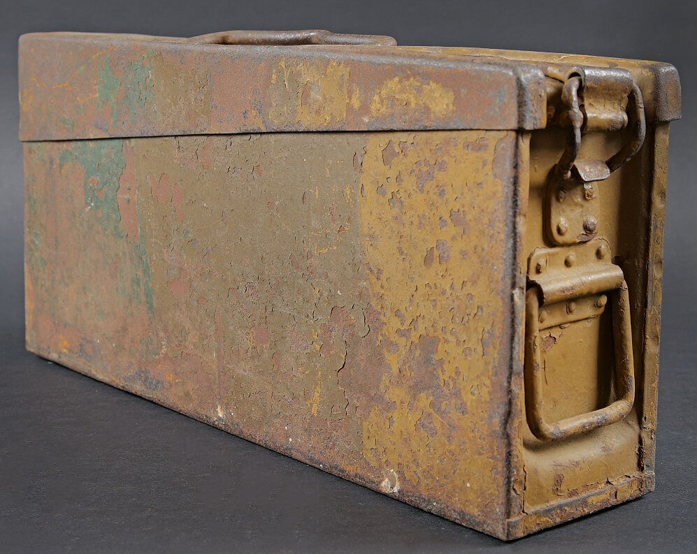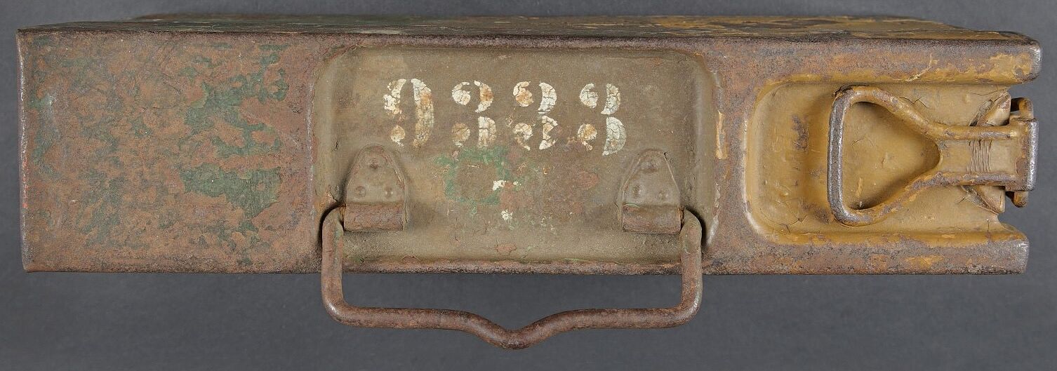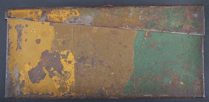 Caisse MG 34/42 camouflé. En métal. Le crochet de fermeture est présent. La poignée de transport est présente. Peinture camouflé trois tons à. 40%. Couvercle portant le numéro 9333, peint au pochoir et à la peinture blanche. A noter une certaine usure et oxydation de la pièce. Etat II+. Camouflaged MG 34/42 ammunition case. Metal construction. Closing latch present. Carrying handle present. Three-tone camouflage paint 40% preserved. Lid stencilled and hand-painted in white with number 9333. Notable wear and oxidation. Condition II+.