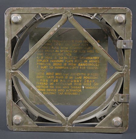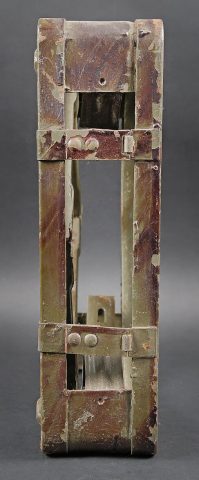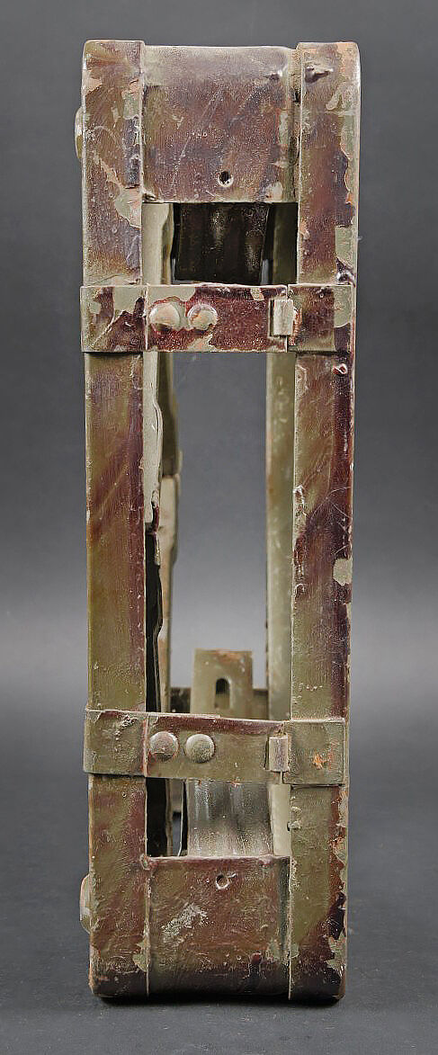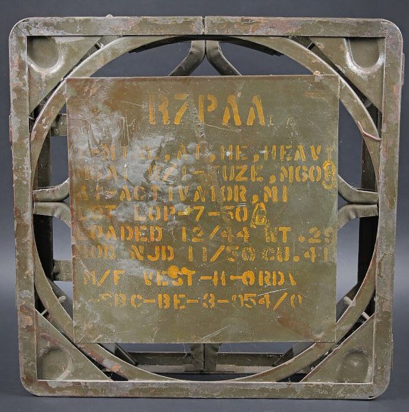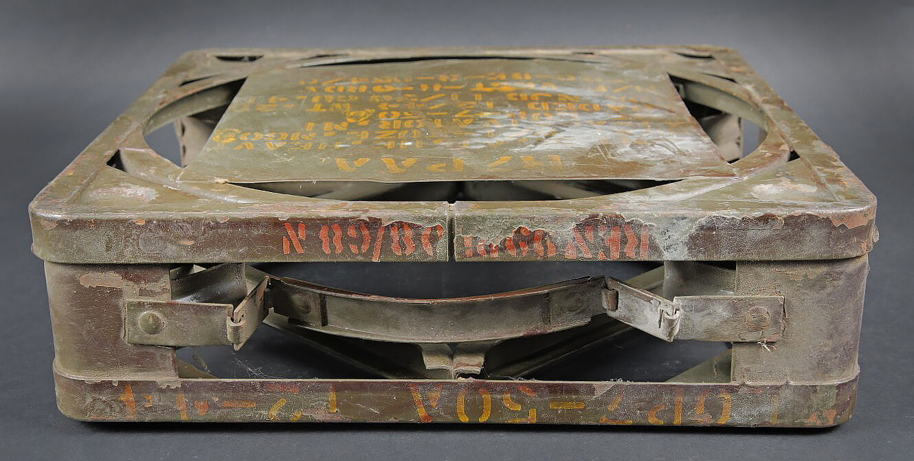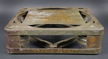 Caisse pour mine US. En métal ajouré. La poignée de transport est présente. Les crochets de fermeture sont complets. Marquages R7PAA T mine A1 HE Heavy, datée du mois de décembre 1944. Peinture OD à 60%. A noter une certaine usure et patine de la pièce. Etat II+. US mine crate Openwork metal construction with carrying handle present and complete closing hooks. Marked T Mine A1 HE Heavy R7PAA, dated December 1944. OD paint 60% preserved. Note some wear and patina to the piece. Condition II+.