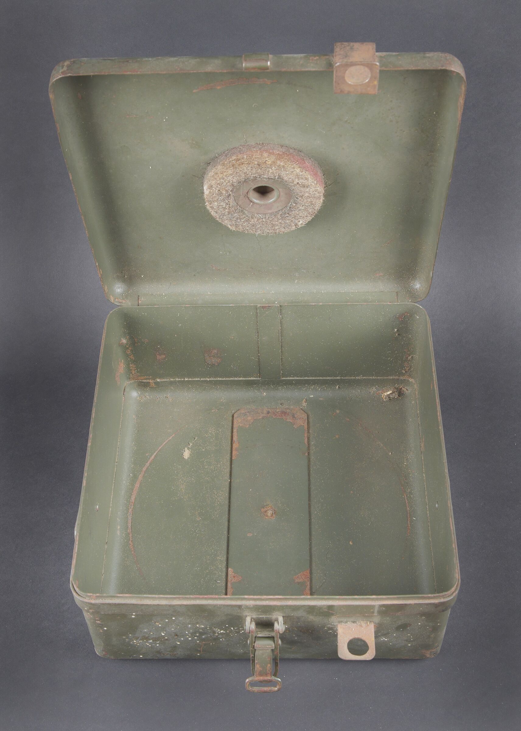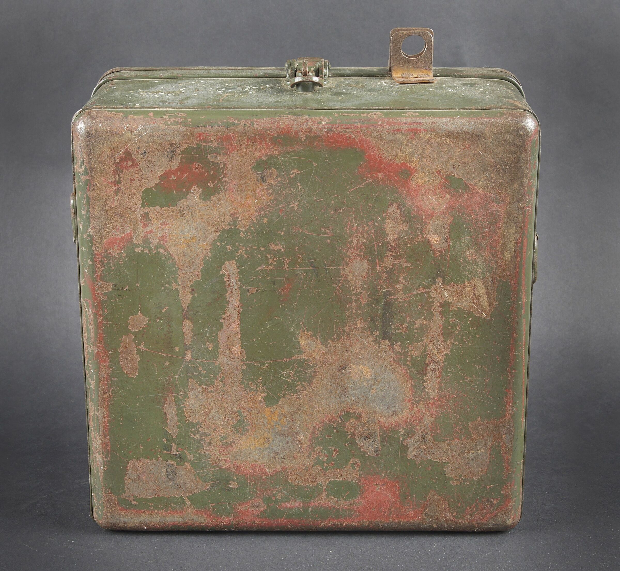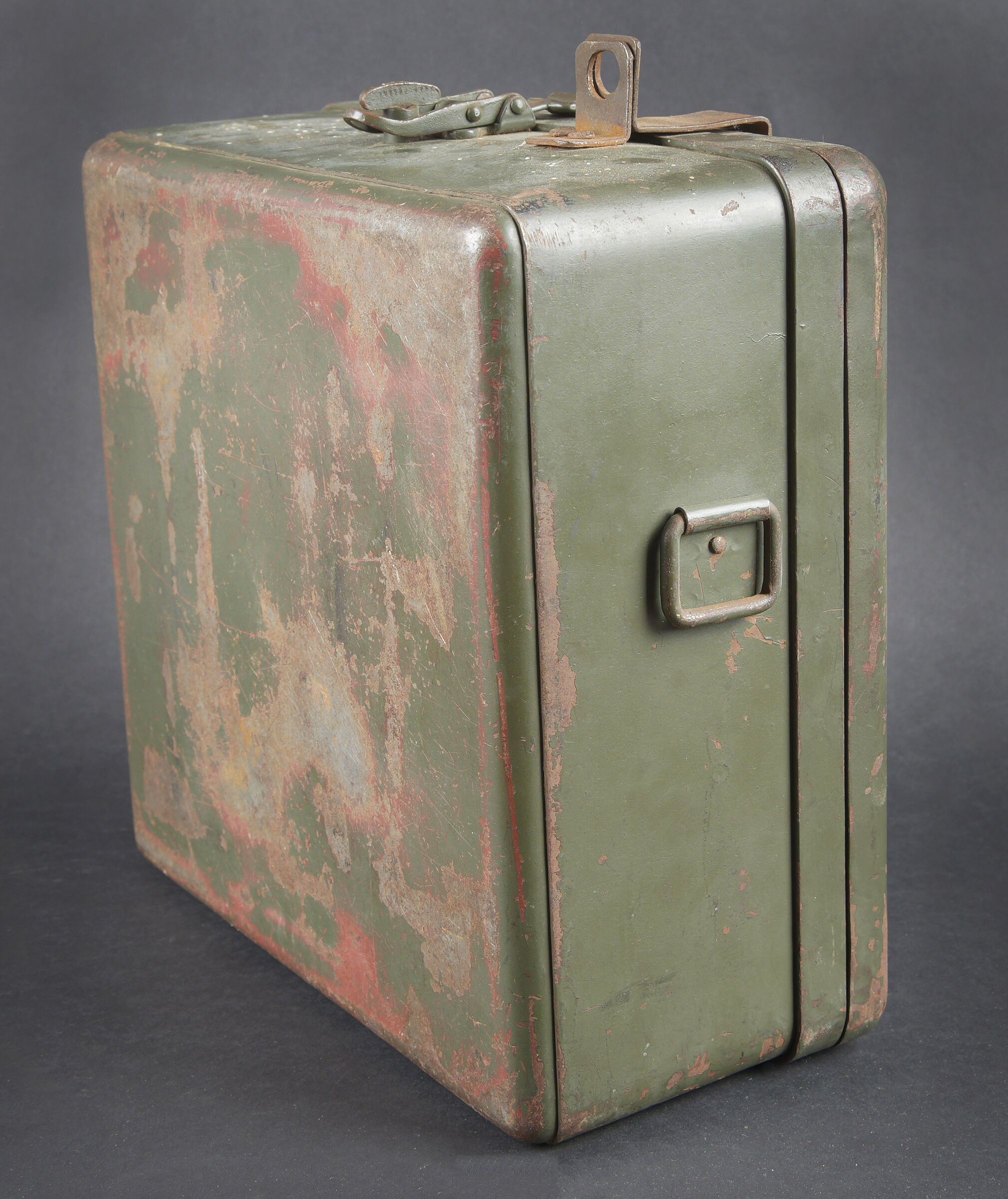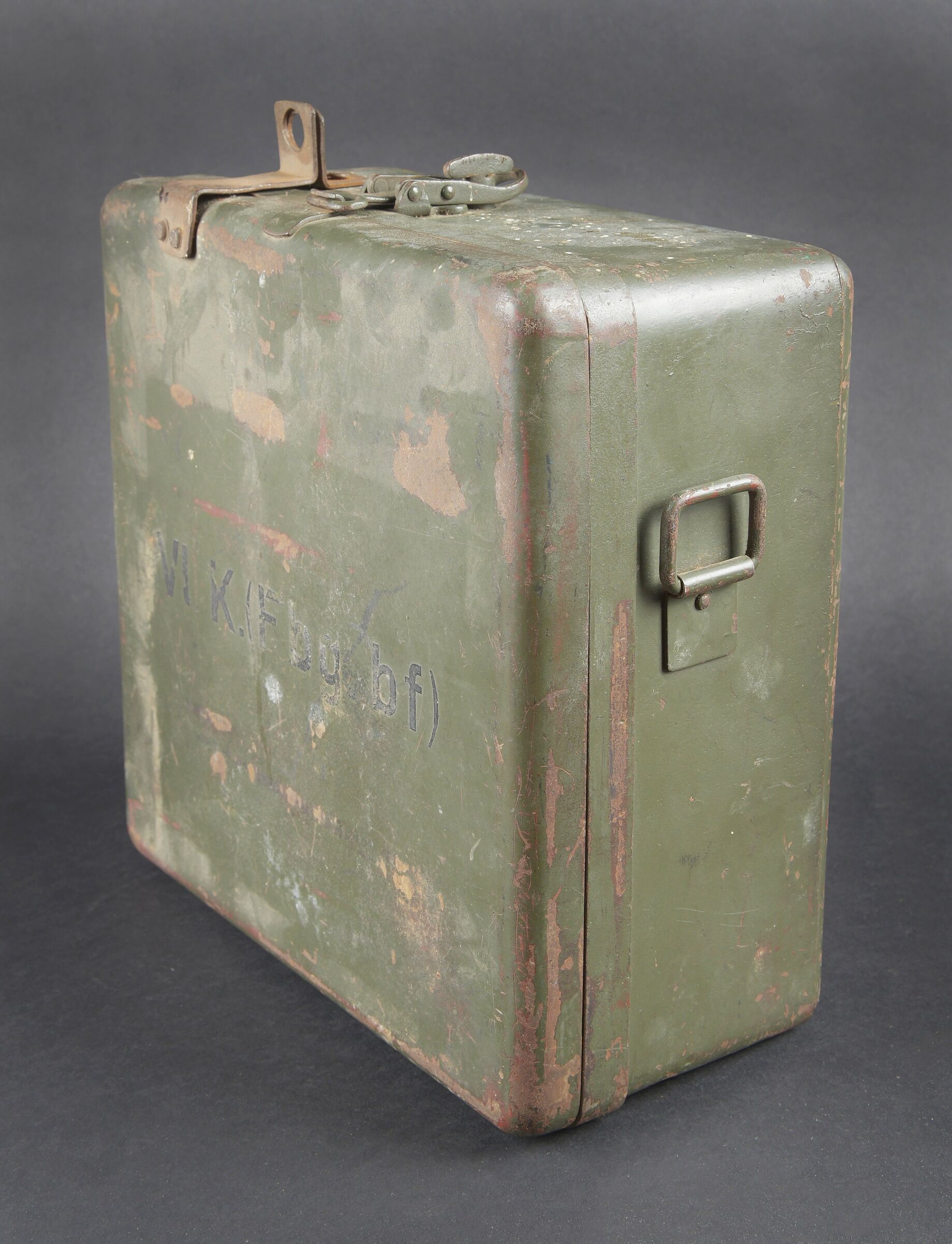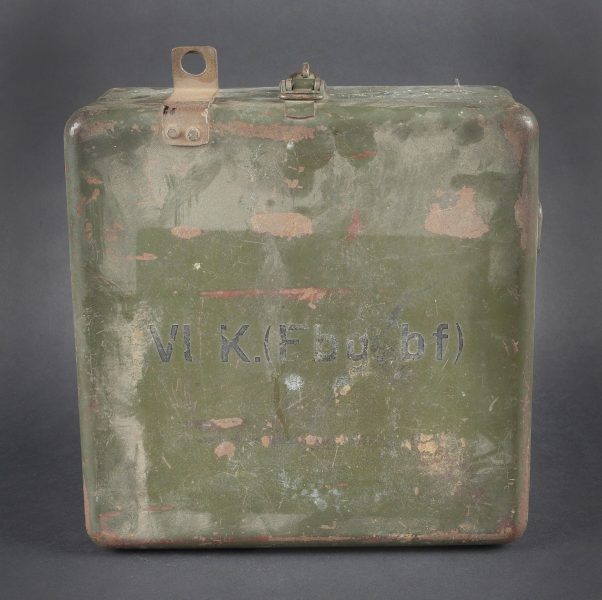Caisse radio allemande. En métal. Le crochet de fermeture est fonctionnel. Peinture Feldgrau à 70%. Marquages VI K FBG BF. Vide. A noter une certaine usure et patine de la pièce. Etat II+. German radio transport case Metal Functional closure hook 70 % Feldgrau paint Marked VI K FBG BF Empty Noticeable wear and patina Condition II+
