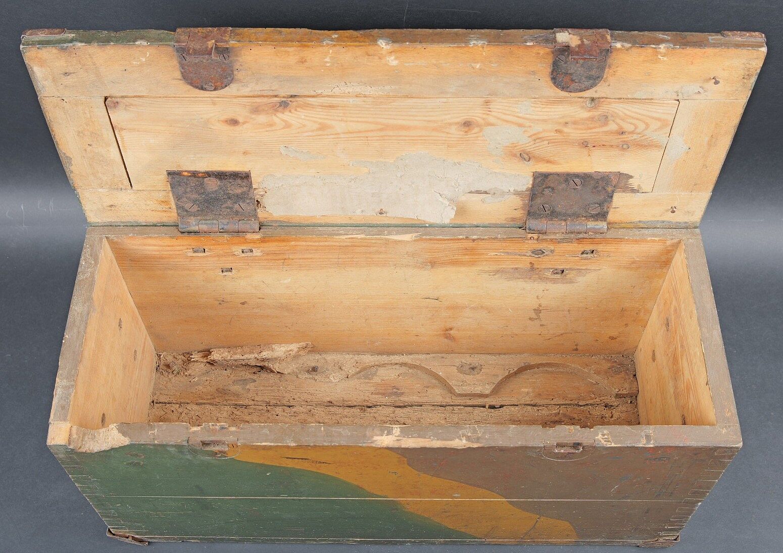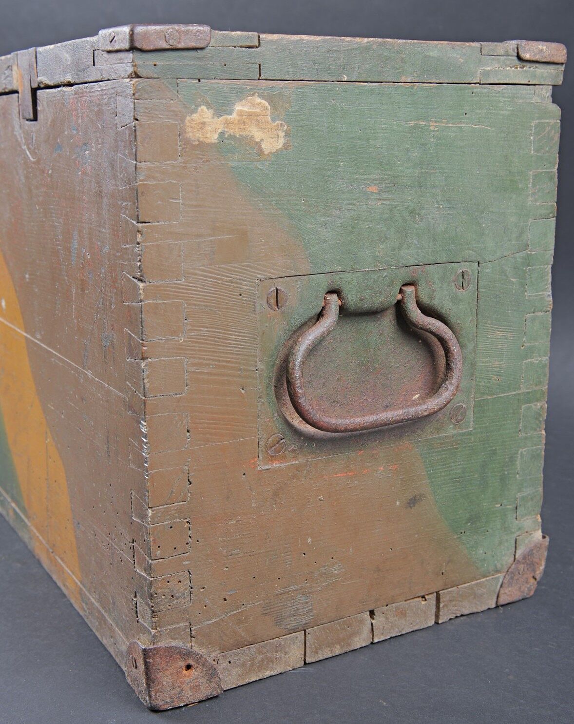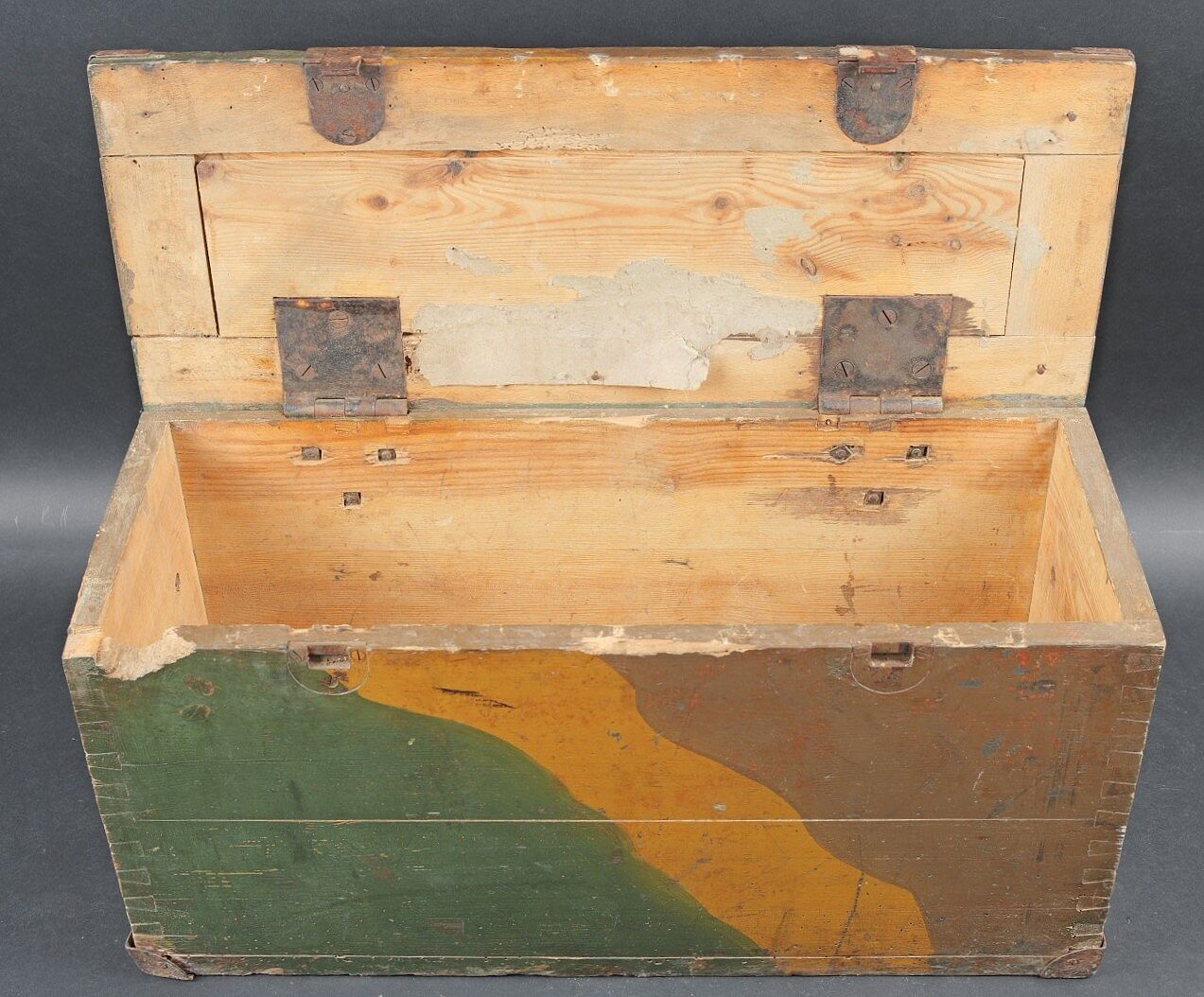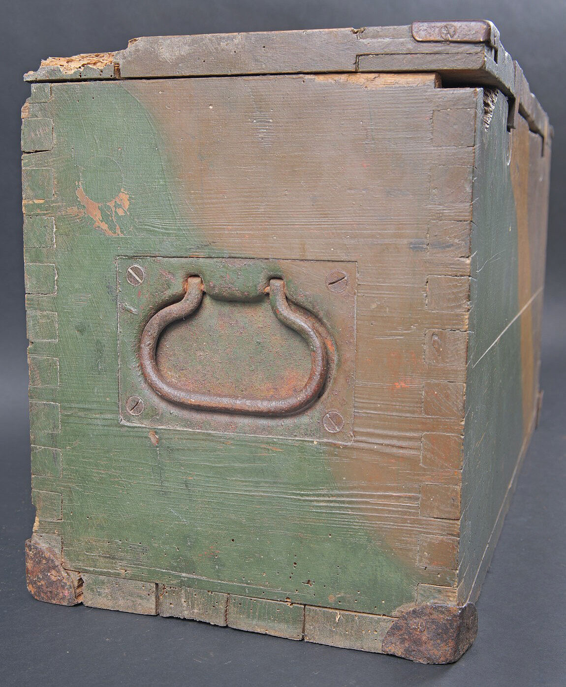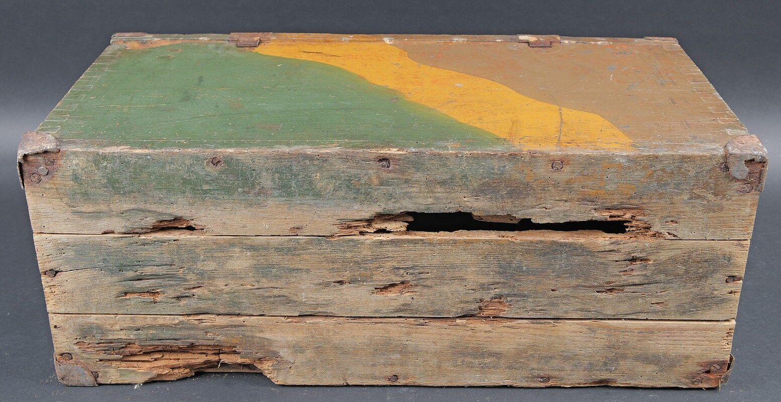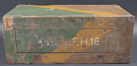 Caisse camouflé SFH18 camouflé. En bois. Peinture camouflé d’usine à 70%. Les poignées de transport sont présentes. Couvercle fortement abimé et partiellement désolidarisé du reste de la caisse. Marquages SFH 18 à la peinture blanche. Fond de la caisse également fortement abîmé avec des manques. Les rack interne sont présents. Etiquette interne absente. A noter une certaine usure et patine de la pièce. Etat II-. Camouflaged s.F.H.18 crate Wooden crate with factory-applied camouflage paint preserved to 70%. Carrying handles present. Lid heavily damaged and partially detached from the body. White stencilled marking s.F.H.18. Base of the crate also heavily damaged with losses. Internal racks present. Internal label missing. Showing normal wear and patina. Condition II-.