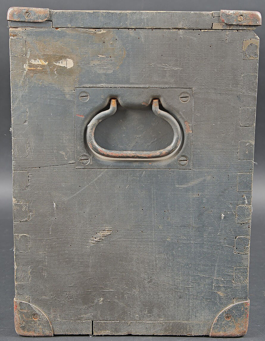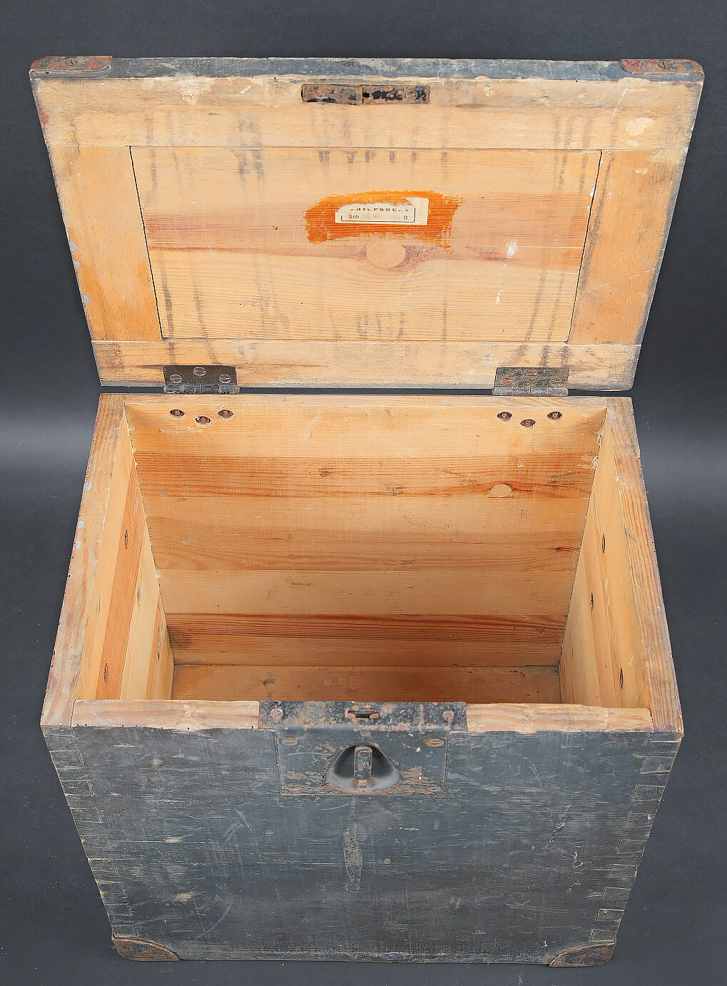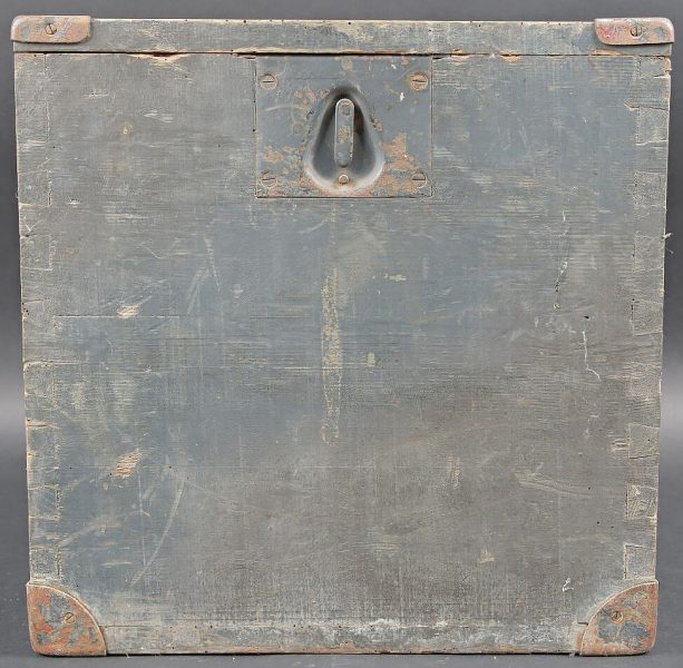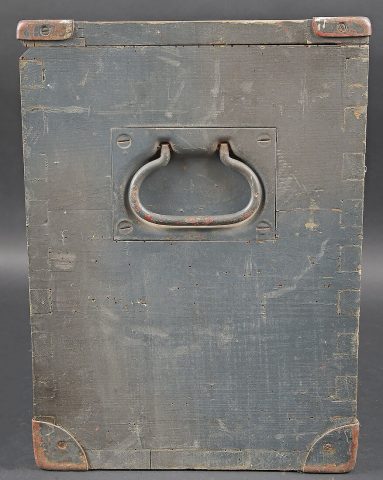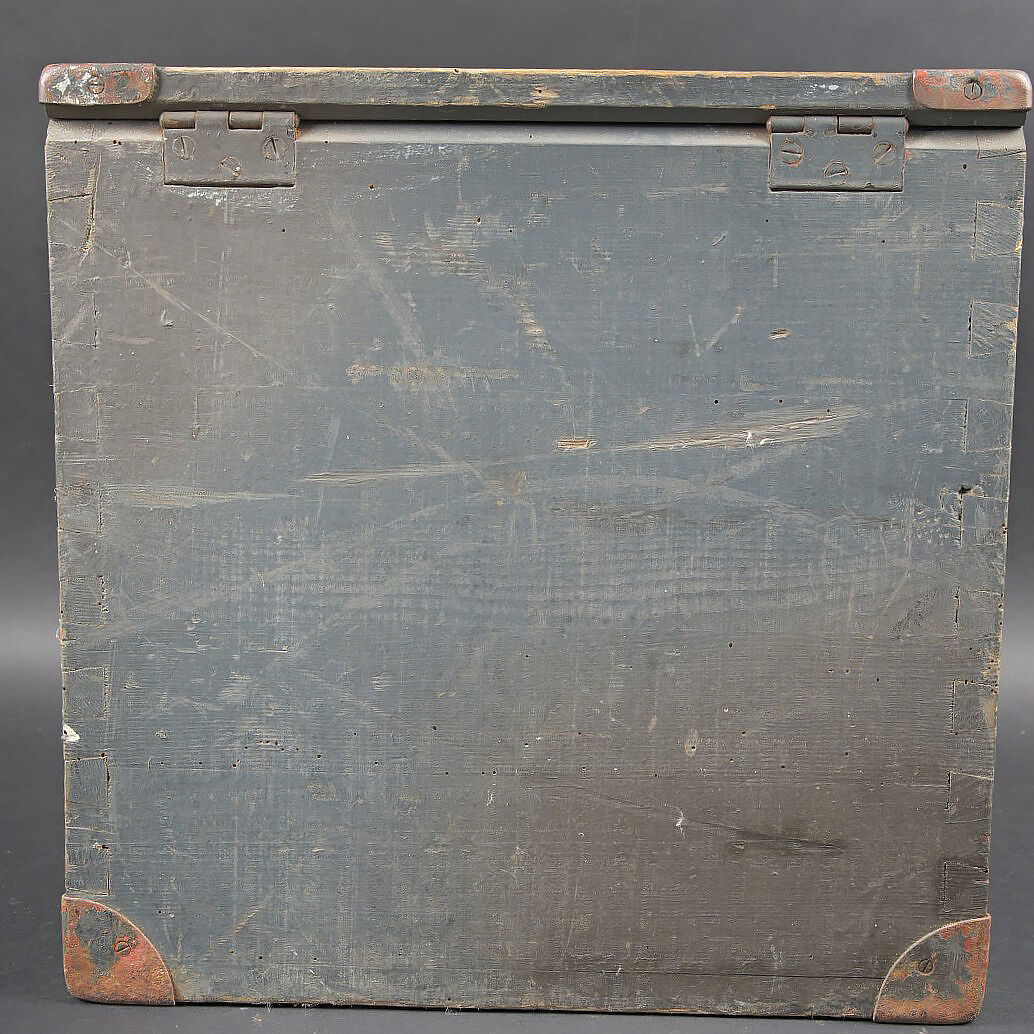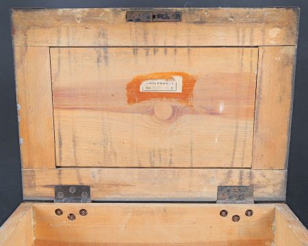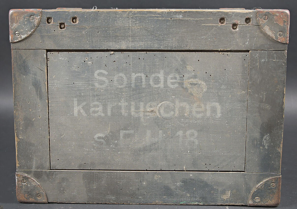 Caisse Sonder Kartuschen S FH 18. En bois avec renfort en métal. Peinture Feldgrau à 70%. Couvercle marqué Sonder Kartuschen S FH 18. Les poignées de transport sont présentes, ainsi que le crochet de fermeture. Reste d’étiquette datée mars 1943. Les racks interne sont absents. A noter une certaine usure et patine de la pièce. Etat II+. Crate for Sonderkartuschen s.F.H.18 Wooden crate with metal reinforcements. Feldgrau paint 70%. Lid stencilled Sonderkartuschen s.F.H.18. Carrying handles and hook closure present. Remains of a label dated March 1943. Internal racks missing. Showing normal wear and patina. Condition II+.