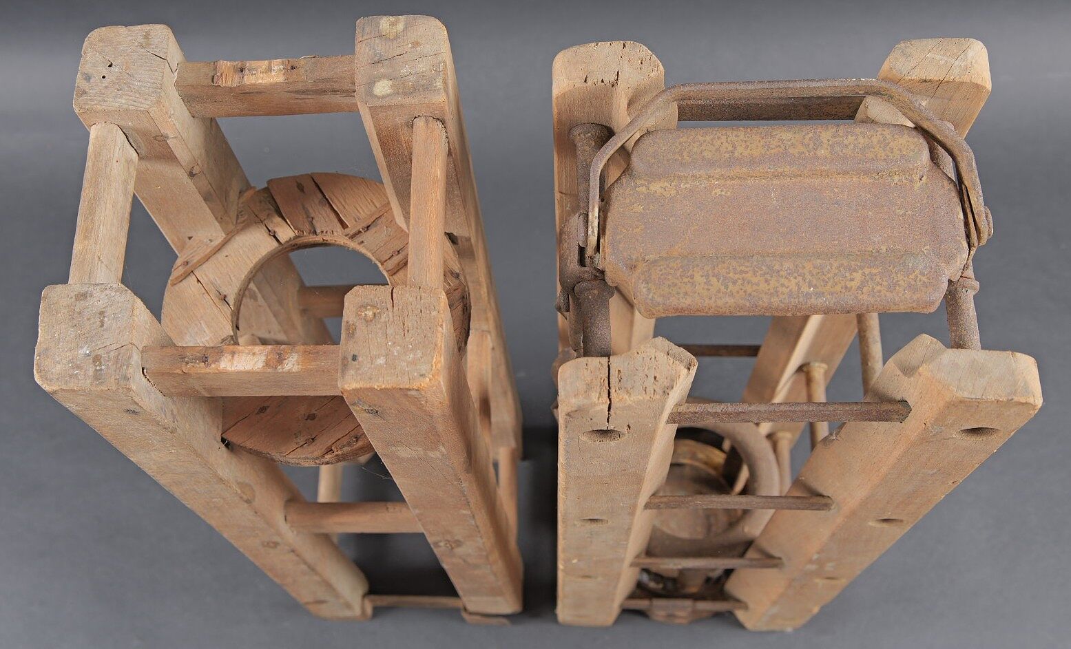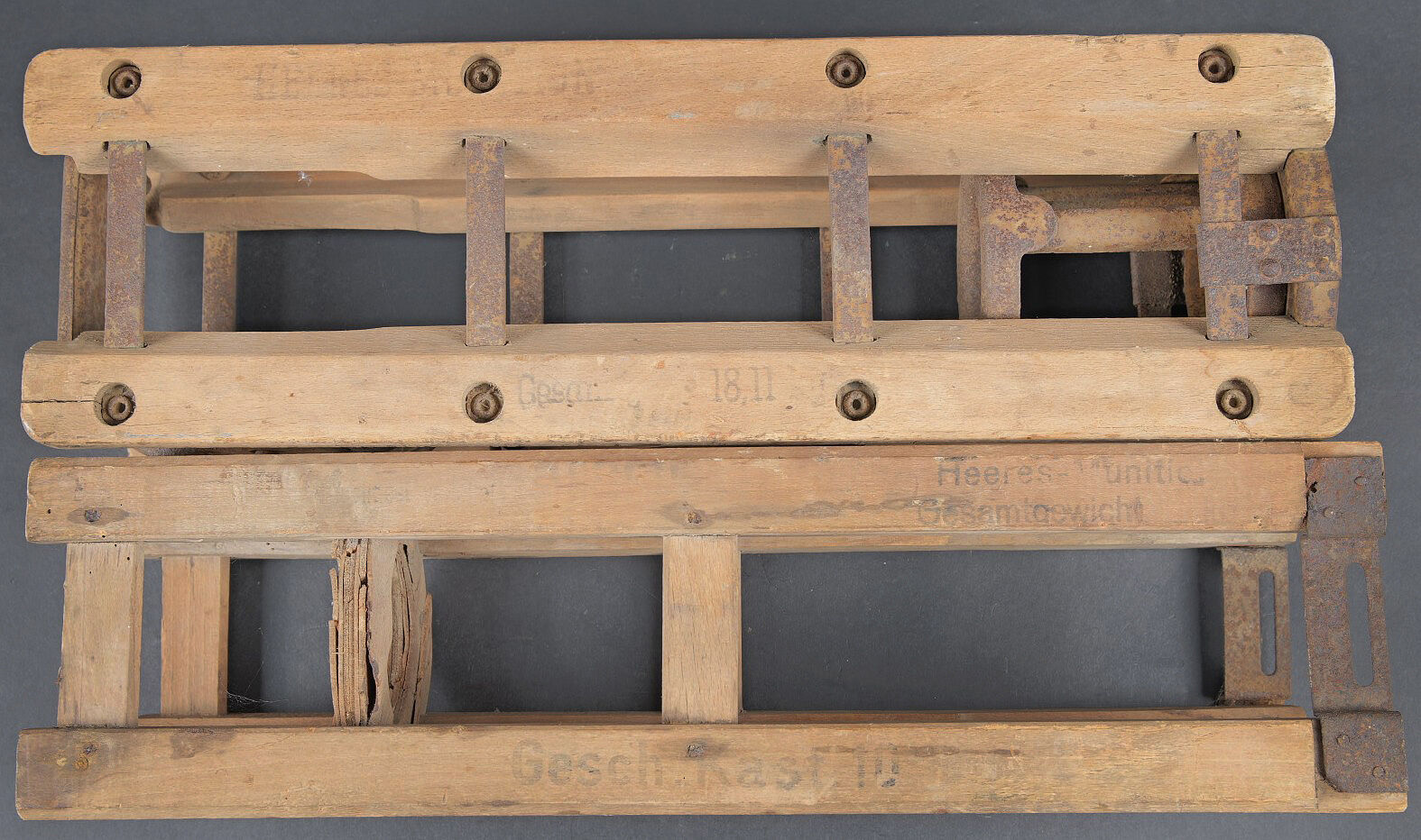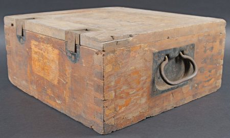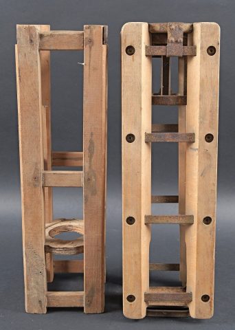 Caisses à munition. Comprenant une caisse en bois, avec compartiment étanche, sans marquages visibles, les crochets de fermeture sont présents, les poignées de transport sont fonctionnelles. Deux claies de portage pour obus de 10 cm en bois. Sans marquages visibles. Certaines parties sont manquantes. A noter une certaine usure et patine des pièces. Etat II+. Ammunition crates Comprising a wooden crate with airtight inner compartment, no visible markings, locking hooks present and carrying handles functional. Together with two wooden carrying frames for 10 cm shells, unmarked and partially incomplete. Showing normal wear and patina. Condition II+.