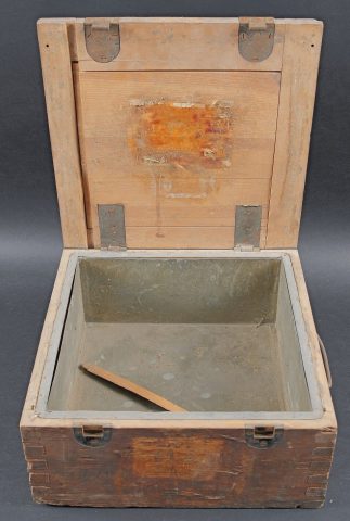 Détails de la vente >Caisses à munition. Comprenant une caisse en bois, avec compartiment étanche, sans marquages visibles, les crochets de fermeture sont présents, les poignées de transport sont fonctionnelles.... en savoir plus