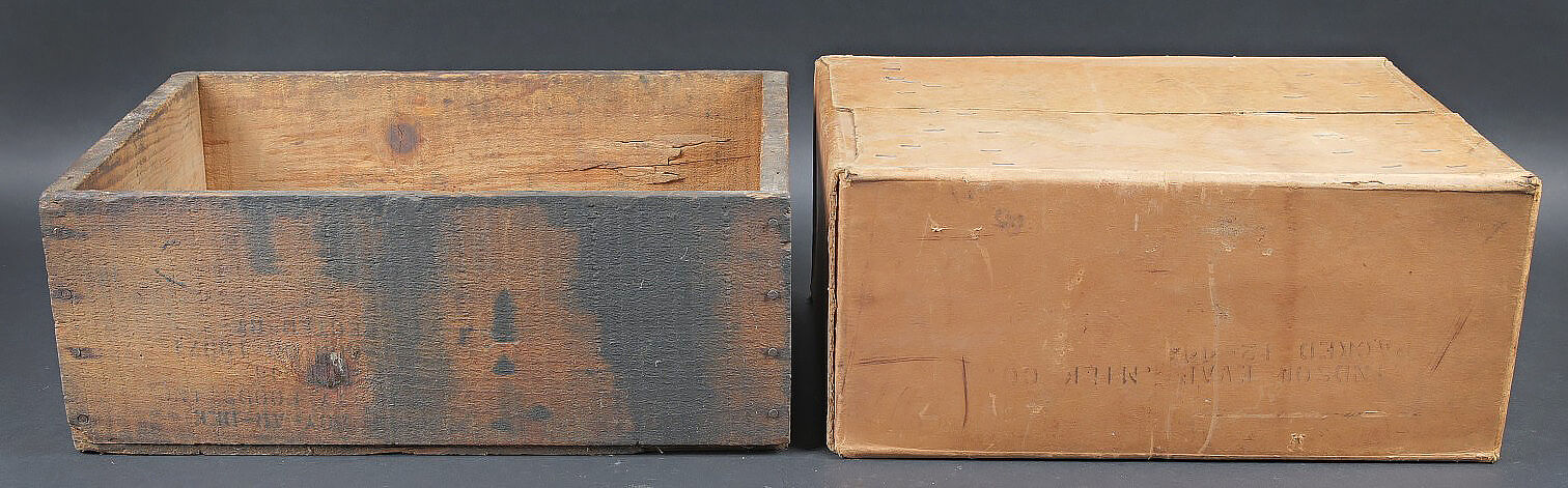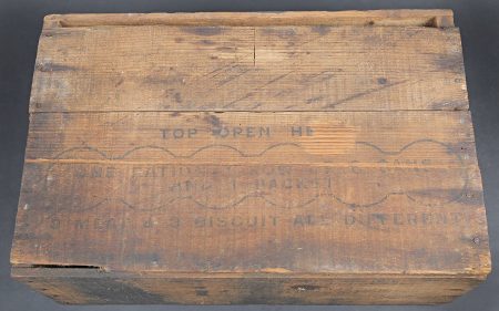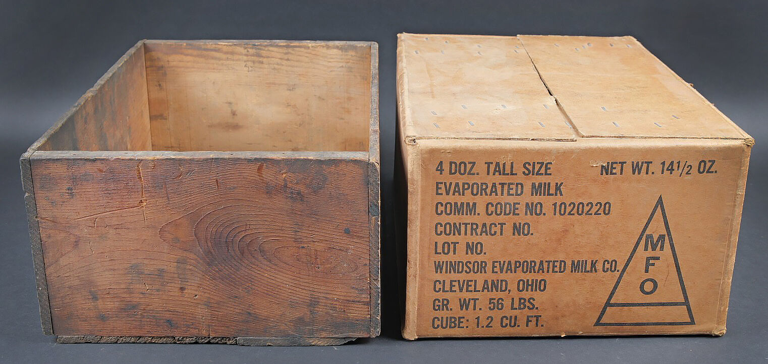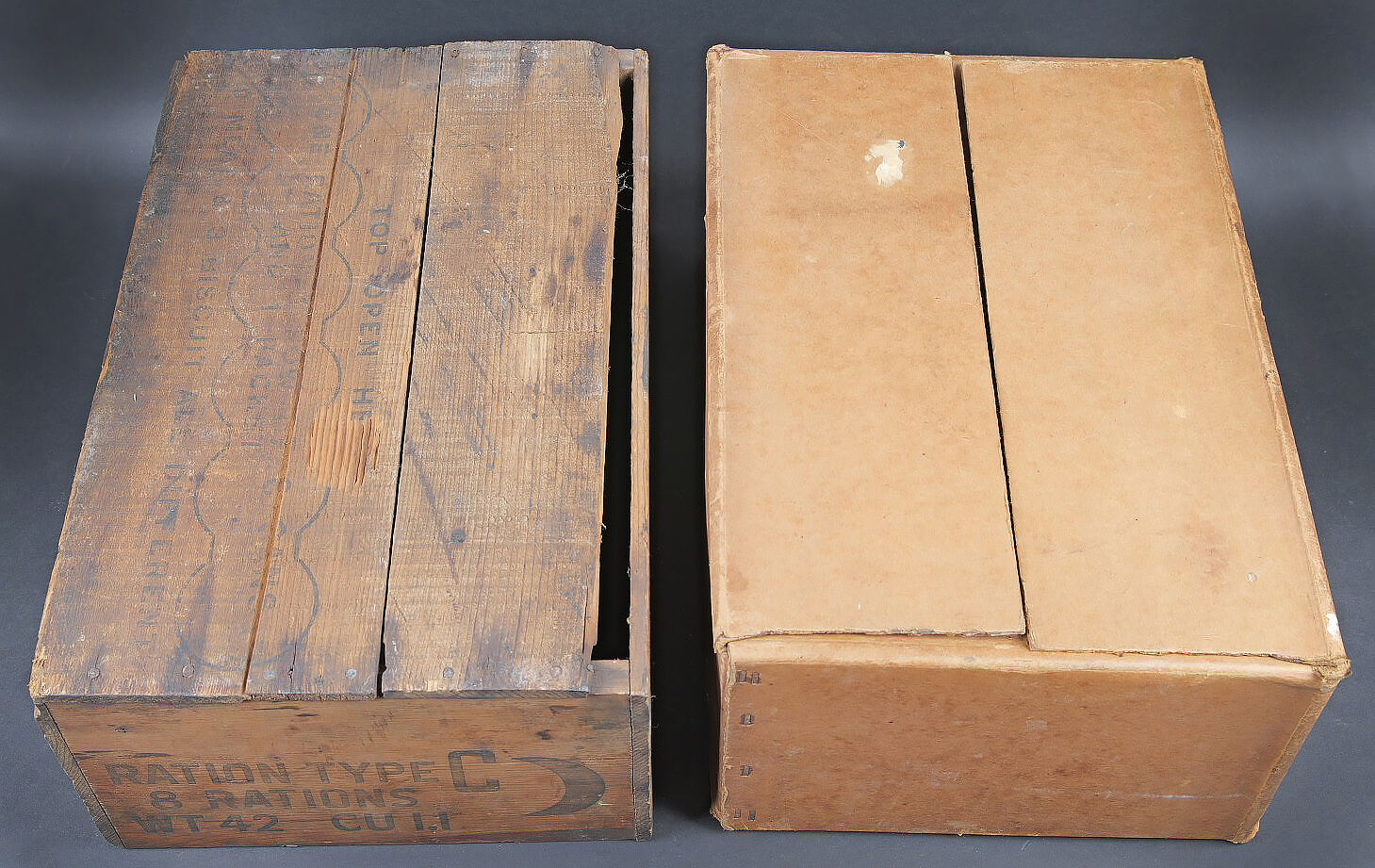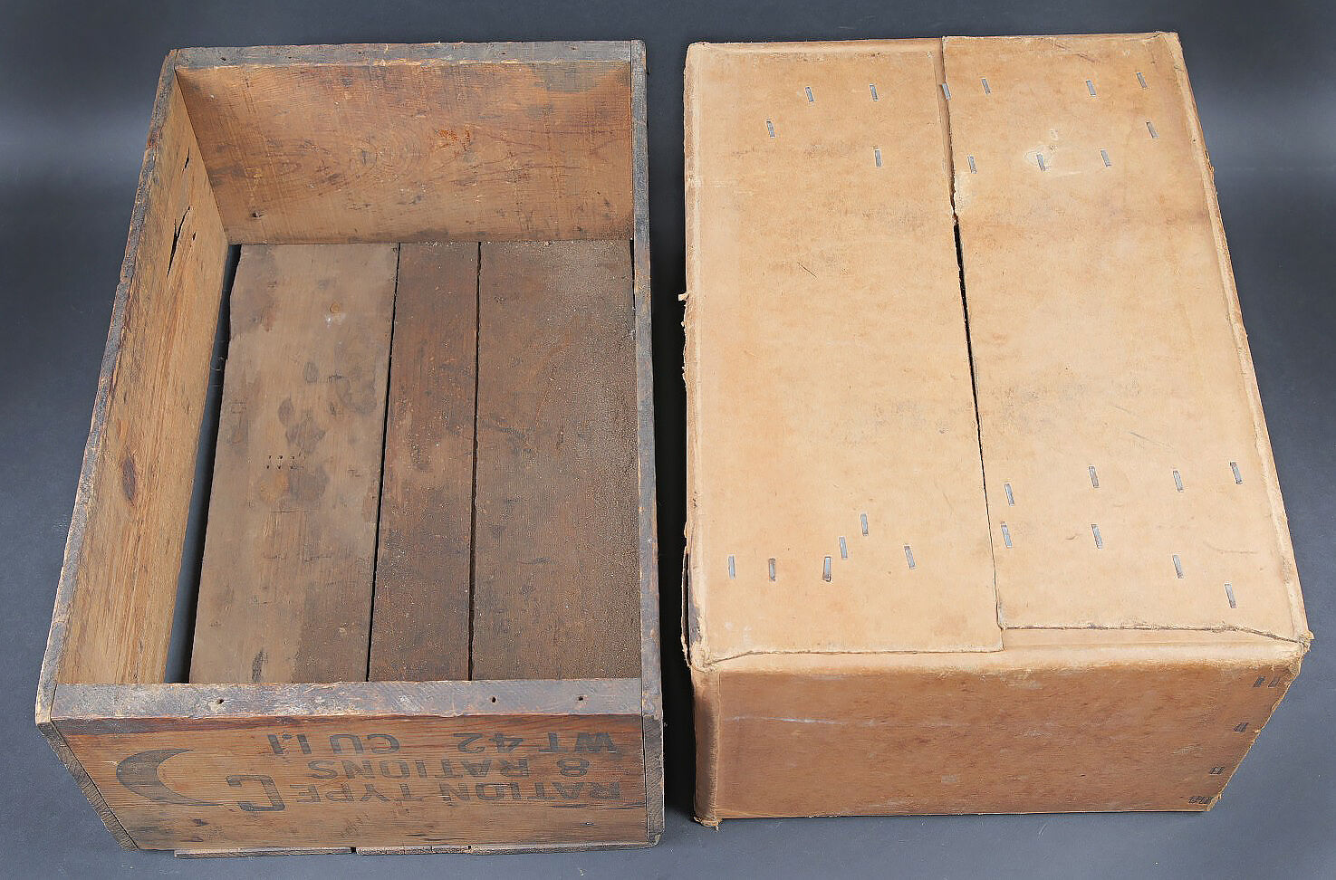 Caisses de ration US. Comprenant une caisse en carton, ouverte, mais toutes les parties sont présentes. Evorated Milk, fabrication Windsor Evaporated Milk co, datée du mois de décembre 1944. Une caisse en bois, ouverte, le couvercle est manquant. Marquée Ration Type C 8 rations. Date illisible. A noter une certaine usure et patine de la pièce. Etat II+. US ration crates Comprising one open cardboard crate with all components present marked Evaporated Milk, Windsor Evaporated Milk Co., December 1944. One open wooden crate with missing lid marked Ration Type C 8 Rations, date illegible. Note some wear and patina to the pieces. Condition II+.