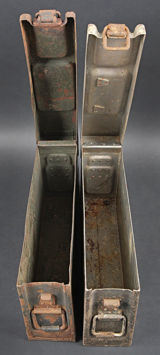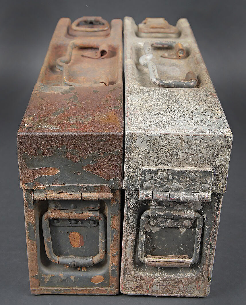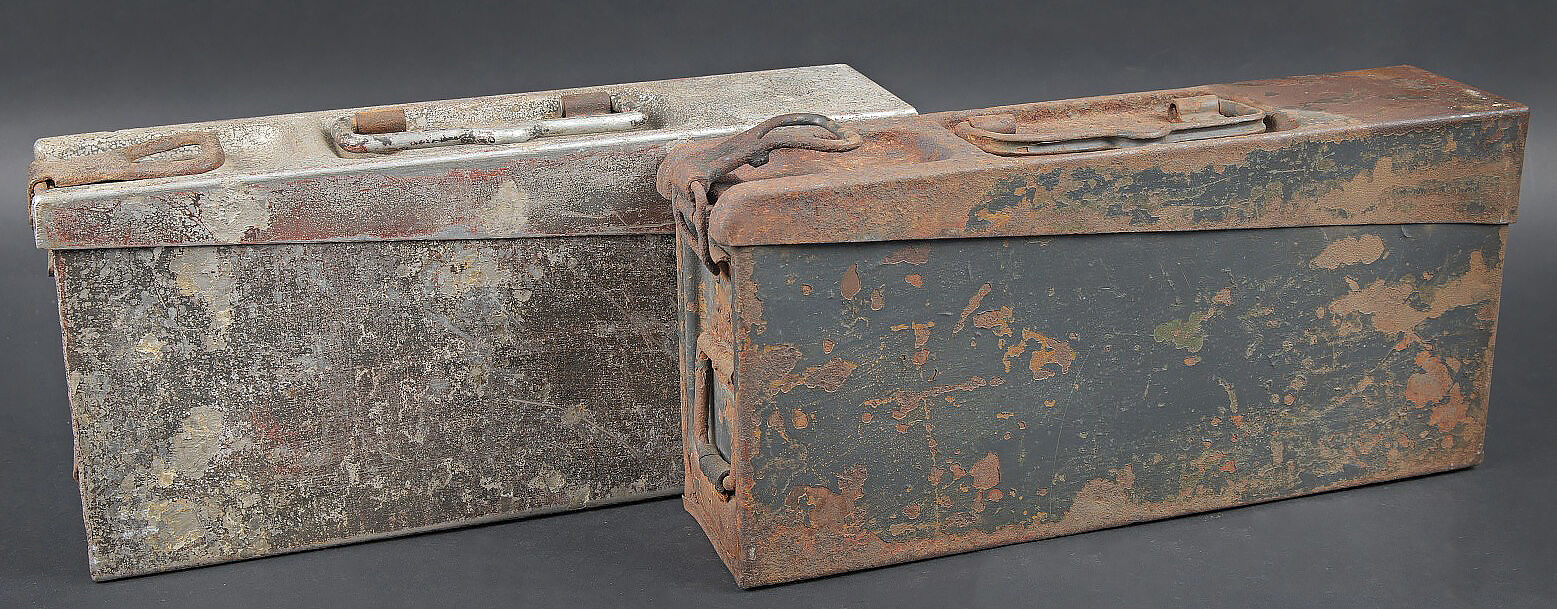 Caisses MG 34/42. Comprenant une caisse Patronenkasten 15 en métal, peinture Feldgrau à 30%, fermeture et poignée de transport présents. Une caisse à munition Patronenkaste 1941, en aluminium, quasiment dépourvue de peinture. La poignée de transport est présente. Les crochets de fermeture sont fonctionnels. Fabrication 1939. A noter une certaine usure et patine des pièces. Etat II+. MG 34/42 ammunition cases. Set consisting of one Patronenkasten 15 metal case, Feldgrau paint 30% preserved, closure and carrying handle present; and one Patronenkasten model 1941 in aluminium, almost devoid of paint, carrying handle present, latches functional, dated 1939. Notable wear and patina. Condition II+.