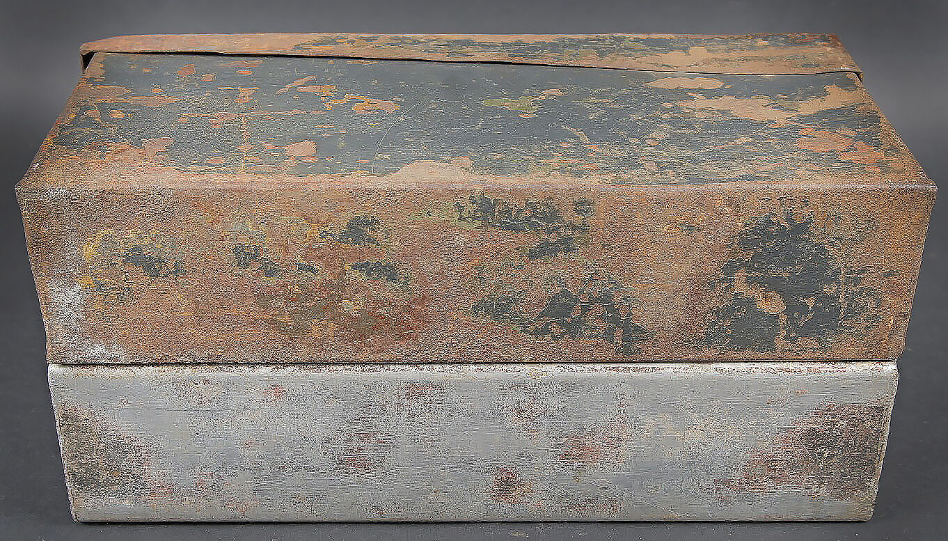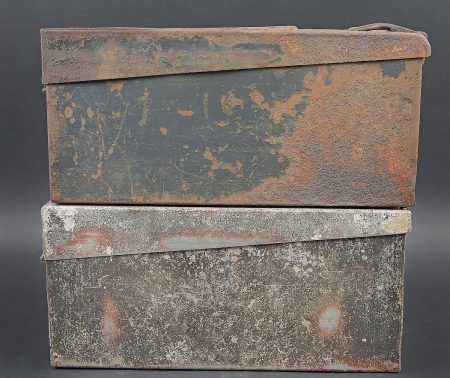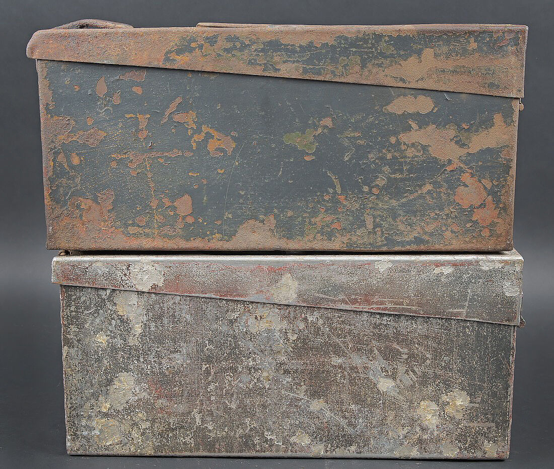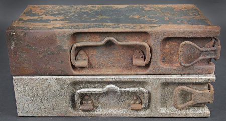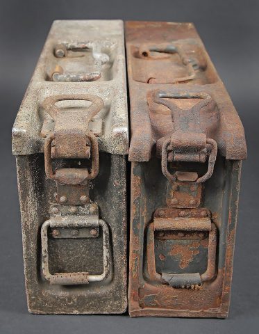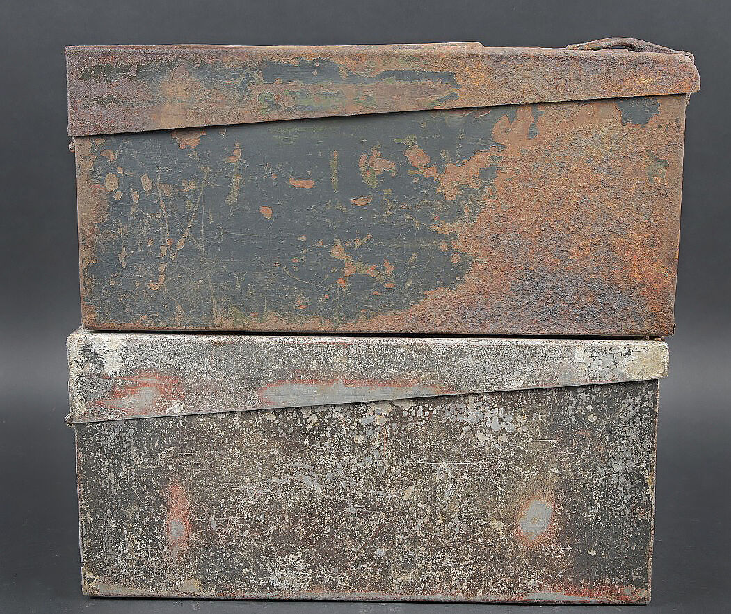 Caisses MG 34/42. Comprenant une caisse Patronenkasten 15 en métal, peinture Feldgrau à 30%, fermeture et poignée de transport présents. Une caisse à munition Patronenkaste 1941, en aluminium, quasiment dépourvue de peinture. La poignée de transport est présente. Les crochets de fermeture sont fonctionnels. Fabrication 1939. A noter une certaine usure et patine des pièces. Etat II+. MG 34/42 ammunition cases. Set consisting of one Patronenkasten 15 metal case, Feldgrau paint 30% preserved, closure and carrying handle present; and one Patronenkasten model 1941 in aluminium, almost devoid of paint, carrying handle present, latches functional, dated 1939. Notable wear and patina. Condition II+.