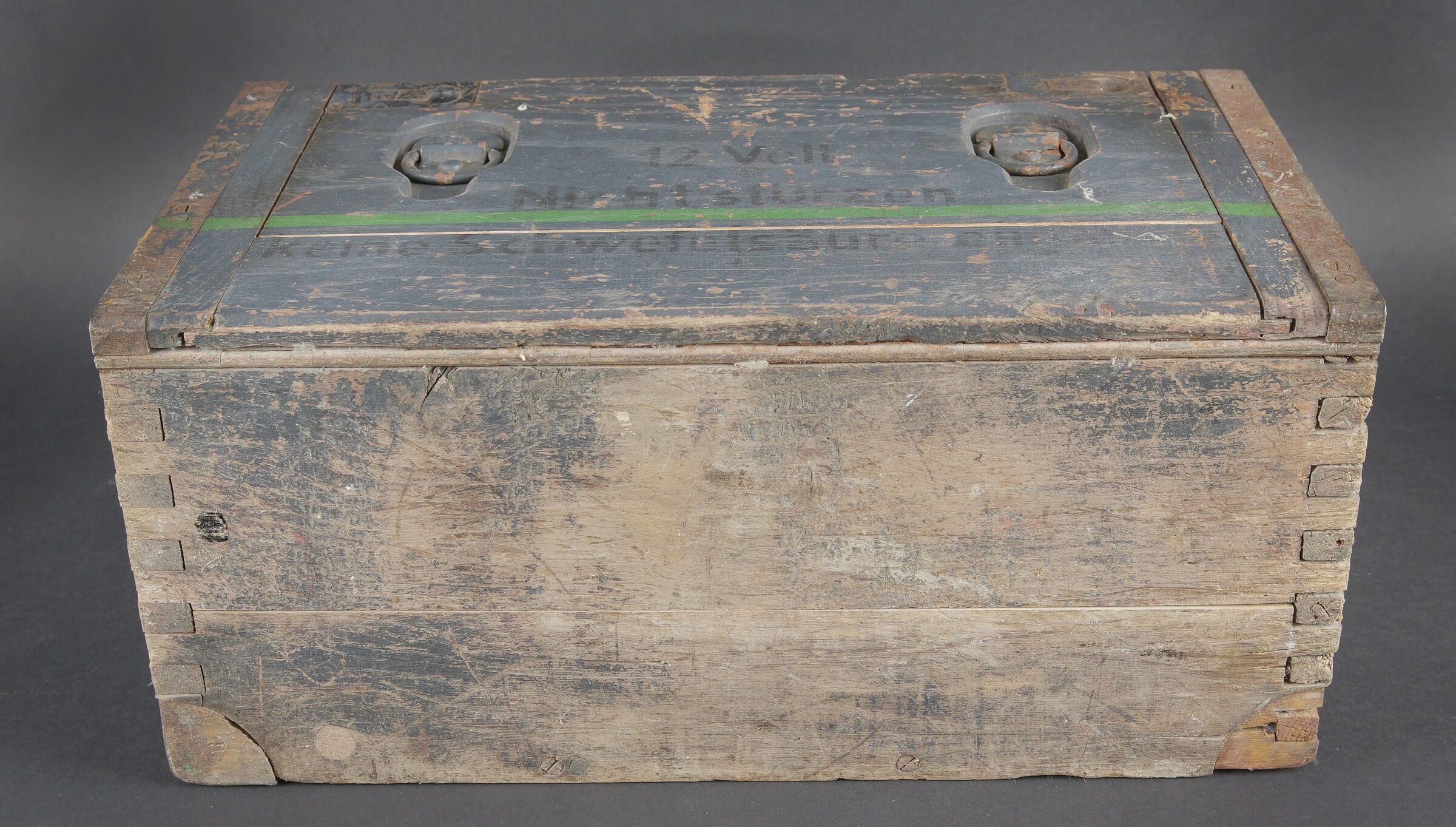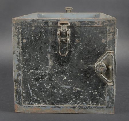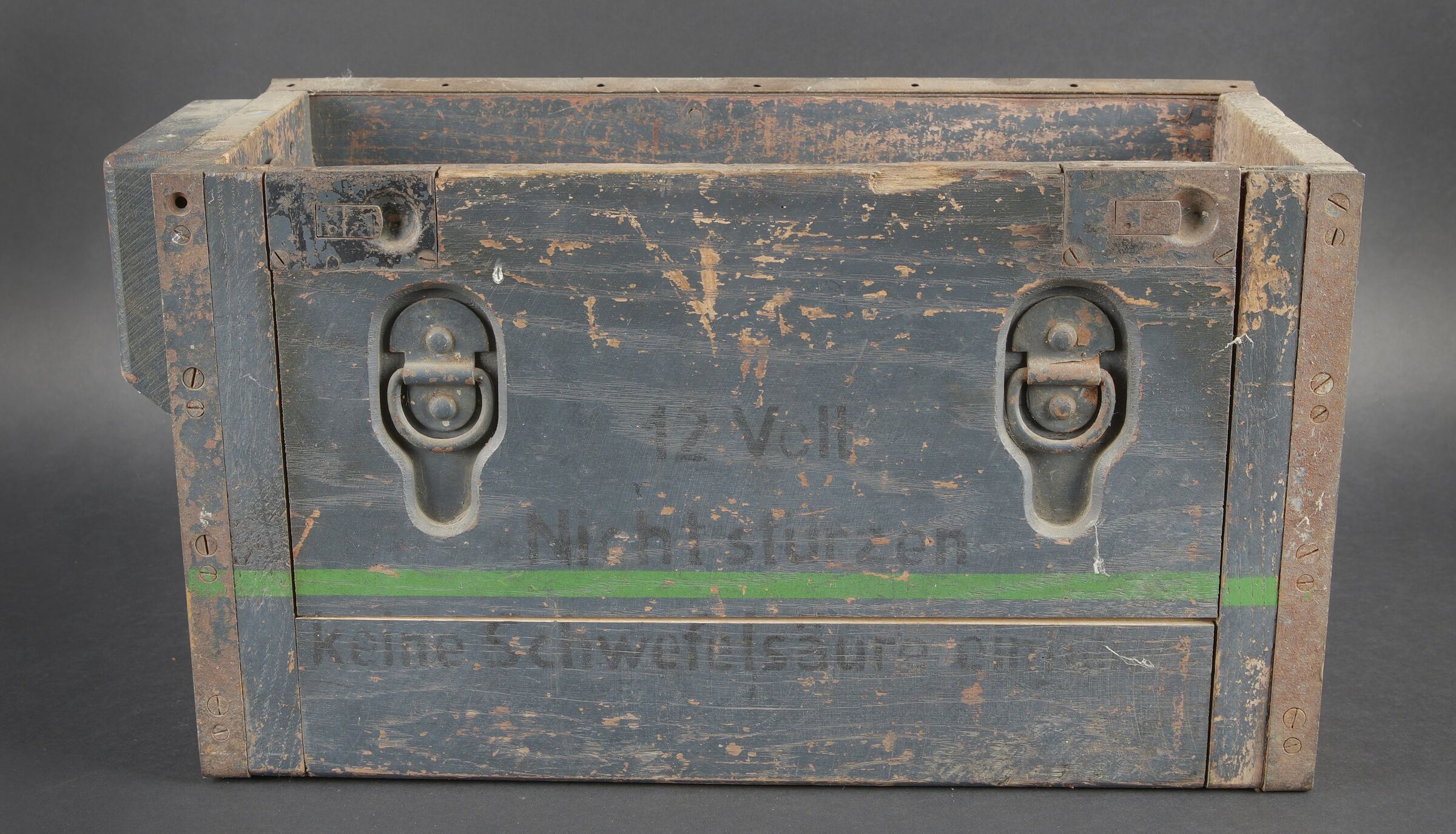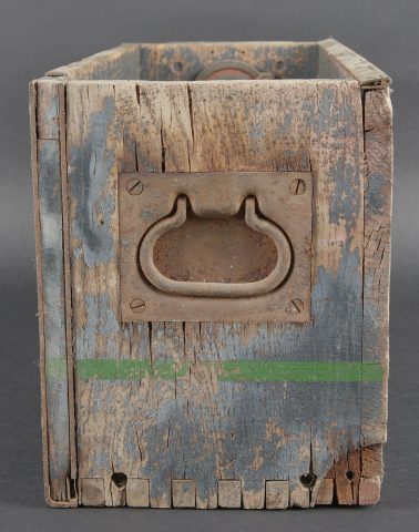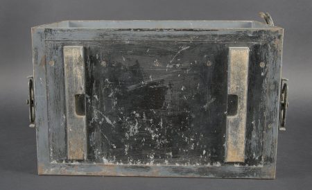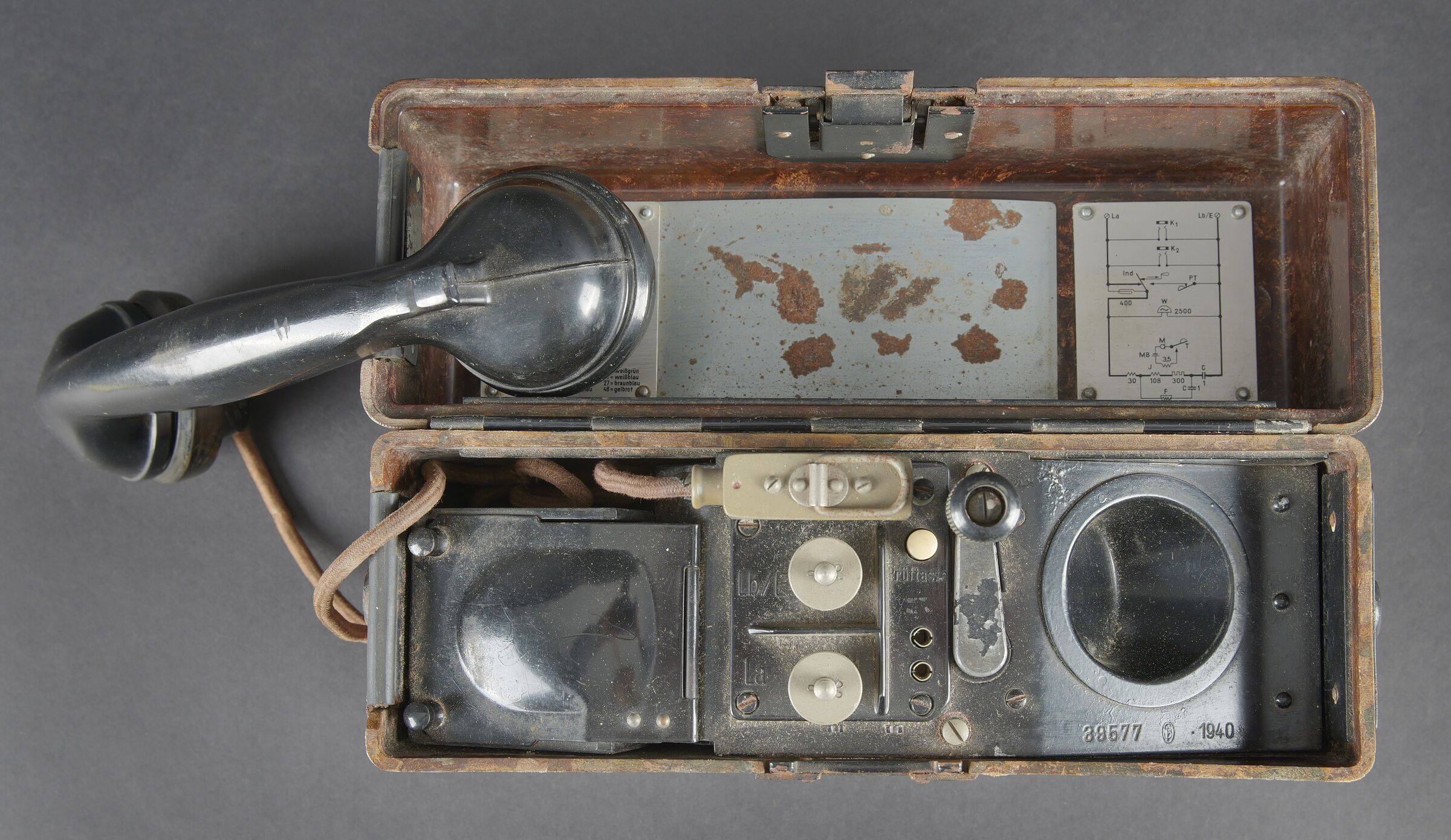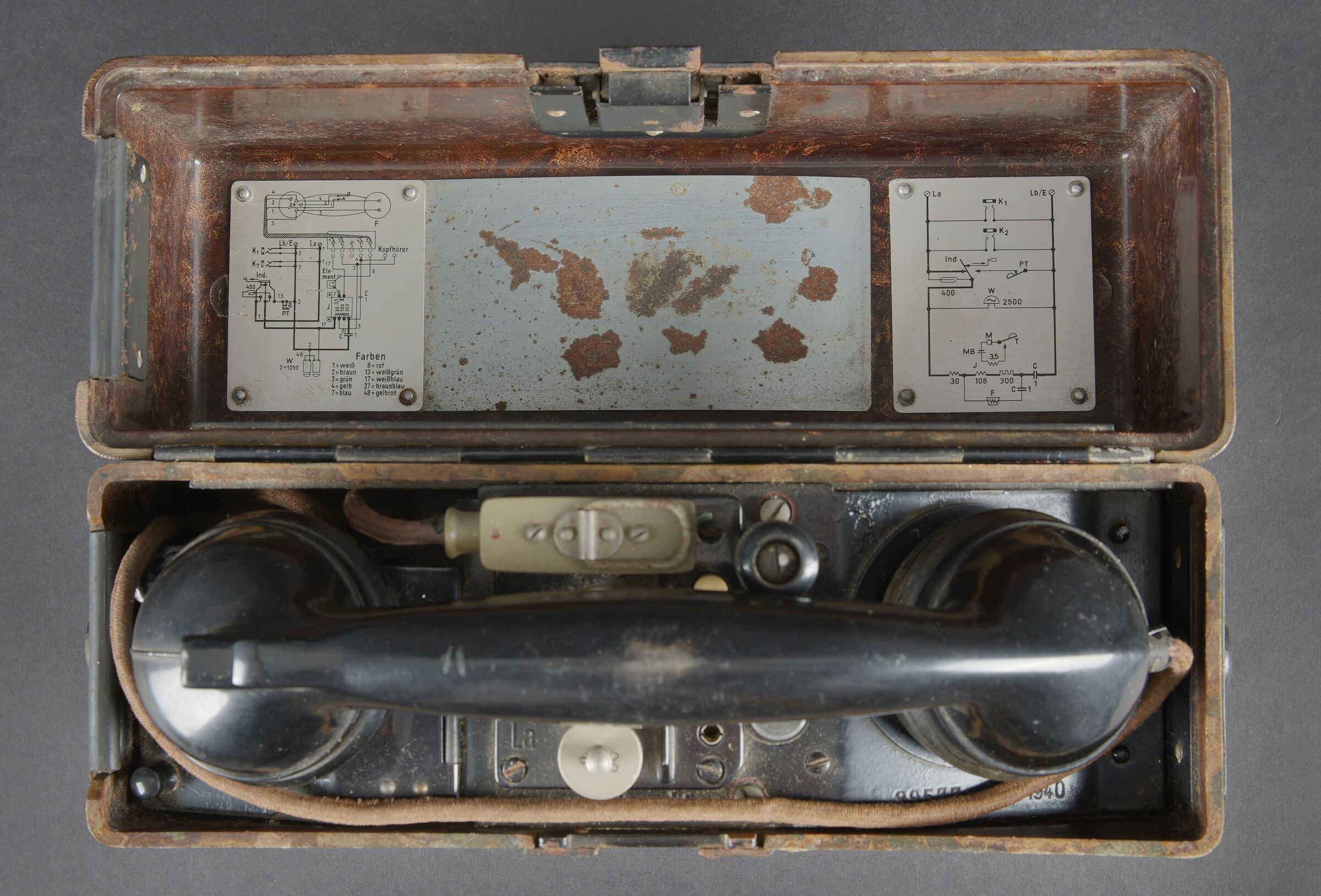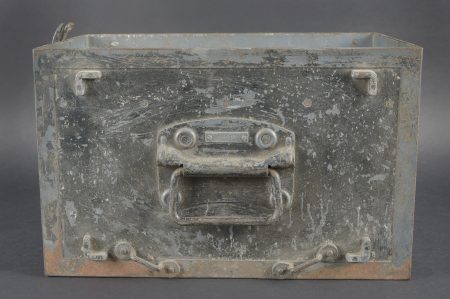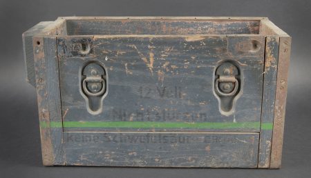 Caisses radio. Comprenant un téléphone de campagne en bakélite marron, la sangle de transport est manquante. Les plaquettes sont présentes. Combiné et manivelle présents. Pile absente. Le connecteur du combiné est de couleur jaune sable. Daté 1940. Un boitier vide pour Torn EB. Peinture à 70%. Les poignées sont présentes. Radio absente, ainsi que le couvercle. Dévidoir de câble téléphonique en métal, peinture à 60%. Sans marquages visibles. Une caisse vide et incomplète, marquée 12 Volt, peinture à 70%. Bande verte faisant le tour de la caisse. A noter une certaine usure et patine des pièces. Etat II+. Radio crates Set consisting of a brown bakelite field telephone with missing carrying strap Data plates present Handset and crank present Battery missing Sand-yellow handset connector dated 1940 One empty Torn.E.b case with 70 % paint and handles present Set missing together with the lid One metal telephone cable reel with 60 % paint and no visible markings One empty and incomplete crate marked 12 Volt with 70 % paint and green band around the body Noticeable wear and patina Condition II+