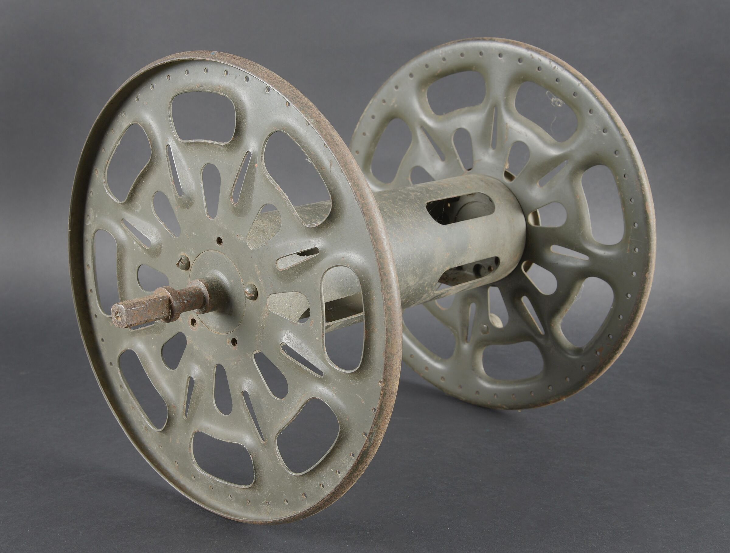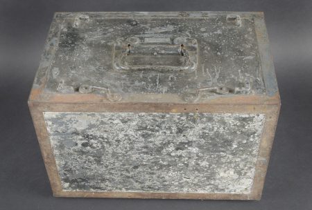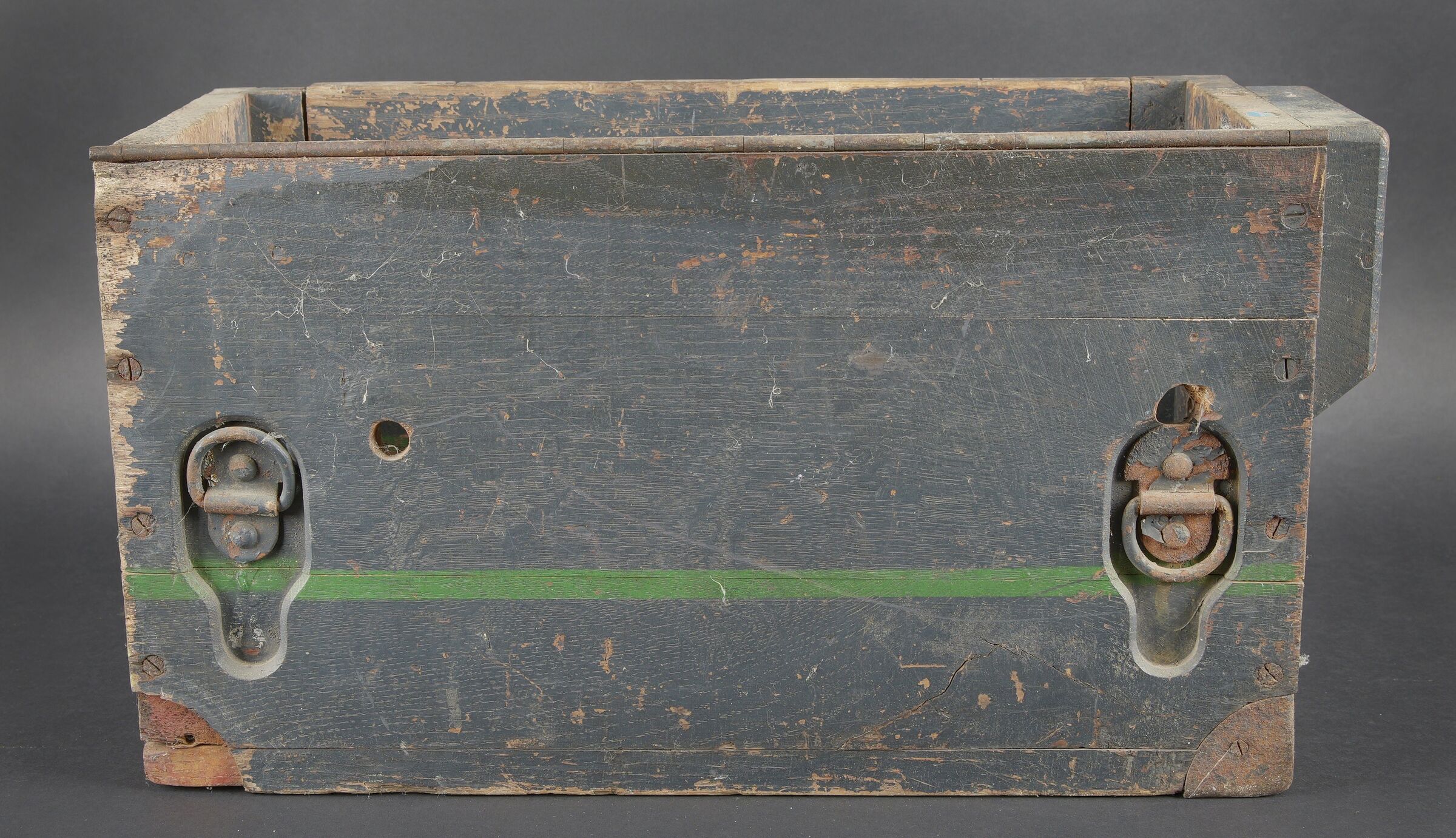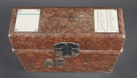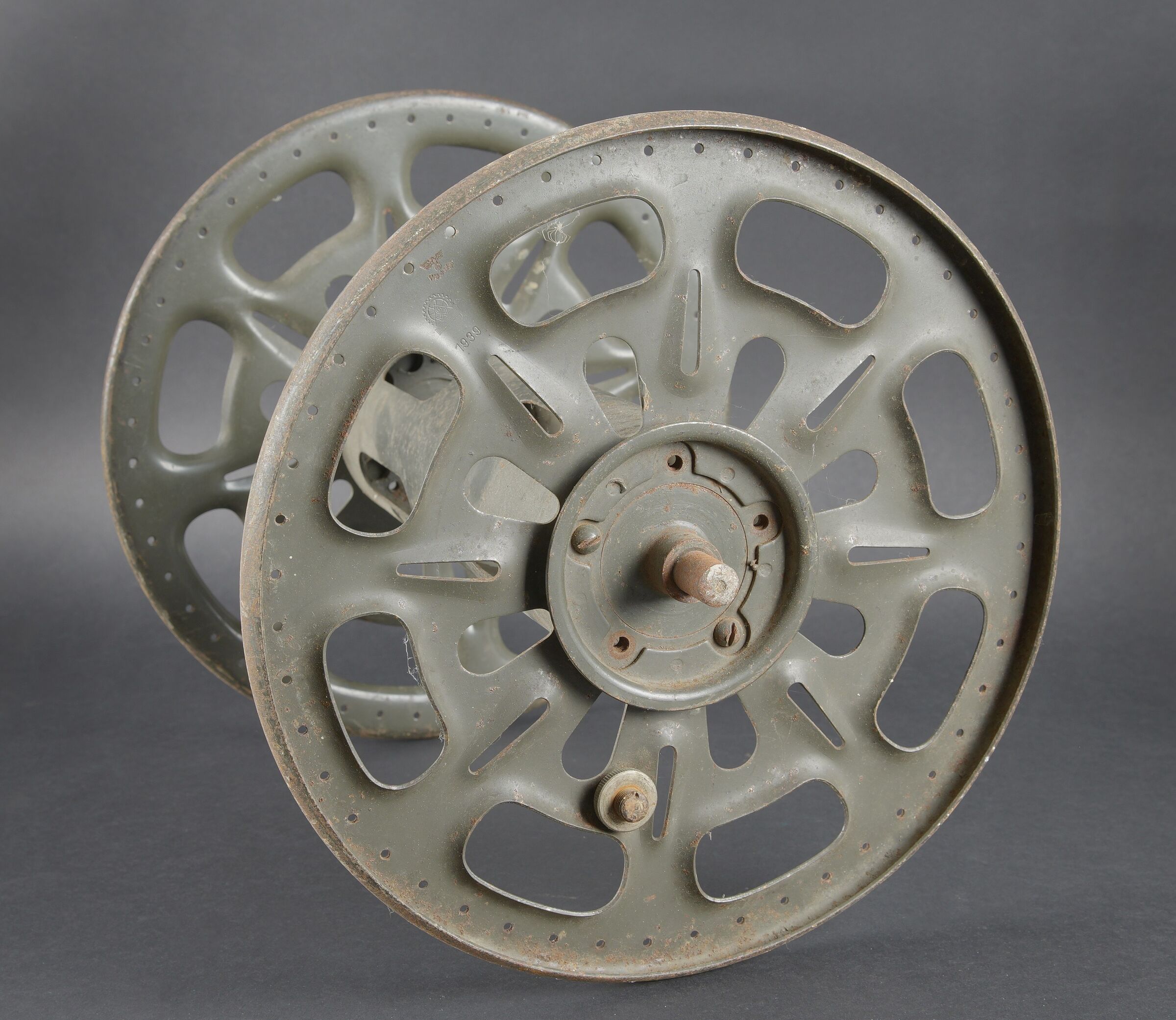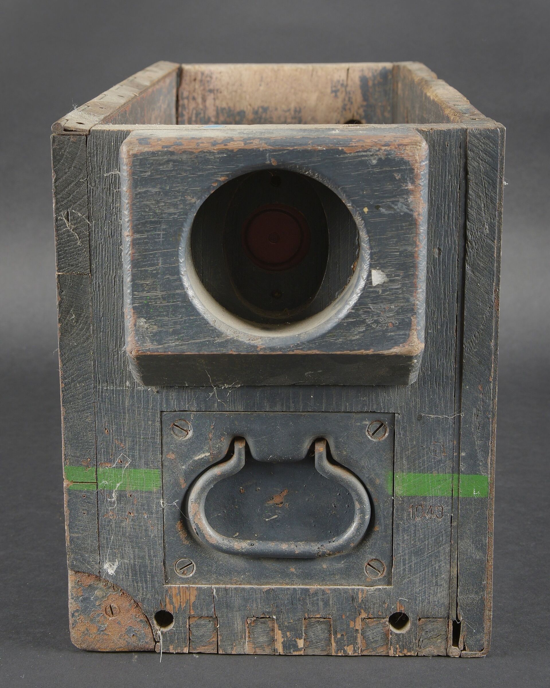 Caisses radio. Comprenant un téléphone de campagne en bakélite marron, la sangle de transport est manquante. Les plaquettes sont présentes. Combiné et manivelle présents. Pile absente. Le connecteur du combiné est de couleur jaune sable. Daté 1940. Un boitier vide pour Torn EB. Peinture à 70%. Les poignées sont présentes. Radio absente, ainsi que le couvercle. Dévidoir de câble téléphonique en métal, peinture à 60%. Sans marquages visibles. Une caisse vide et incomplète, marquée 12 Volt, peinture à 70%. Bande verte faisant le tour de la caisse. A noter une certaine usure et patine des pièces. Etat II+. Radio crates Set consisting of a brown bakelite field telephone with missing carrying strap Data plates present Handset and crank present Battery missing Sand-yellow handset connector dated 1940 One empty Torn.E.b case with 70 % paint and handles present Set missing together with the lid One metal telephone cable reel with 60 % paint and no visible markings One empty and incomplete crate marked 12 Volt with 70 % paint and green band around the body Noticeable wear and patina Condition II+