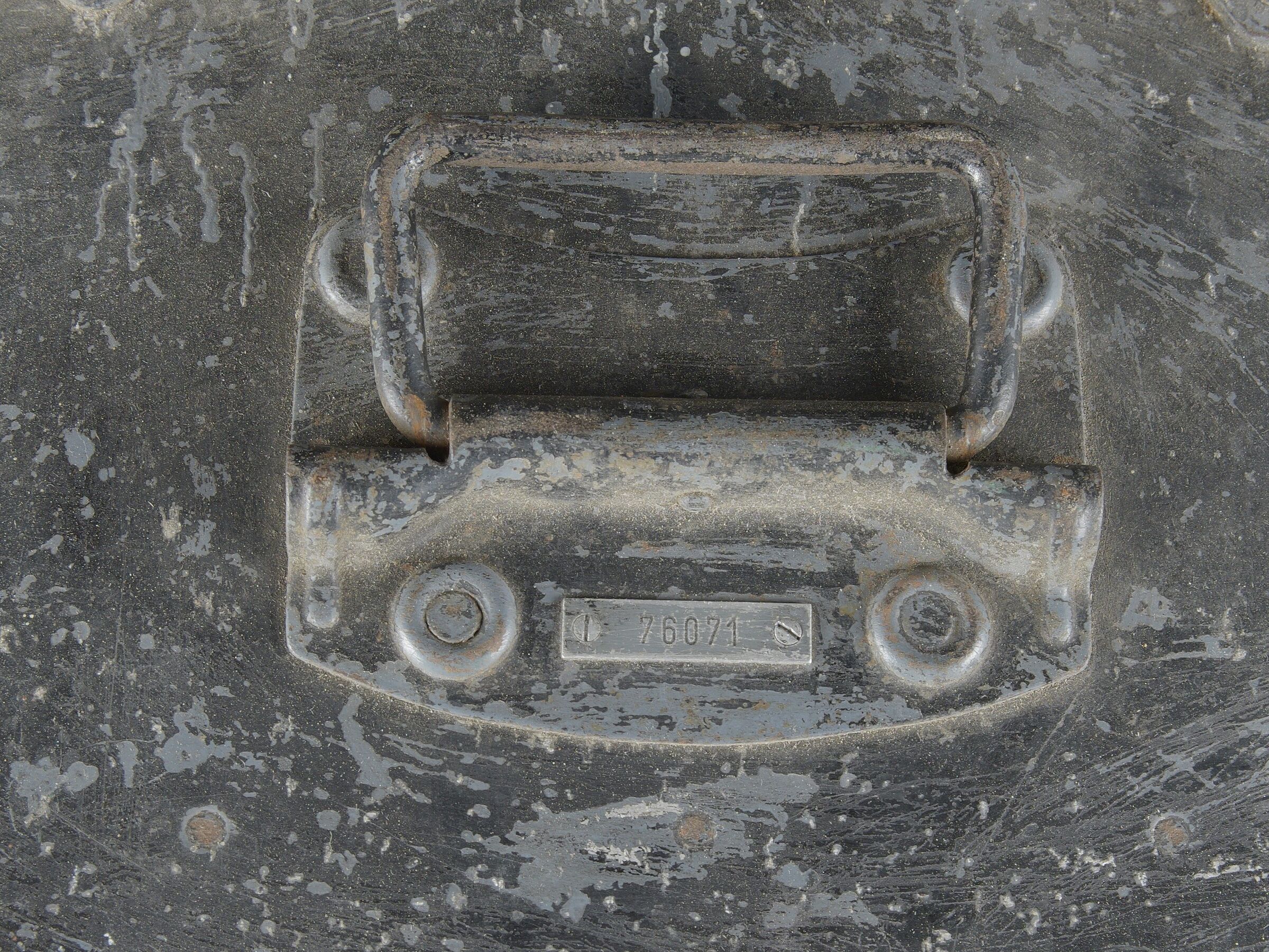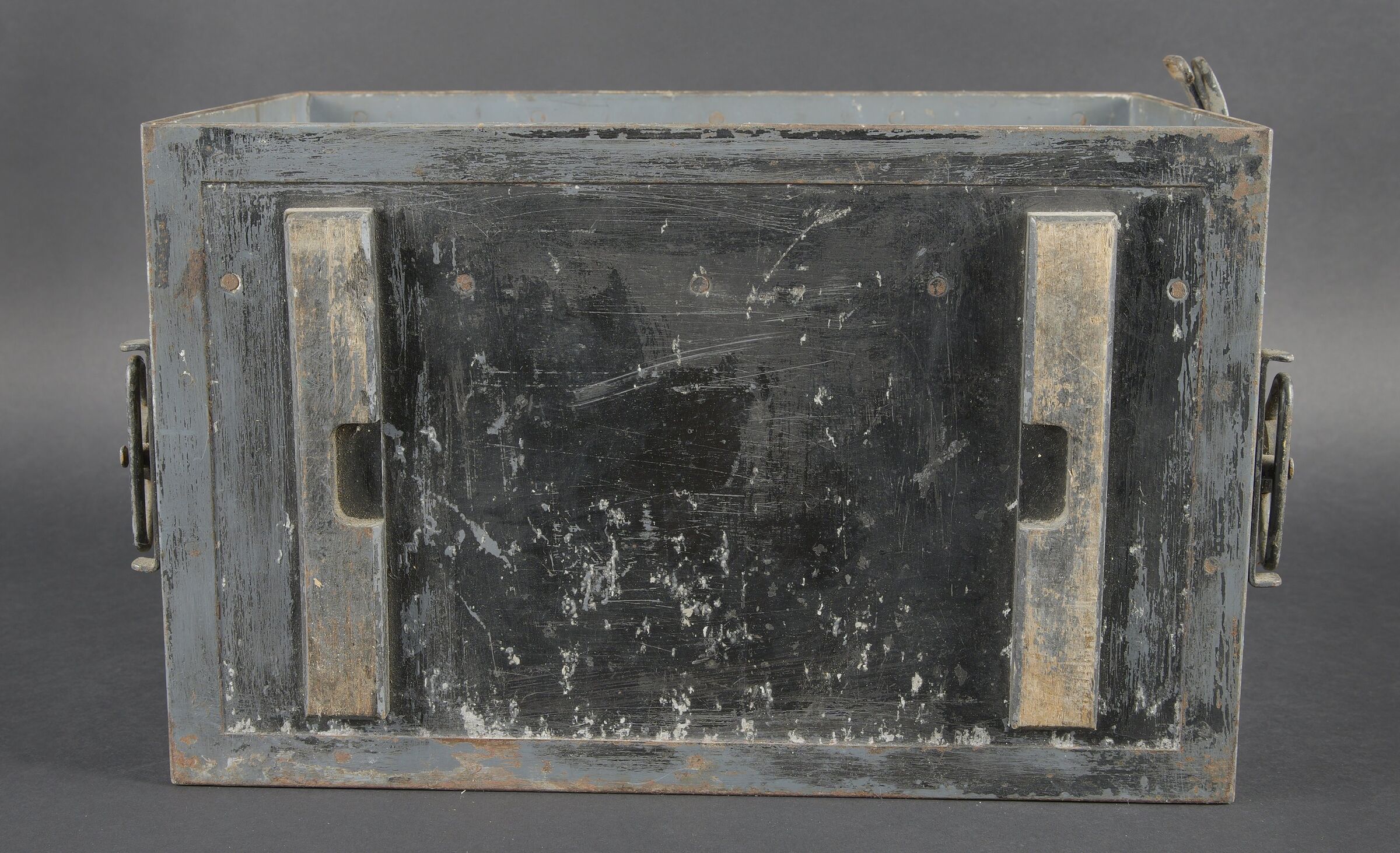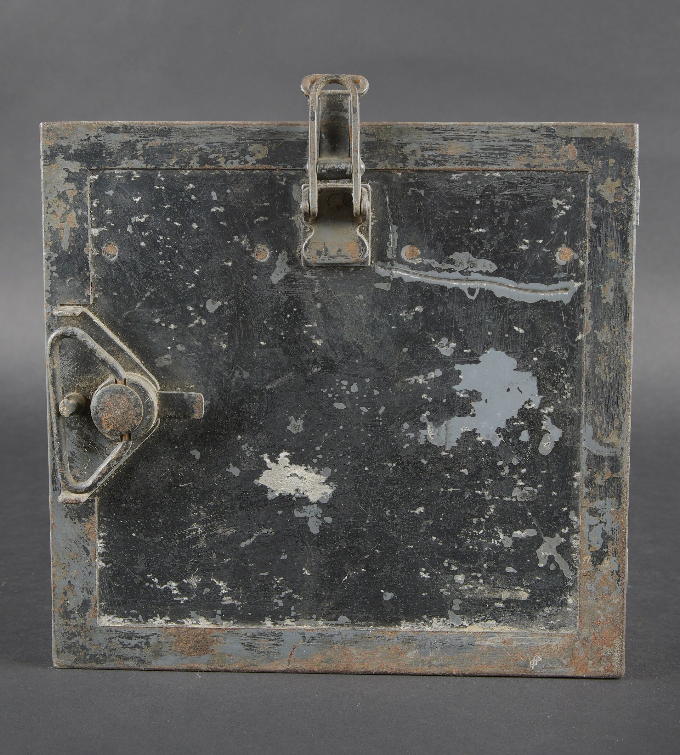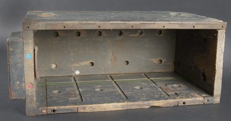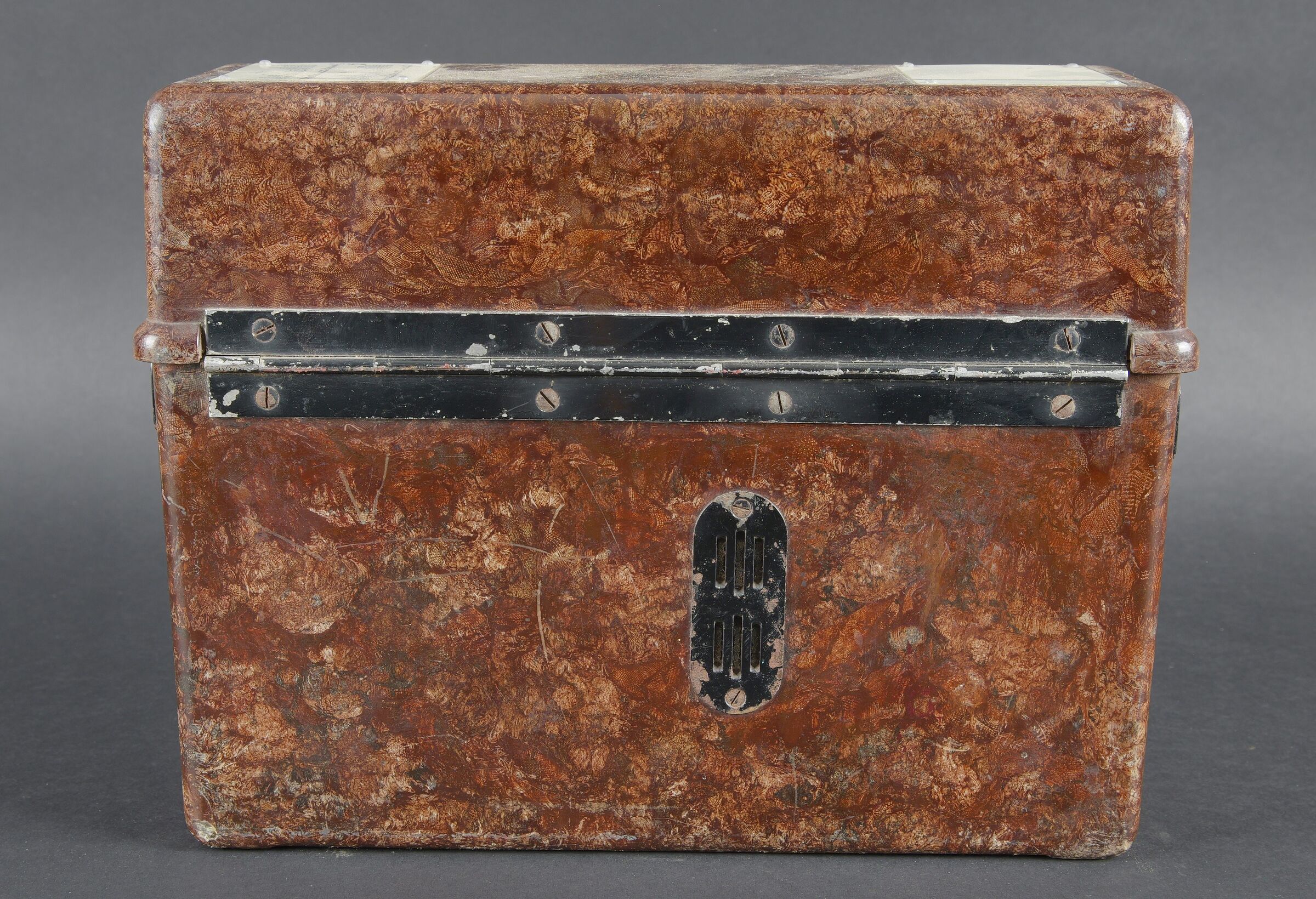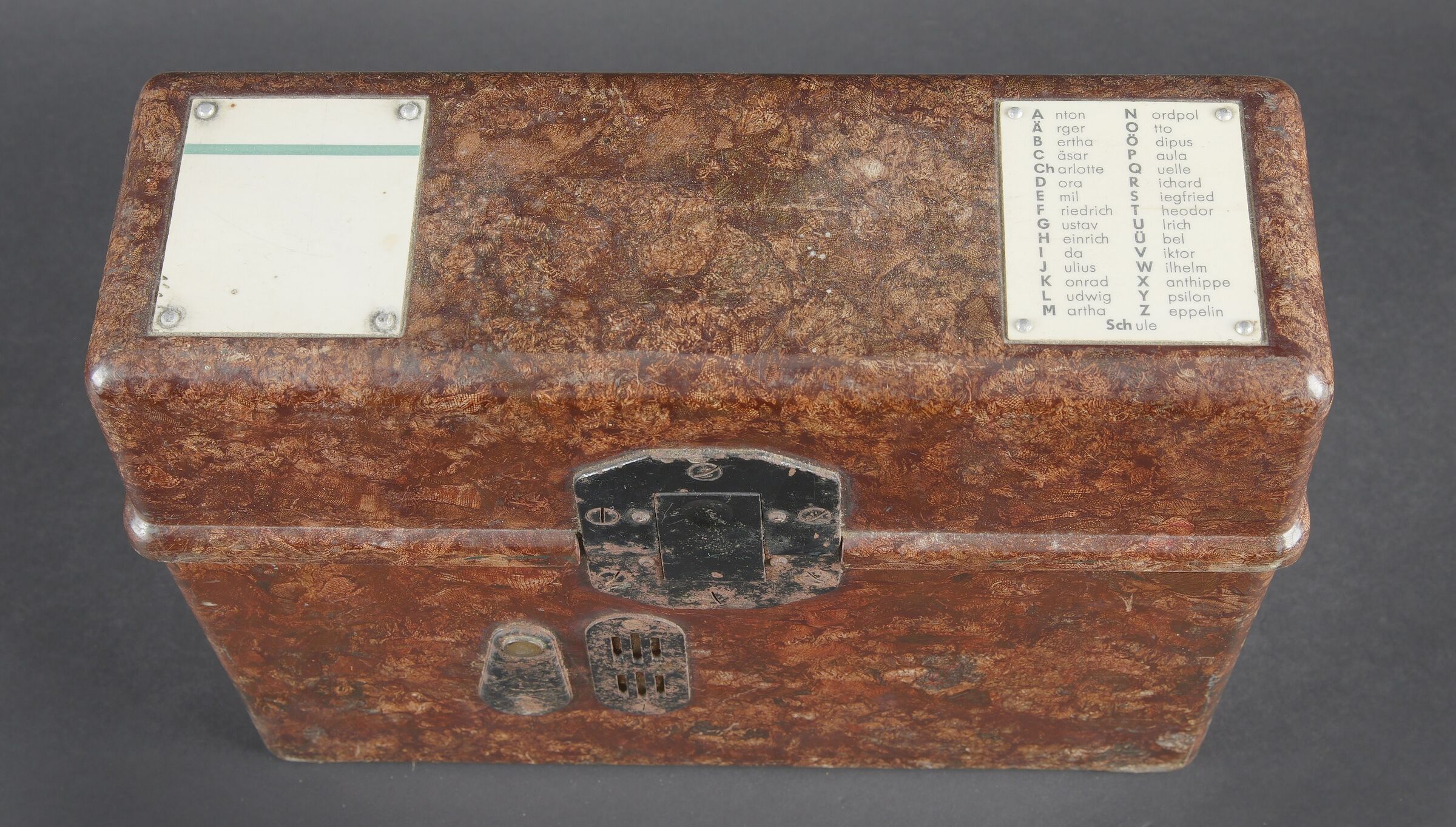 Caisses radio. Comprenant un téléphone de campagne en bakélite marron, la sangle de transport est manquante. Les plaquettes sont présentes. Combiné et manivelle présents. Pile absente. Le connecteur du combiné est de couleur jaune sable. Daté 1940. Un boitier vide pour Torn EB. Peinture à 70%. Les poignées sont présentes. Radio absente, ainsi que le couvercle. Dévidoir de câble téléphonique en métal, peinture à 60%. Sans marquages visibles. Une caisse vide et incomplète, marquée 12 Volt, peinture à 70%. Bande verte faisant le tour de la caisse. A noter une certaine usure et patine des pièces. Etat II+. Radio crates Set consisting of a brown bakelite field telephone with missing carrying strap Data plates present Handset and crank present Battery missing Sand-yellow handset connector dated 1940 One empty Torn.E.b case with 70 % paint and handles present Set missing together with the lid One metal telephone cable reel with 60 % paint and no visible markings One empty and incomplete crate marked 12 Volt with 70 % paint and green band around the body Noticeable wear and patina Condition II+