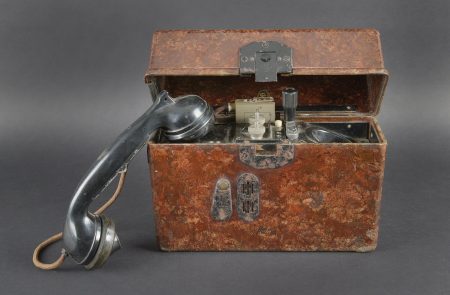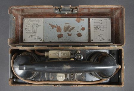 Détails de la vente >Caisses radio. Comprenant un téléphone de campagne en bakélite marron, la sangle de transport est manquante. Les plaquettes sont présentes. Combiné et manivelle présents. Pile absente. Le... en savoir plus