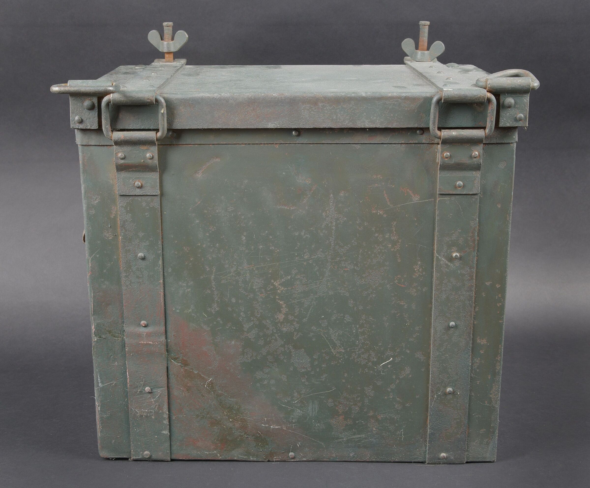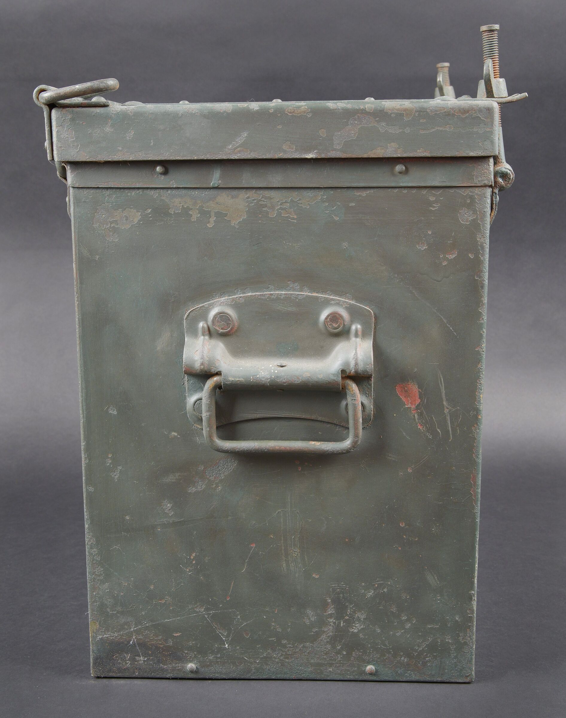 Caisson de cuisine roulante allemand. En épais métal, les poignées de transport sont présentes. Les vis de fermeture sont fonctionnelles. Entièrement repeinte. Couvercle doublé d’un... en savoir plus