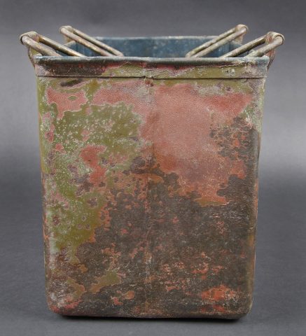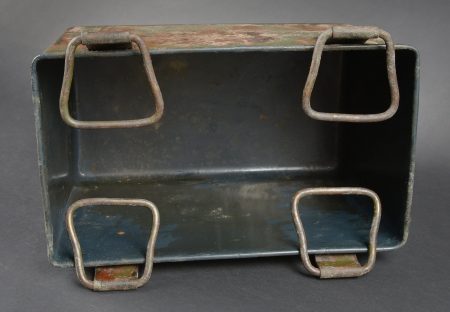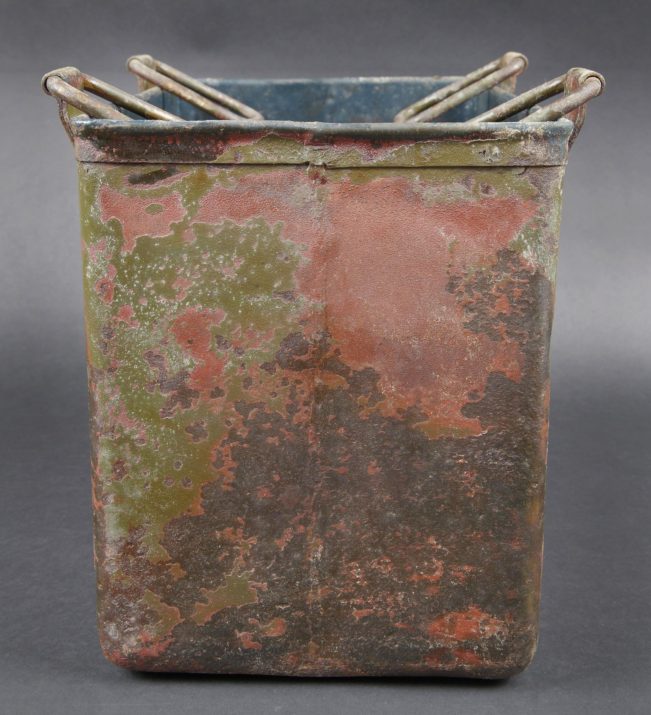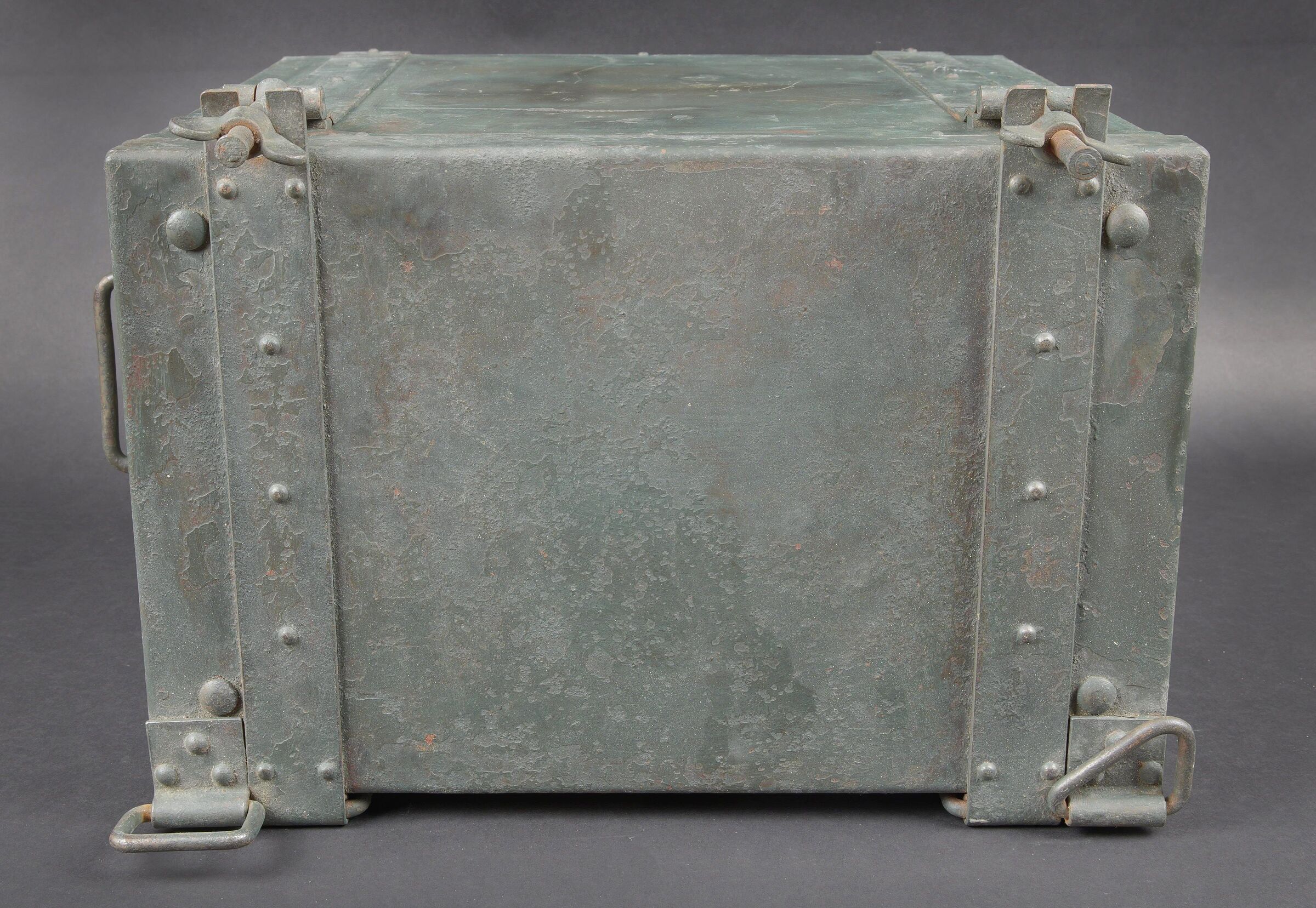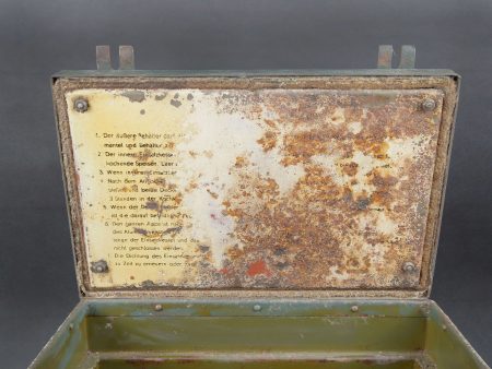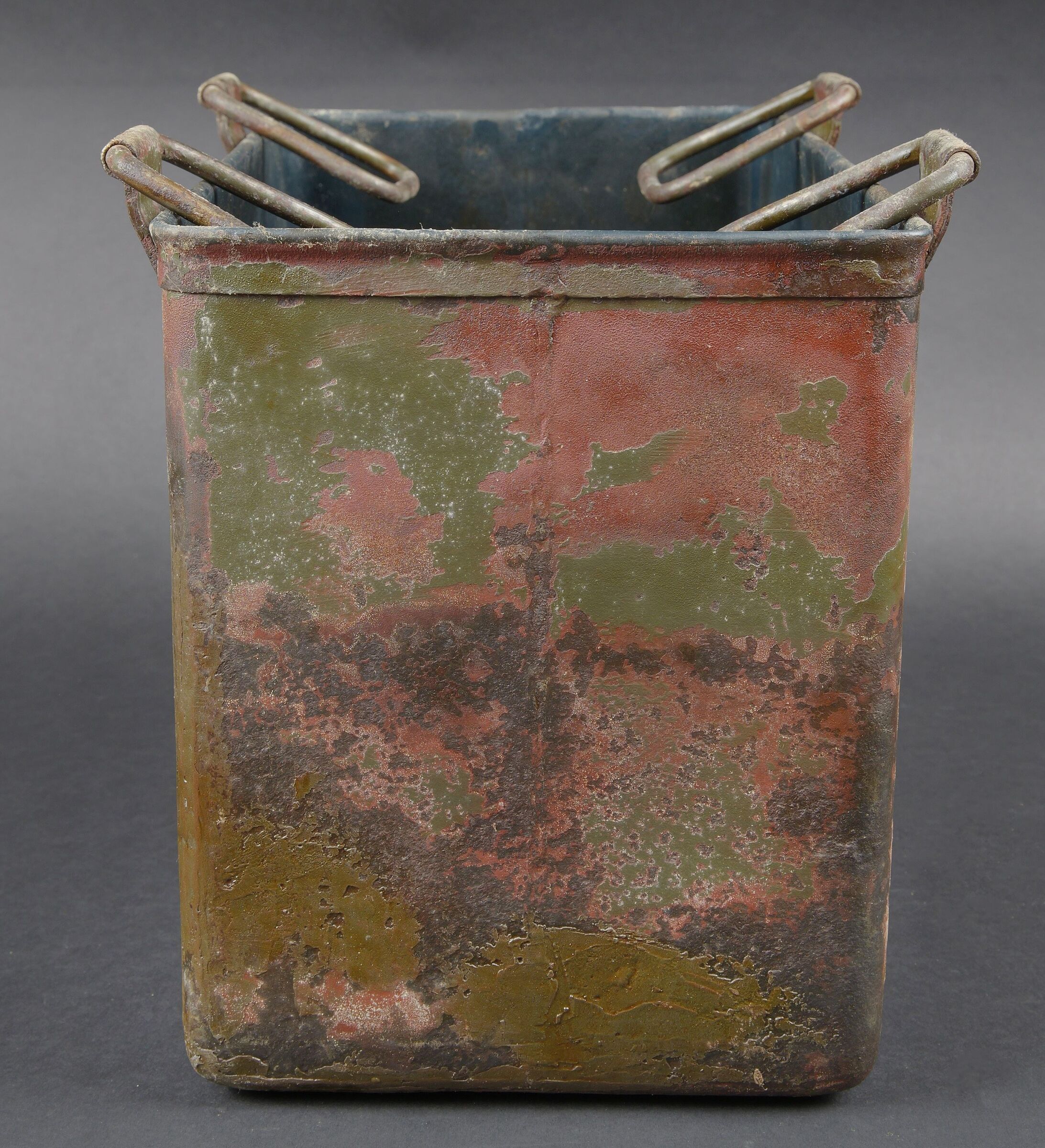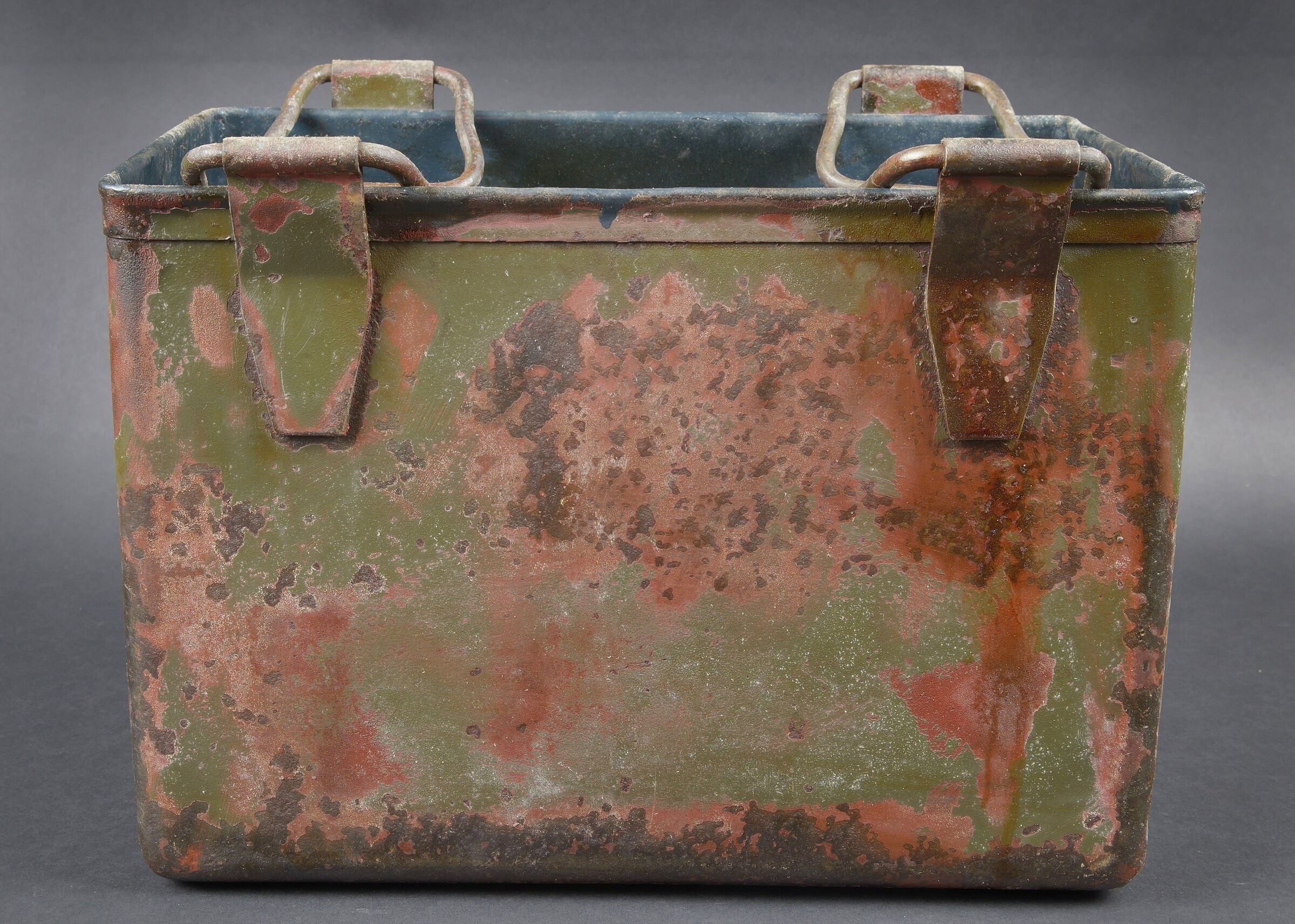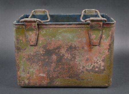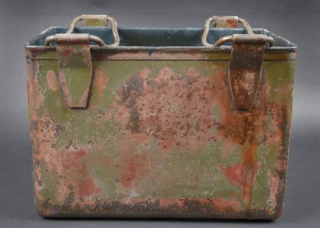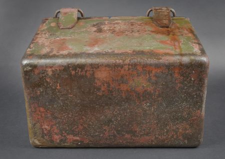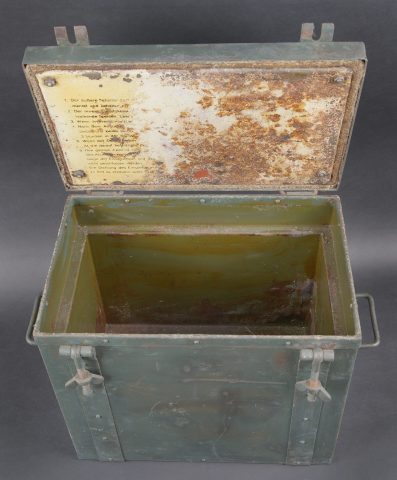Caisson de cuisine roulante allemand. En épais métal, les poignées de transport sont présentes. Les vis de fermeture sont fonctionnelles. Entièrement repeinte. Couvercle doublé d’un drap marron. Notice d’utilisation incomplète sous le couvercle. Bac intérieur en métal émaillé noir, les poignées de transport sont présentes. A noter une certaine usure et patine de la pièce. Etat II+. German field kitchen container. Heavy metal construction with both carrying handles present. Closure screws functional. Completely repainted. Lid lined with brown cloth. Incomplete instruction sheet under the lid. Interior black enamelled metal insert with its carrying handles present. Showing wear and patina. Condition II+.