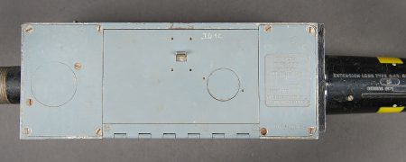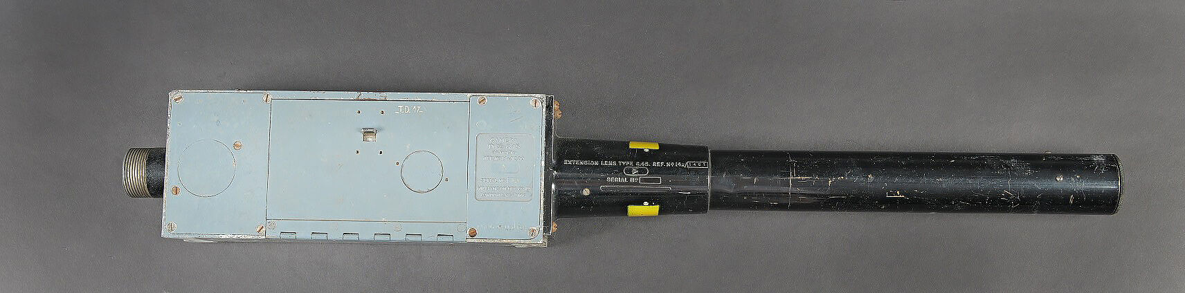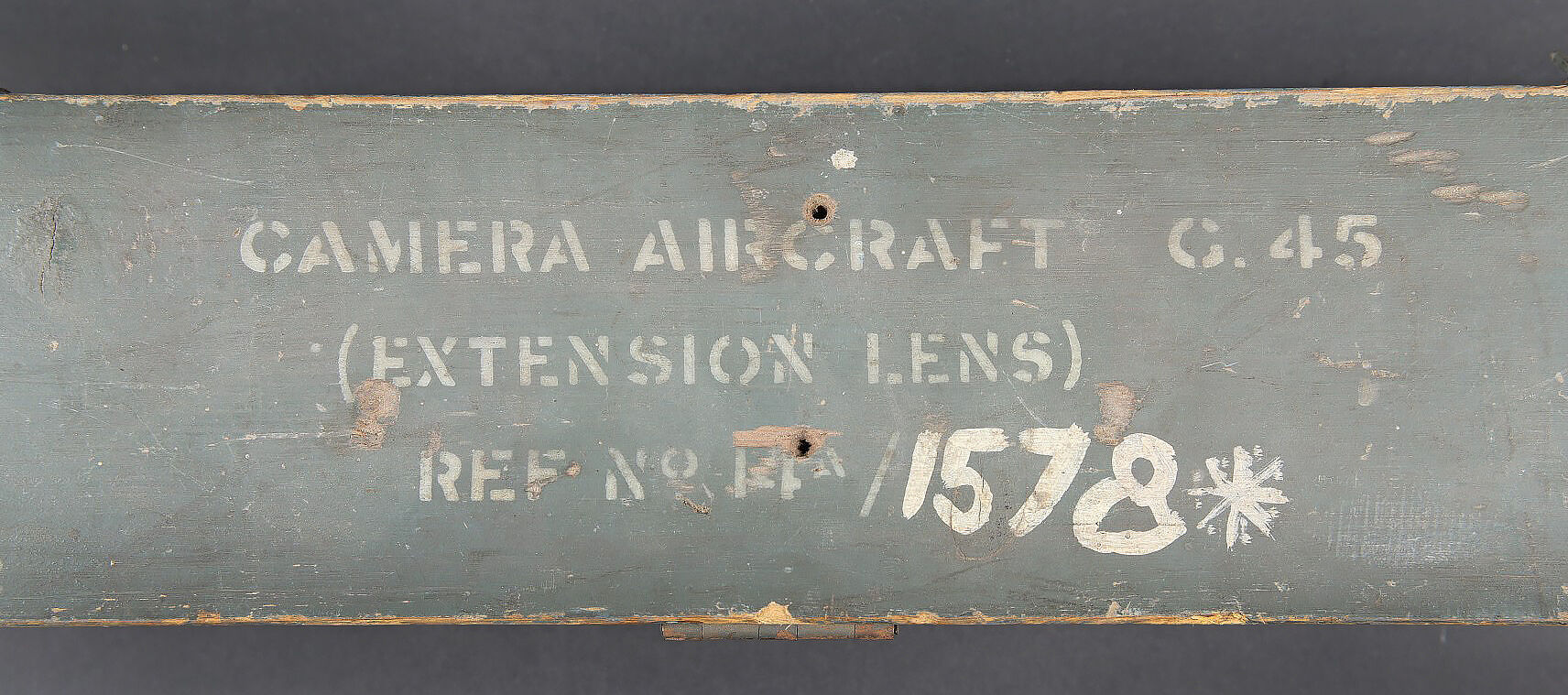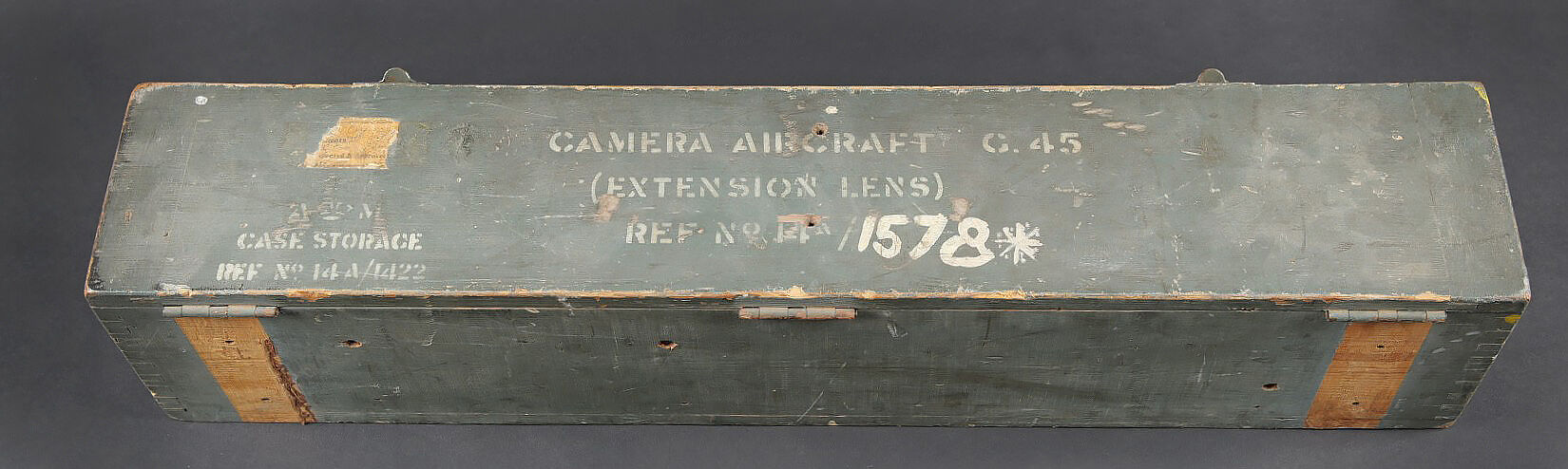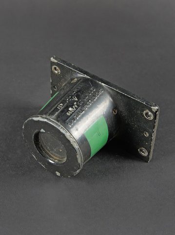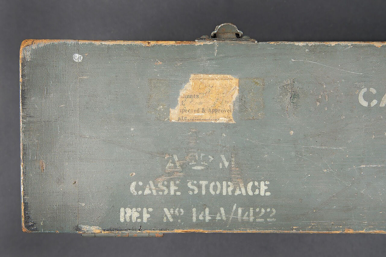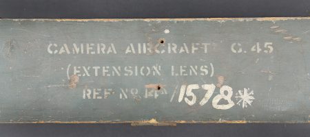 Camera Aircraft C45. Belle caisse en bois. Peinture grise à 80%. Les charnières arrières ont été remplacées. Les crochets de fermeture sont présents. Couvercle marqué Camera Aircraft C45 Extension Lens Ref 1578. Case Storage Ref N 14A/422. La poignée de transport avant est absente. Camera présente. Boitier en métal, couleur grise à 70%. Marquages Camera Type C45 Ref 14a/1390, numéro de série 436. Fabrication Williamson MFG CO Ltd London. Optique présente. Viseur en métal. Peinture noire à 70%. Bande verte faisant le tour de la pièce. Deux cartouches pour film Ils ont utilisé un film ortho chromique de 16 mm fourni en longueurs de 25 avec une vitesse d’image de 16, 18 ou 20 par seconde, ce qui correspond aux taux de tir des mitrailleuses Lewis, Vickers K et Browning. A noter une certaine usure et patine de la pièce. Etat II+. Les caméras étaient montées dans les ailes de nombreux chasseurs Spitfire et Hurricane. Aircraft camera Type C-45 Wooden transport case with grey paint 80% preserved. Rear hinges replaced. Closing hooks present. Lid marked Camera Aircraft C45 Extension Lens Ref. 1578 Case Storage Ref. No. 14A/422. Front carrying handle missing. Camera present in grey metal housing with paint 70% preserved. Marked Camera Type C45 Ref. 14A/1390 Serial No. 436 Williamson Mfg. Co. Ltd London. Optics present. Metal sight with black paint 70% preserved and green identification band. Two film cartridges present. These cameras used 16 mm orthochromatic film in 25 ft lengths at 16, 18 or 20 frames per second matching the firing rates of Lewis, Vickers K and Browning machine guns. Installed in the wings of numerous Spitfire and Hurricane fighters. Note some wear and patina to the piece. Condition II+.
