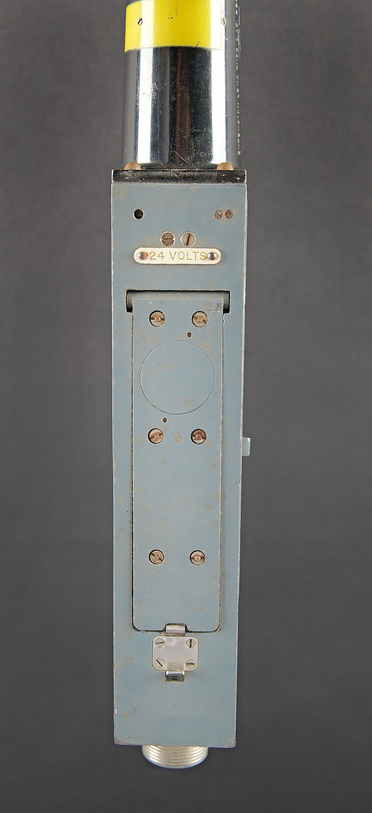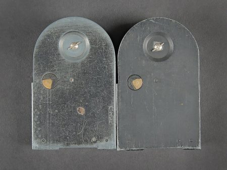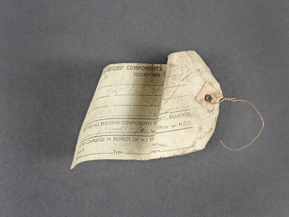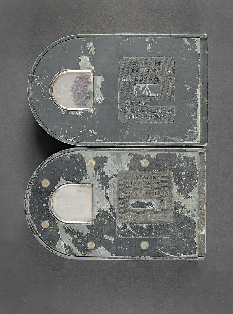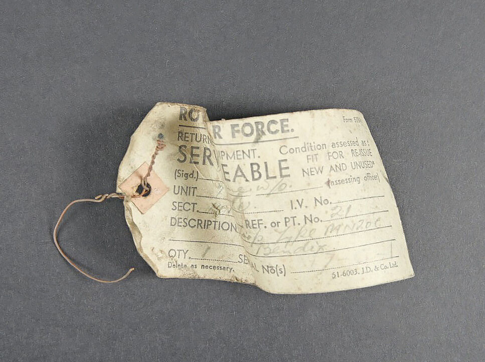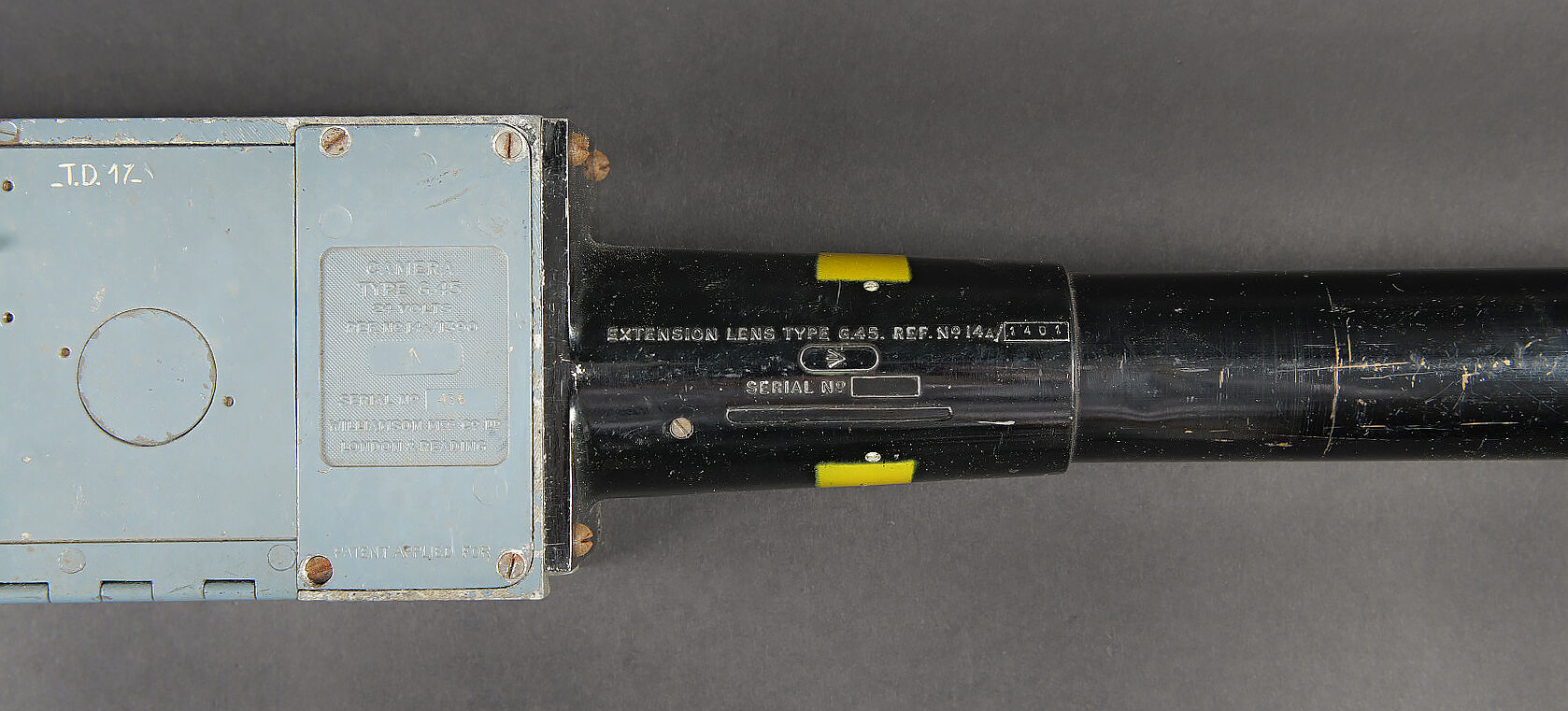 Camera Aircraft C45. Belle caisse en bois. Peinture grise à 80%. Les charnières arrières ont été remplacées. Les crochets de fermeture sont présents. Couvercle marqué Camera Aircraft C45 Extension Lens Ref 1578. Case Storage Ref N 14A/422. La poignée de transport avant est absente. Camera présente. Boitier en métal, couleur grise à 70%. Marquages Camera Type C45 Ref 14a/1390, numéro de série 436. Fabrication Williamson MFG CO Ltd London. Optique présente. Viseur en métal. Peinture noire à 70%. Bande verte faisant le tour de la pièce. Deux cartouches pour film Ils ont utilisé un film ortho chromique de 16 mm fourni en longueurs de 25 avec une vitesse d’image de 16, 18 ou 20 par seconde, ce qui correspond aux taux de tir des mitrailleuses Lewis, Vickers K et Browning. A noter une certaine usure et patine de la pièce. Etat II+. Les caméras étaient montées dans les ailes de nombreux chasseurs Spitfire et Hurricane. Aircraft camera Type C-45 Wooden transport case with grey paint 80% preserved. Rear hinges replaced. Closing hooks present. Lid marked Camera Aircraft C45 Extension Lens Ref. 1578 Case Storage Ref. No. 14A/422. Front carrying handle missing. Camera present in grey metal housing with paint 70% preserved. Marked Camera Type C45 Ref. 14A/1390 Serial No. 436 Williamson Mfg. Co. Ltd London. Optics present. Metal sight with black paint 70% preserved and green identification band. Two film cartridges present. These cameras used 16 mm orthochromatic film in 25 ft lengths at 16, 18 or 20 frames per second matching the firing rates of Lewis, Vickers K and Browning machine guns. Installed in the wings of numerous Spitfire and Hurricane fighters. Note some wear and patina to the piece. Condition II+.