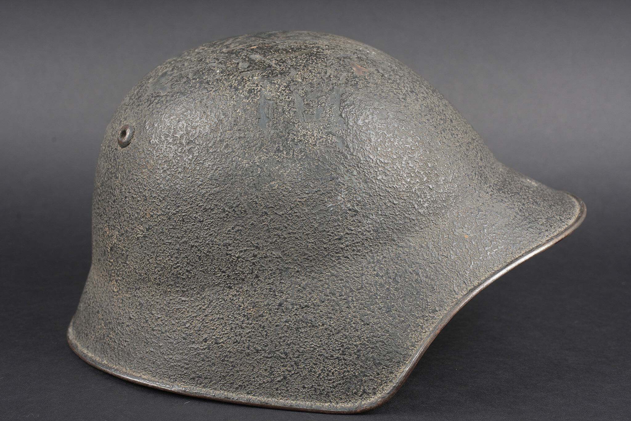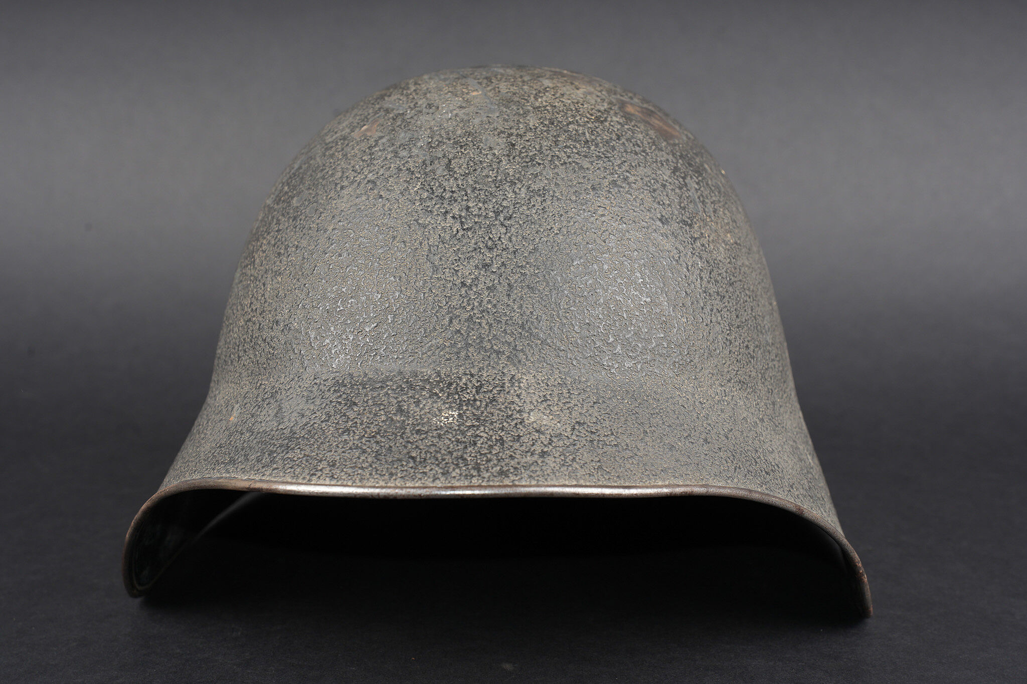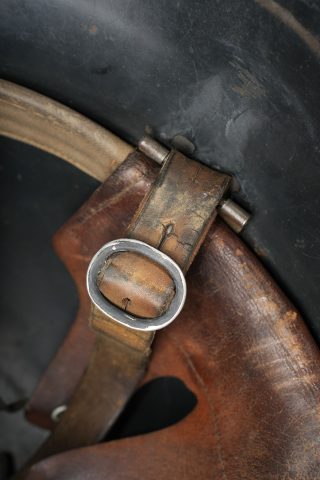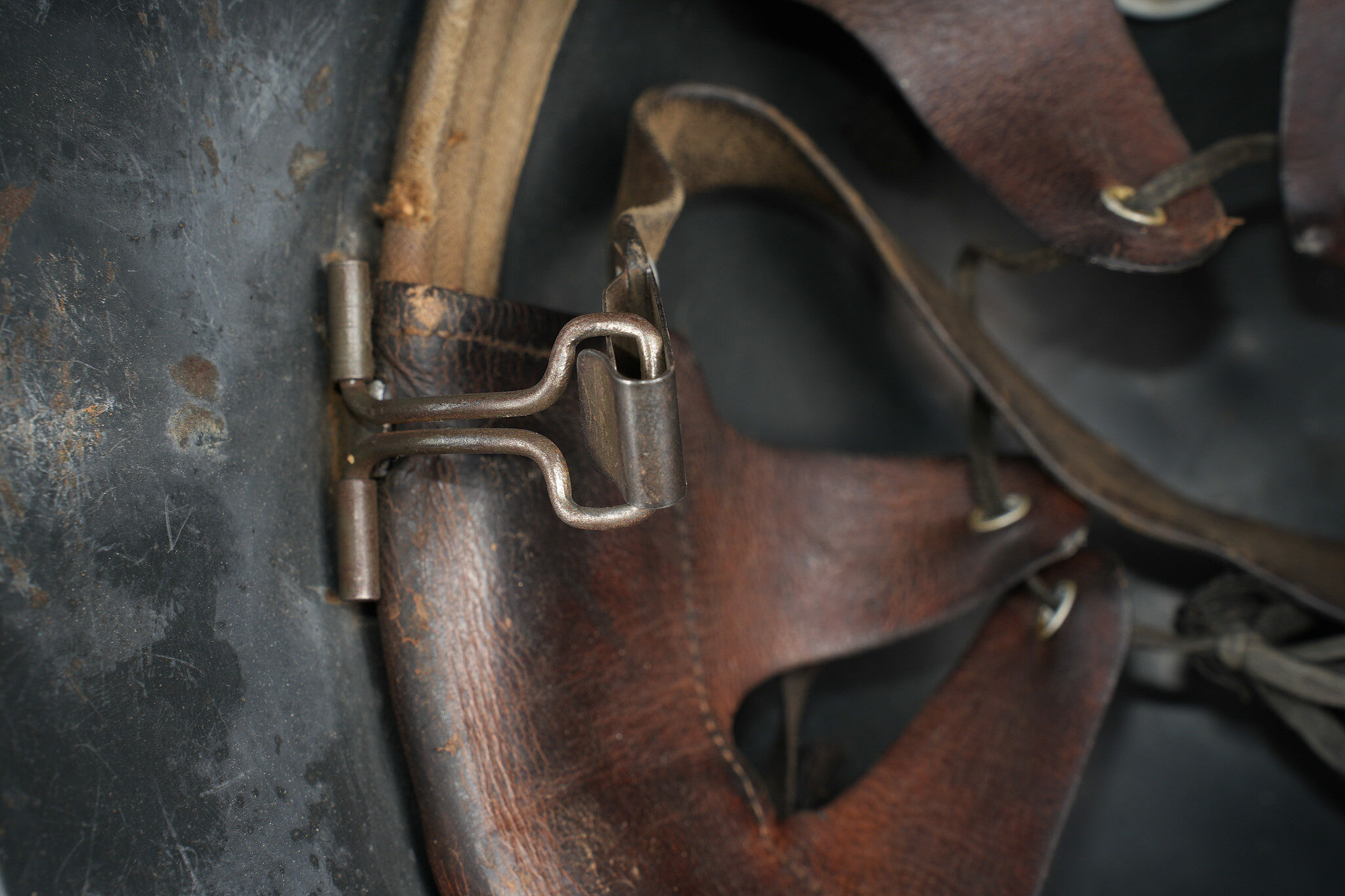 Suisse casque modèle 1918-43. Fabrication probable des années 50, avec sa coiffe à dents de loup à œillets, sa jugulaire et son disque d’identification nominatif. Swiss Model 1918-43 helmet. Probably 1950s manufacture, fitted with wolf’s teeth style liner with eyelets, complete with chinstrap and named identification disc.