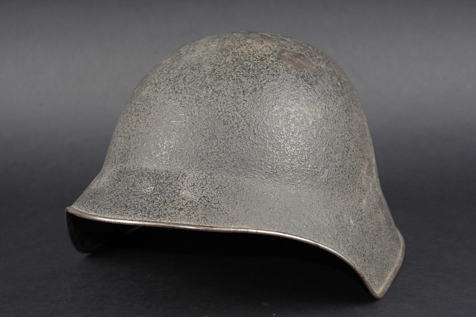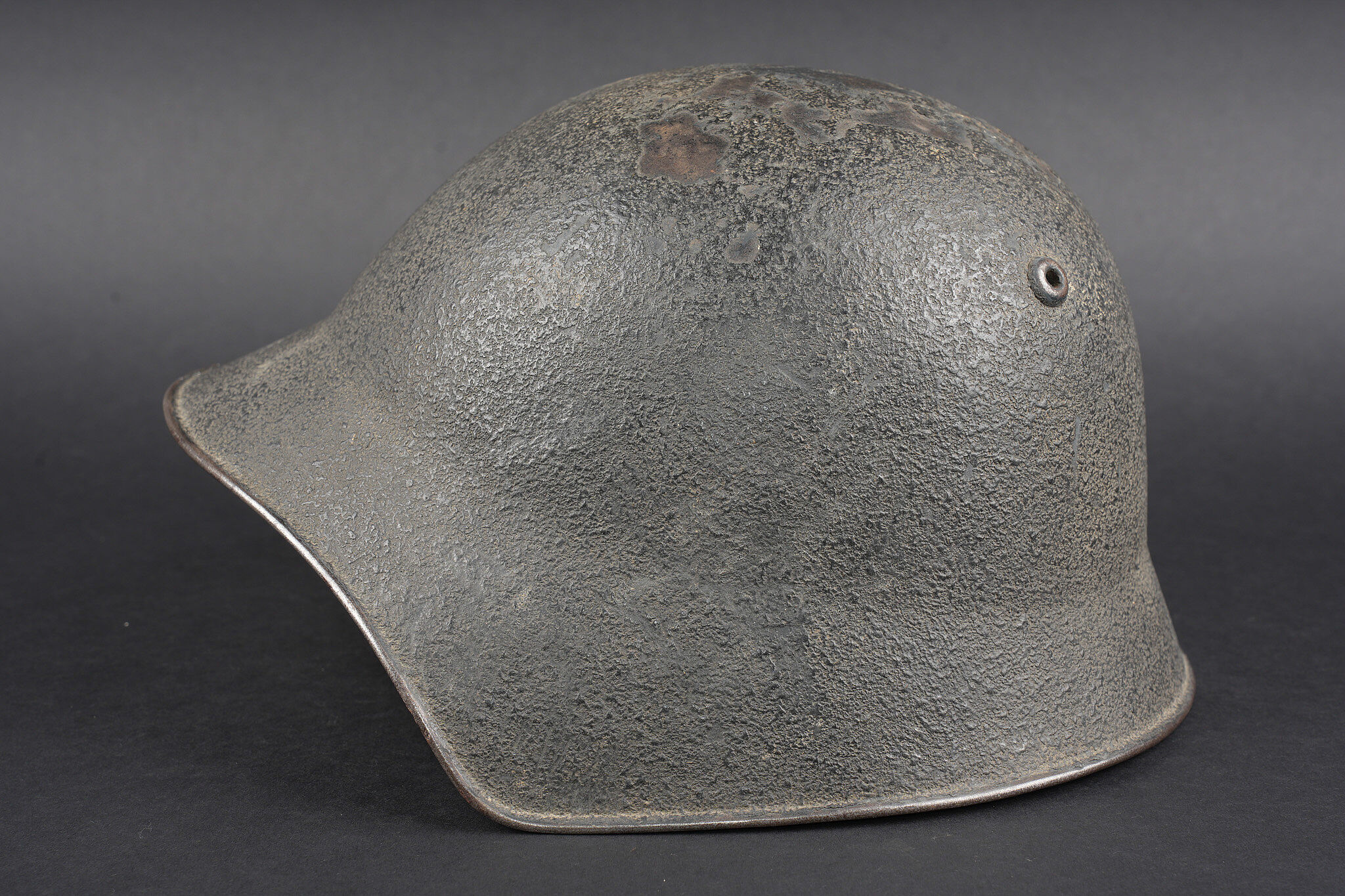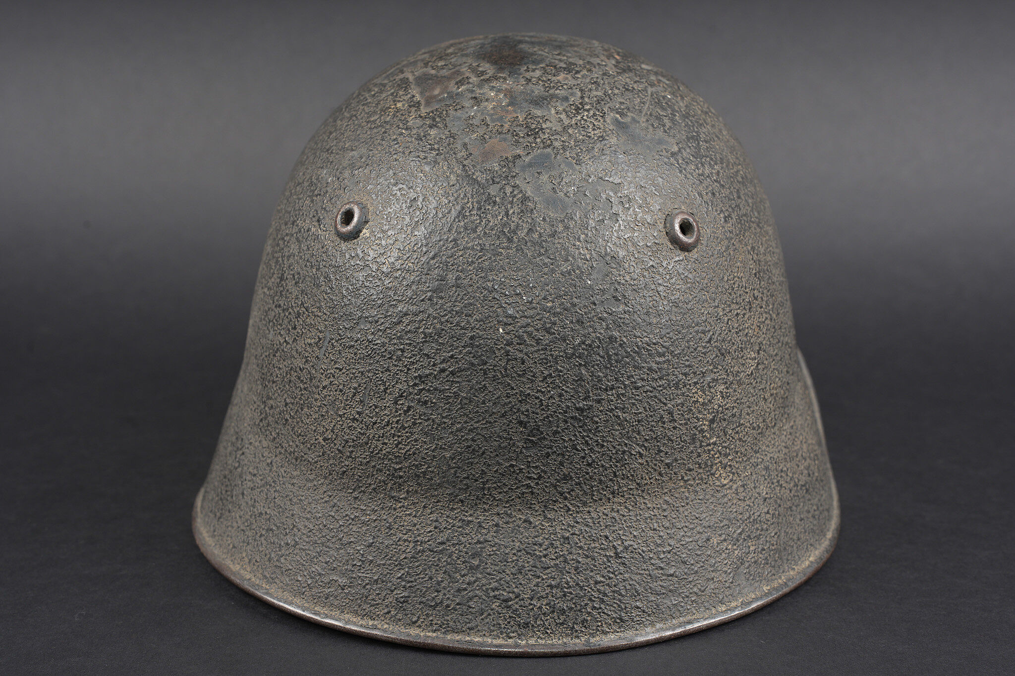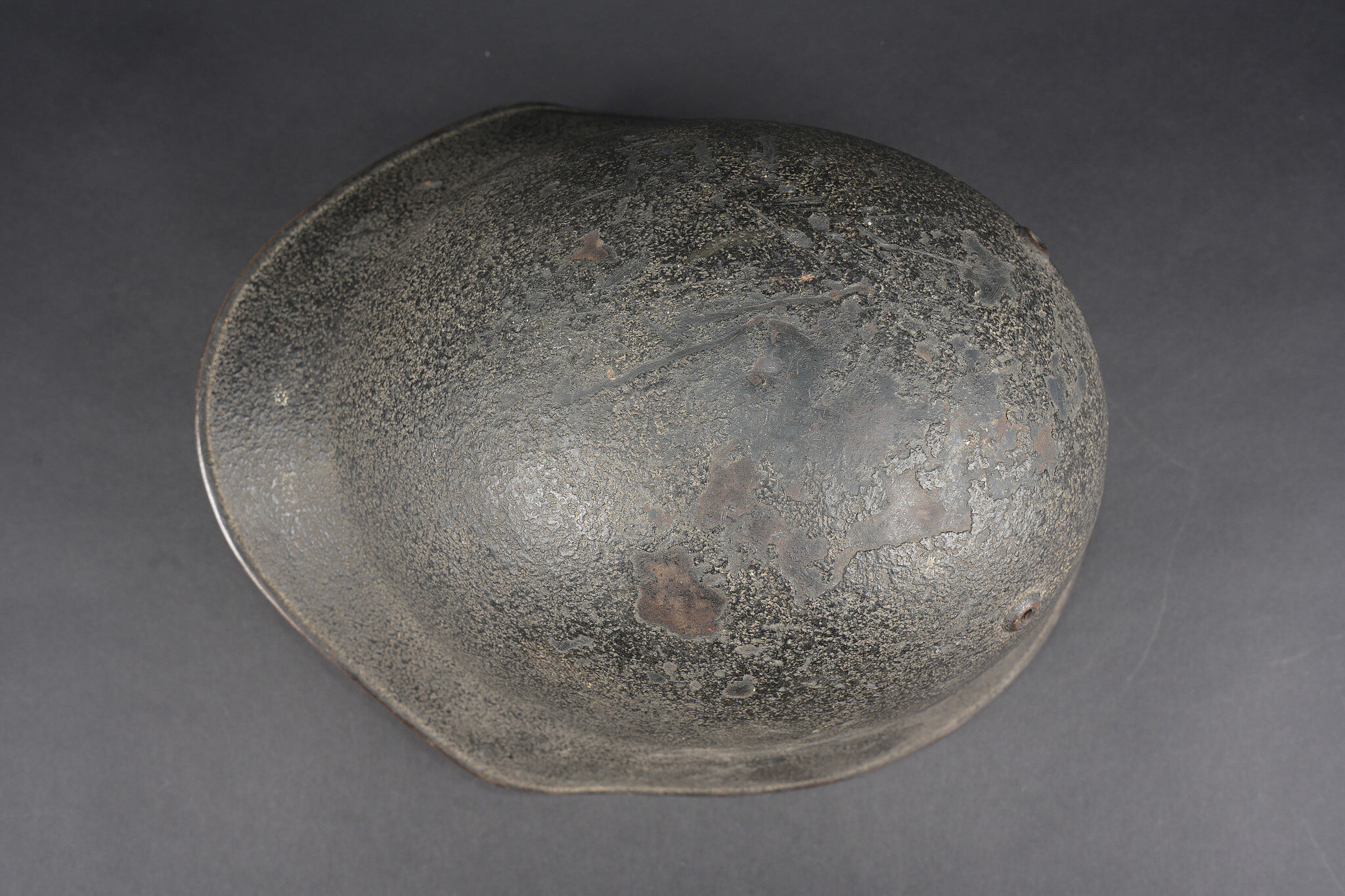 Suisse casque modèle 1918-43. Fabrication probable des années 50, avec sa coiffe à dents de loup à œillets, sa jugulaire et son disque d’identification nominatif. Swiss Model 1918-43 helmet. Probably 1950s manufacture, fitted with wolf’s teeth style liner with eyelets, complete with chinstrap and named identification disc.