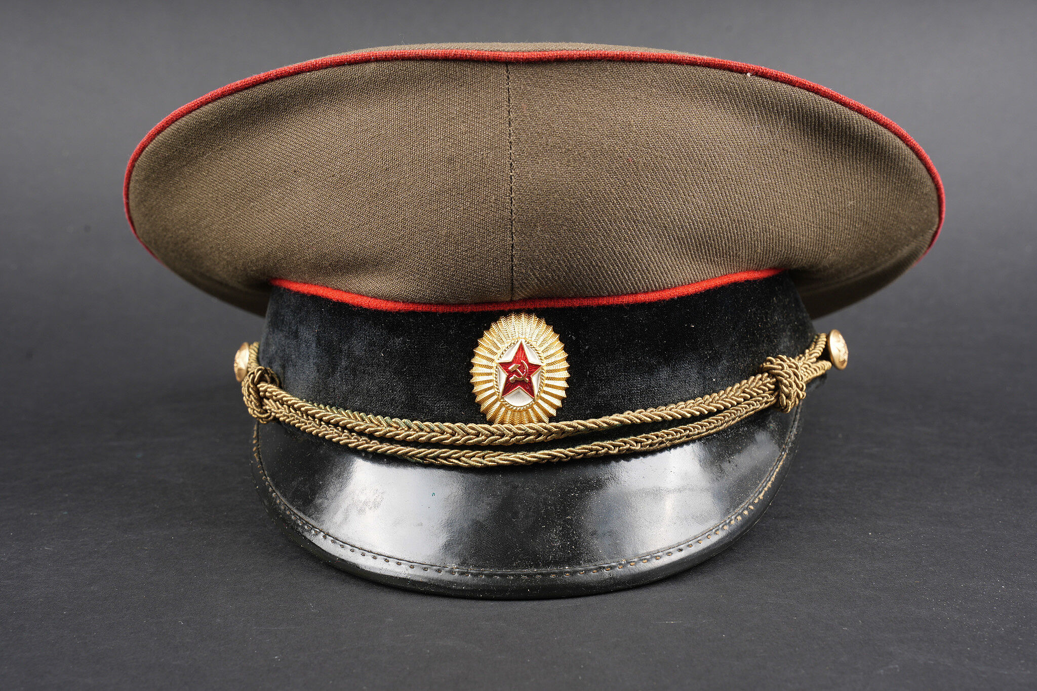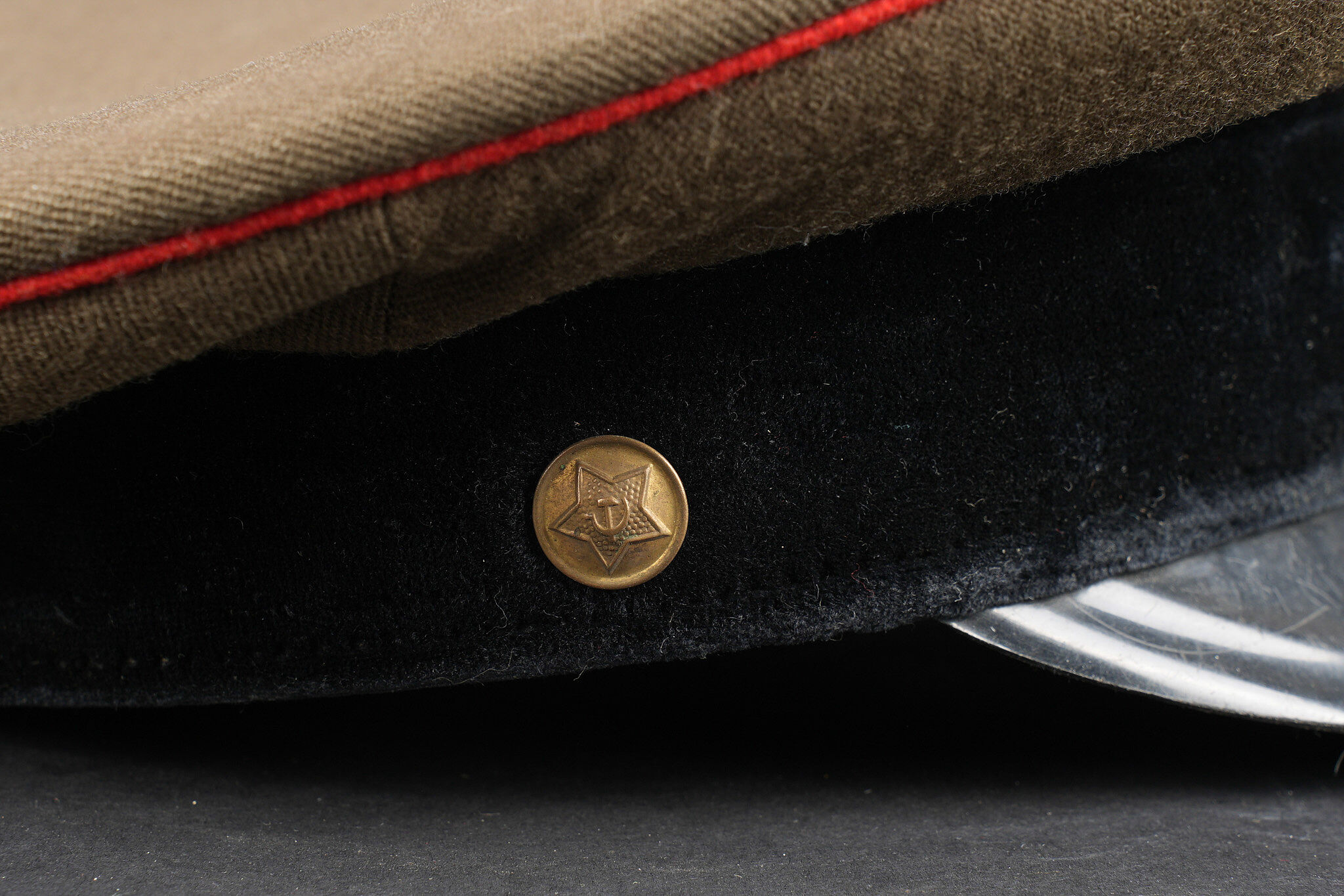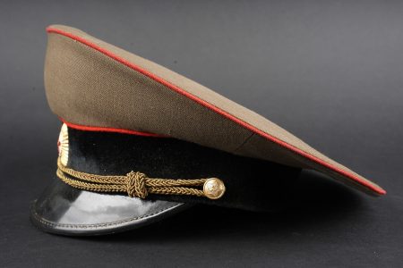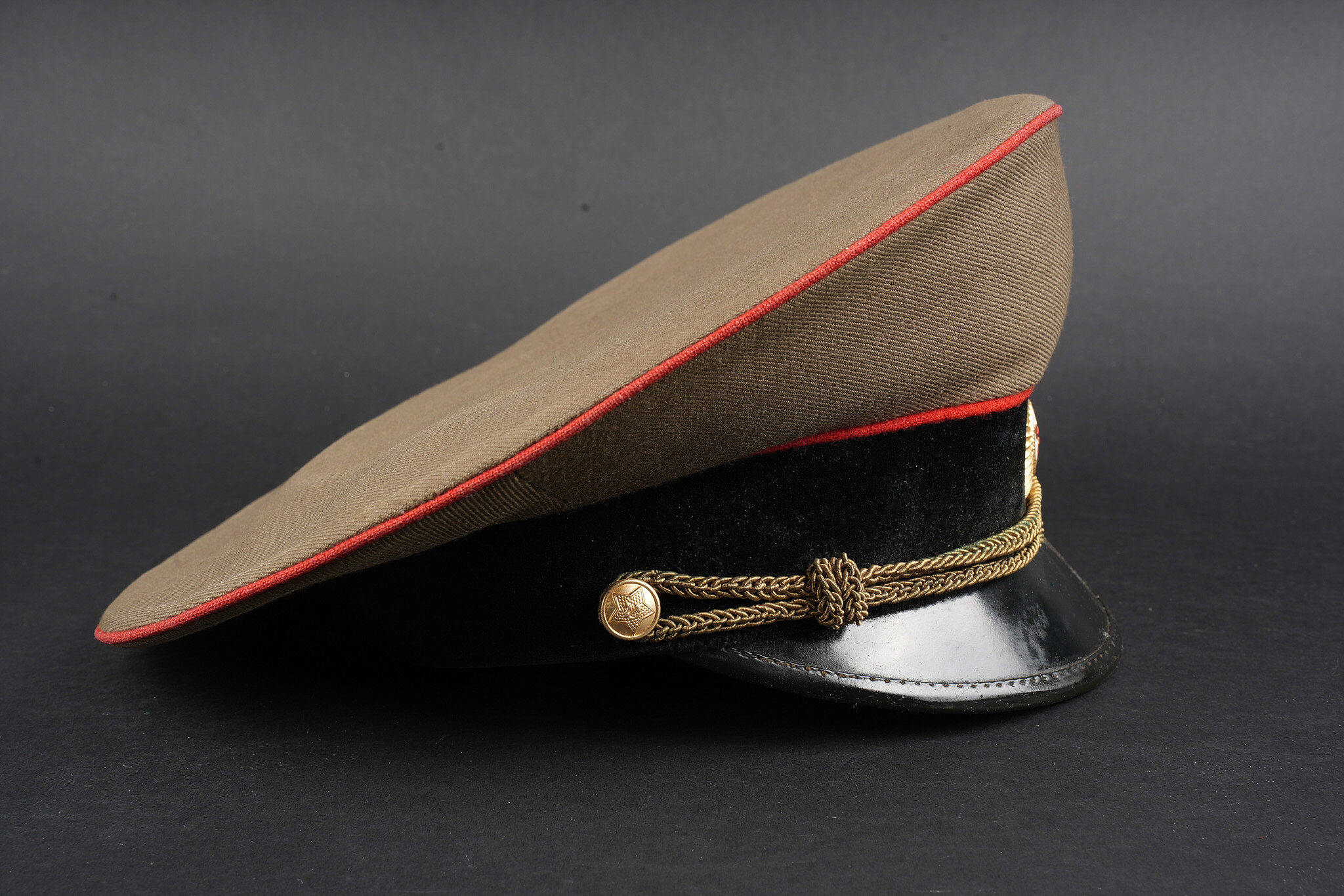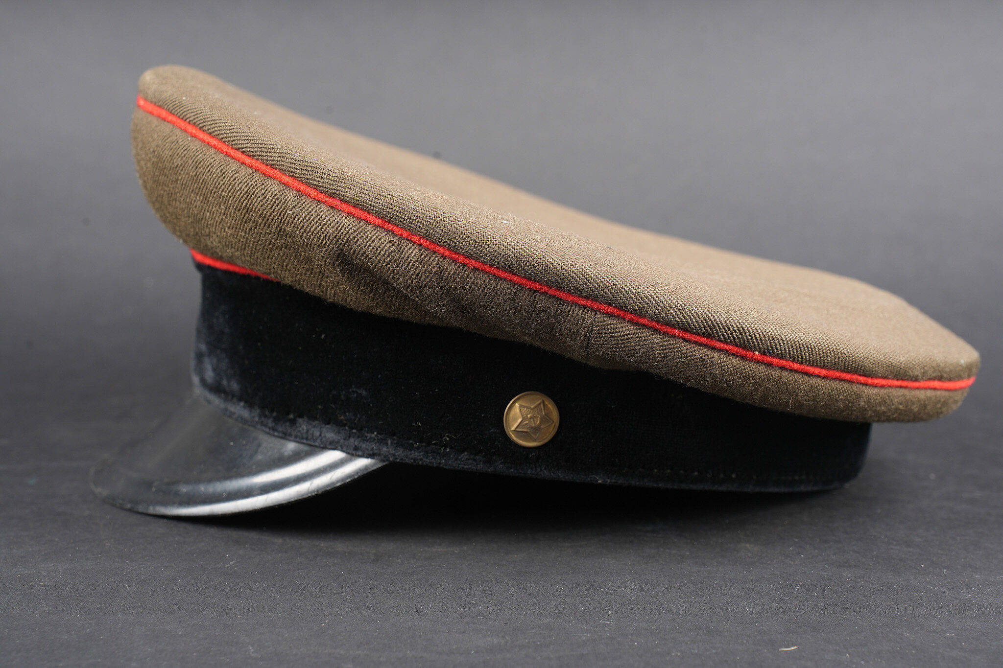 Détails de la vente >Lot de 2 casquettes russes période guerre froide. En tissu kaki, passepoils rouges, bandeau velours noir. Boutons à l’étoile soviétique, une datée 1958 avec jugulaire, l’autre... en savoir plus