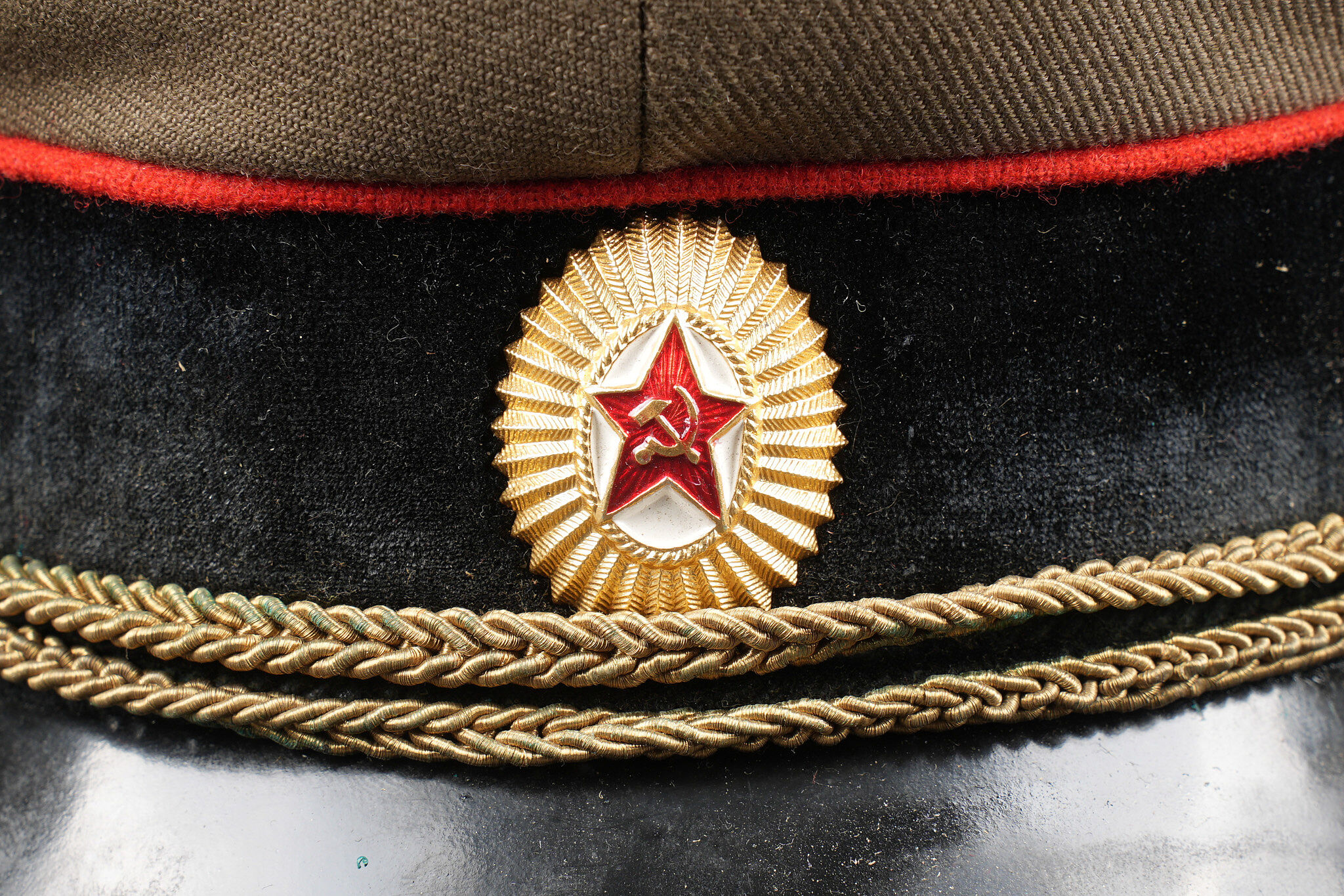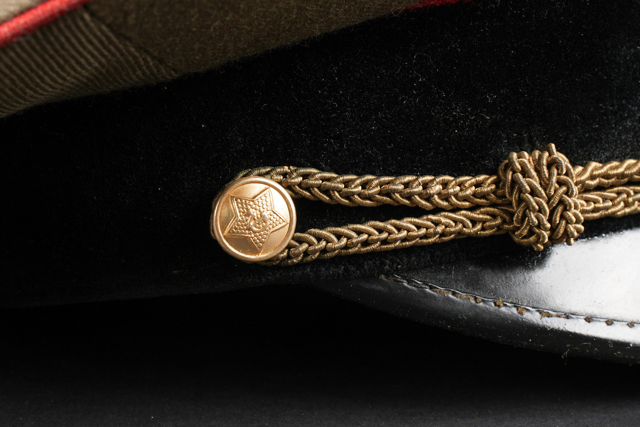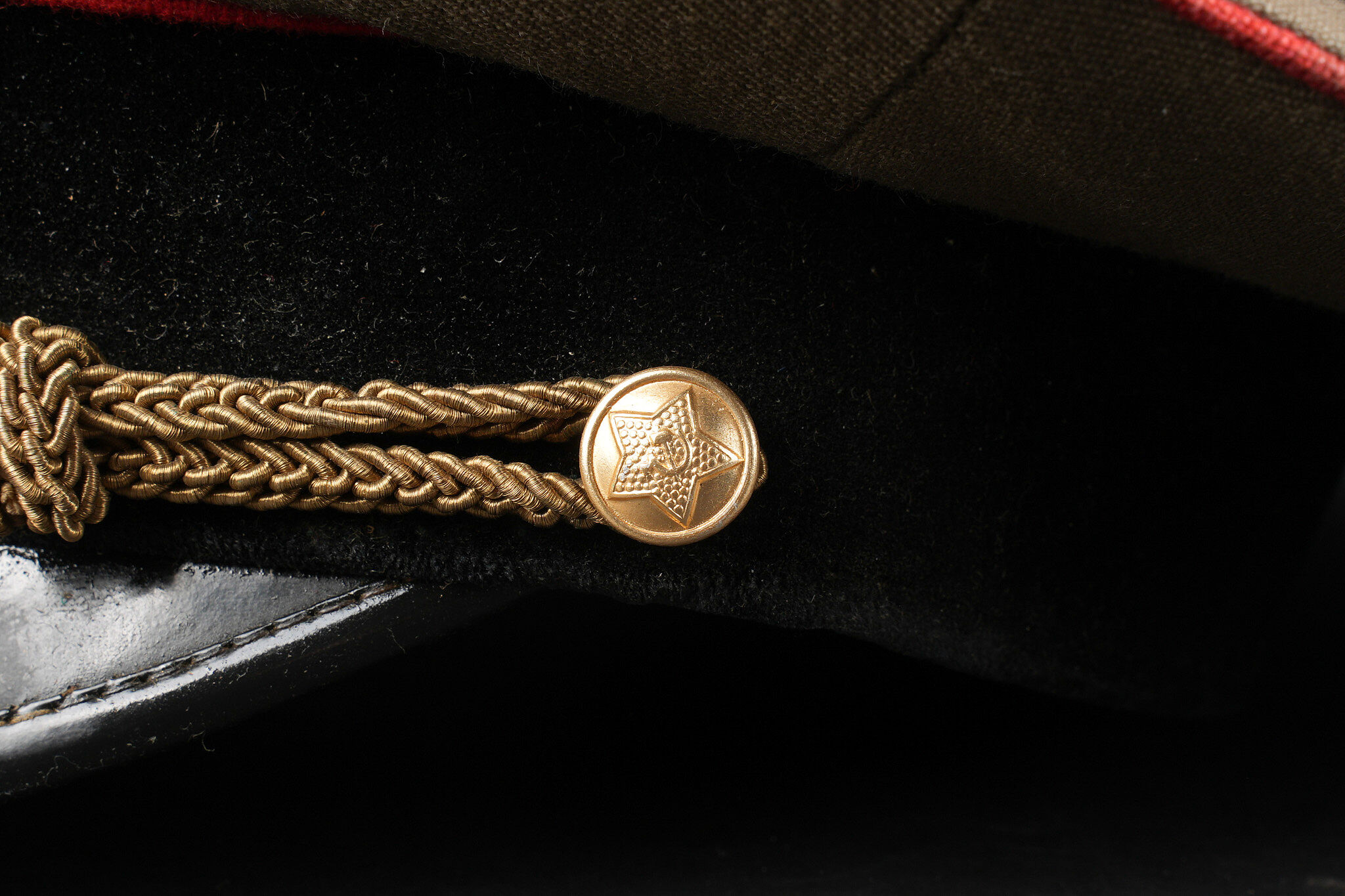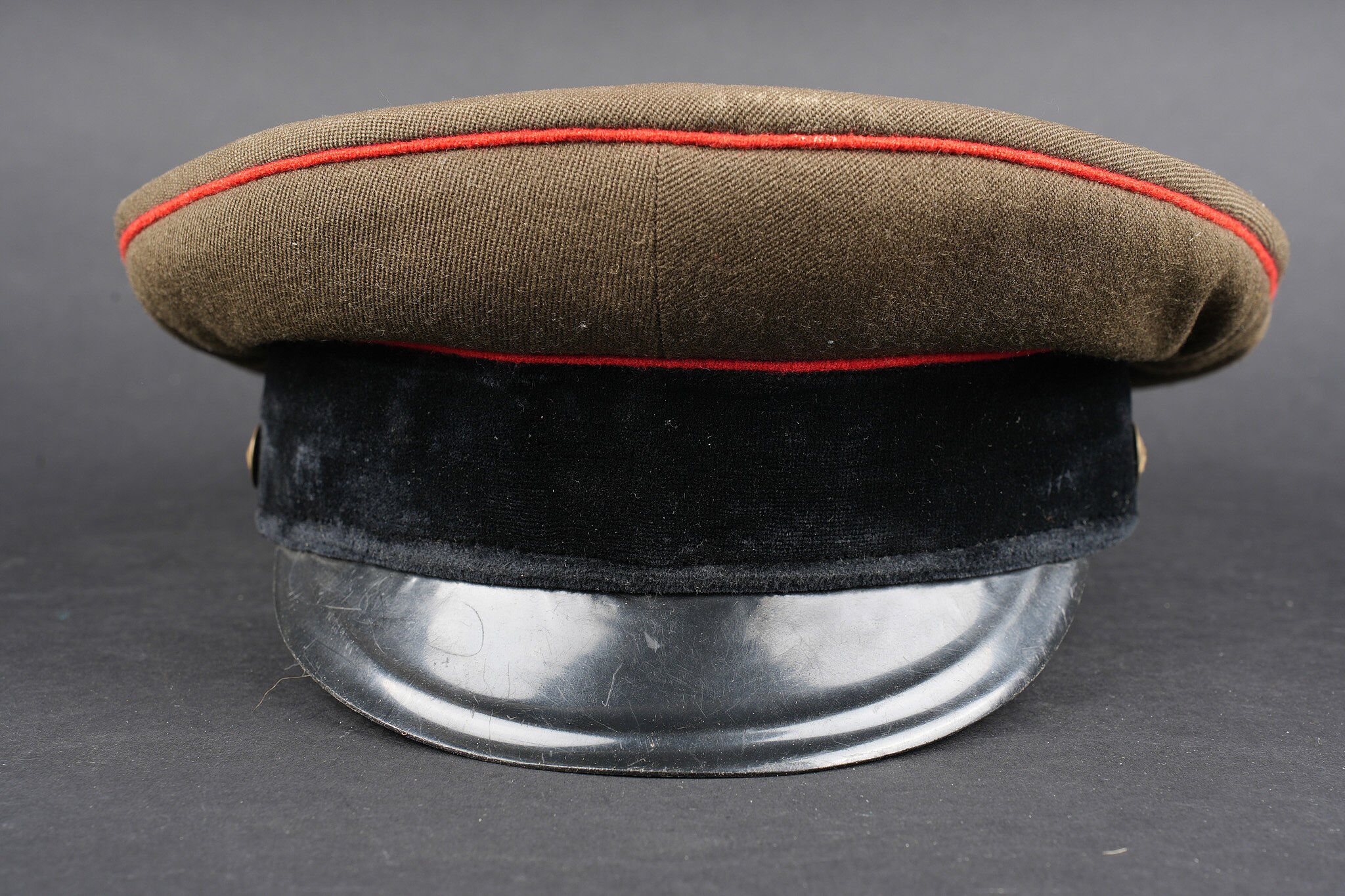 Détails de la vente >Lot de 2 casquettes russes période guerre froide. En tissu kaki, passepoils rouges, bandeau velours noir. Boutons à l’étoile soviétique, une datée 1958 avec jugulaire, l’autre... en savoir plus
