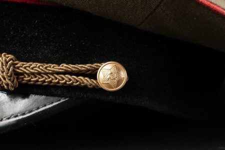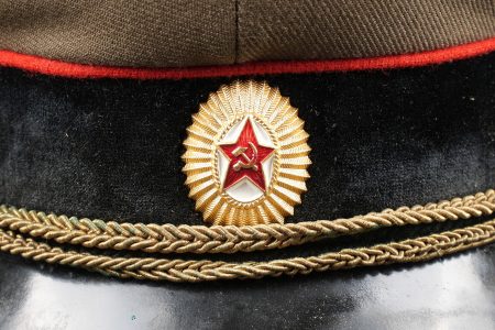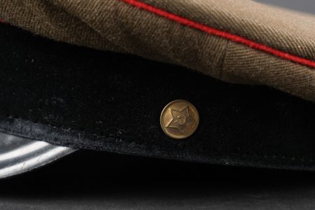 Lot de 2 casquettes russes période guerre froide. En tissu kaki, passepoils rouges, bandeau velours noir. Boutons à l’étoile soviétique, une datée 1958 avec jugulaire, l’autre... en savoir plus