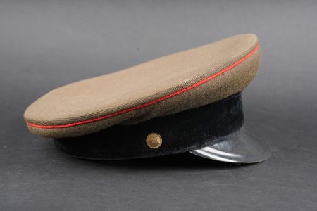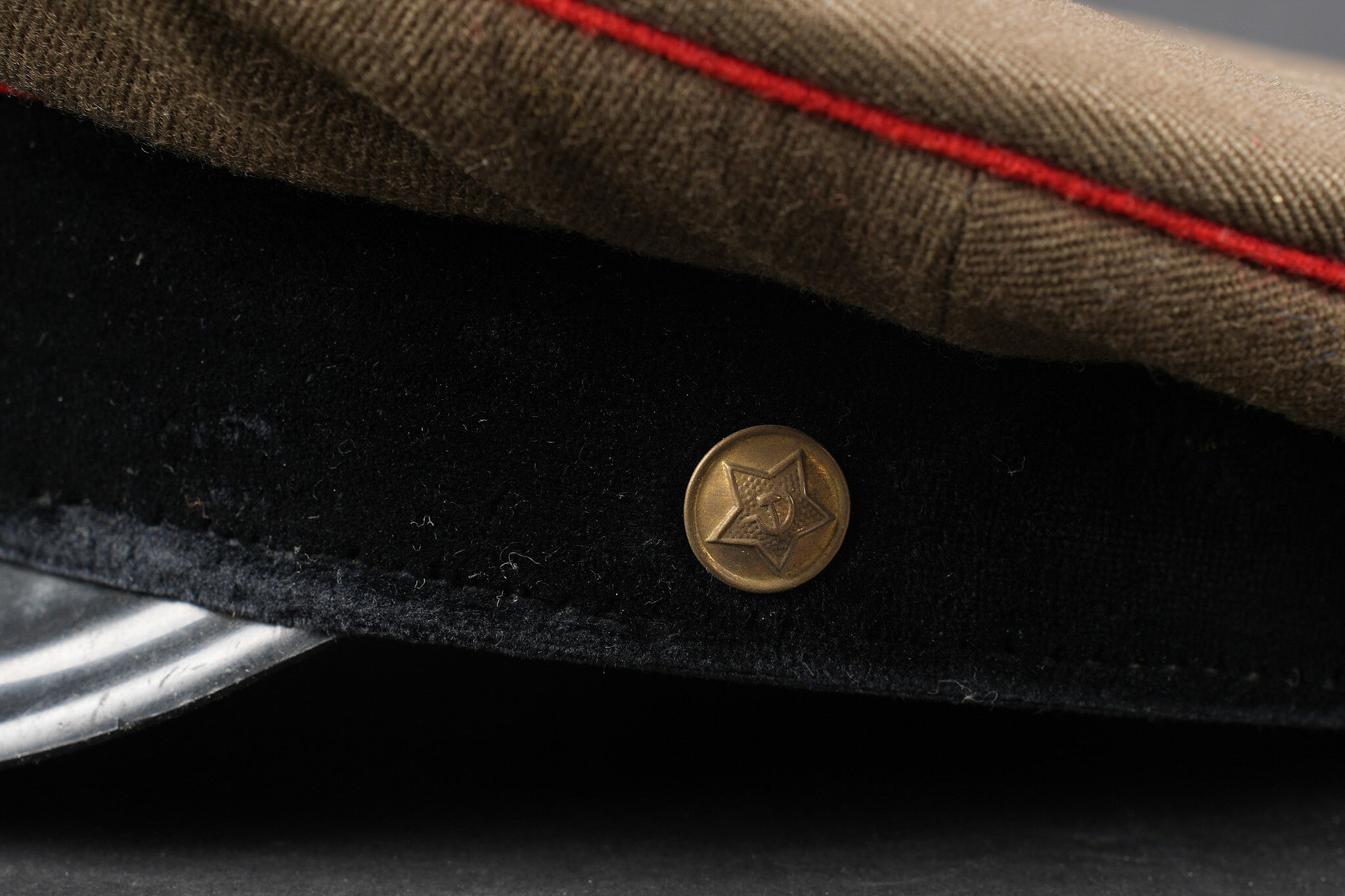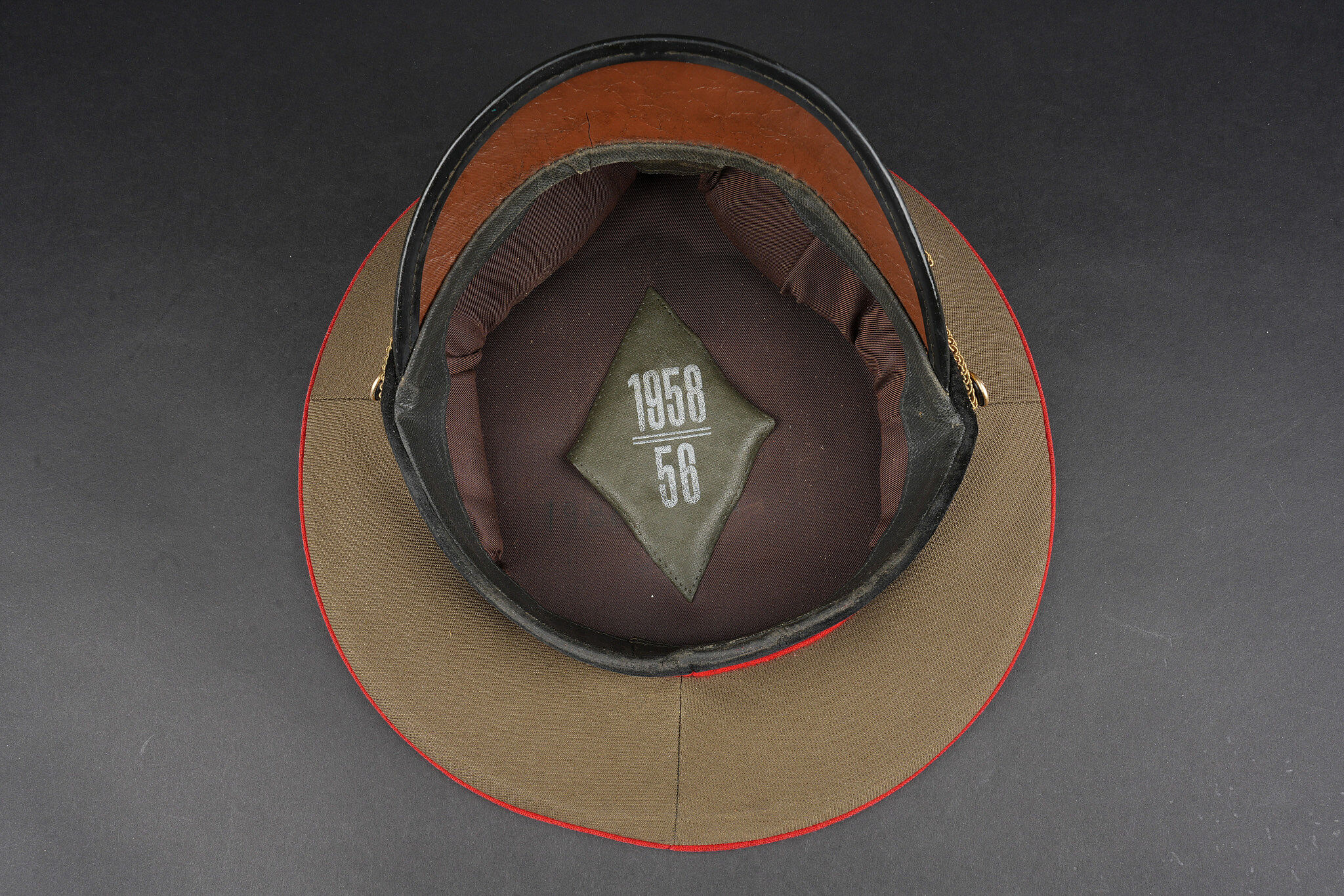 Lot de 2 casquettes russes période guerre froide. En tissu kaki, passepoils rouges, bandeau velours noir. Boutons à l’étoile soviétique, une datée 1958 avec jugulaire, l’autre sans. Usure d’usage. Lot of two Russian Cold War period service caps. Khaki cloth construction with red piping and black velvet band. Buttons bearing the Soviet star. One dated 1958 with chinstrap, the other without chinstrap. Service wear.