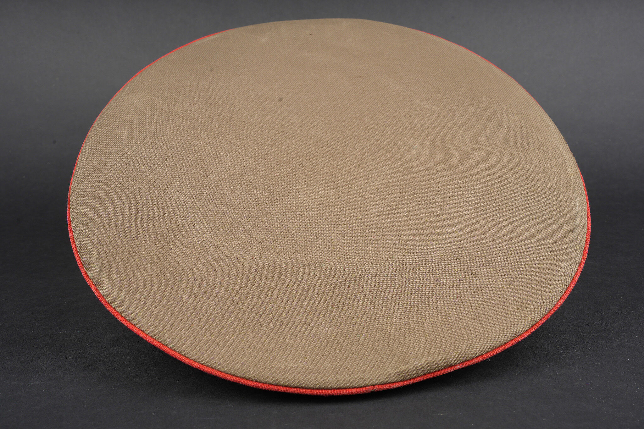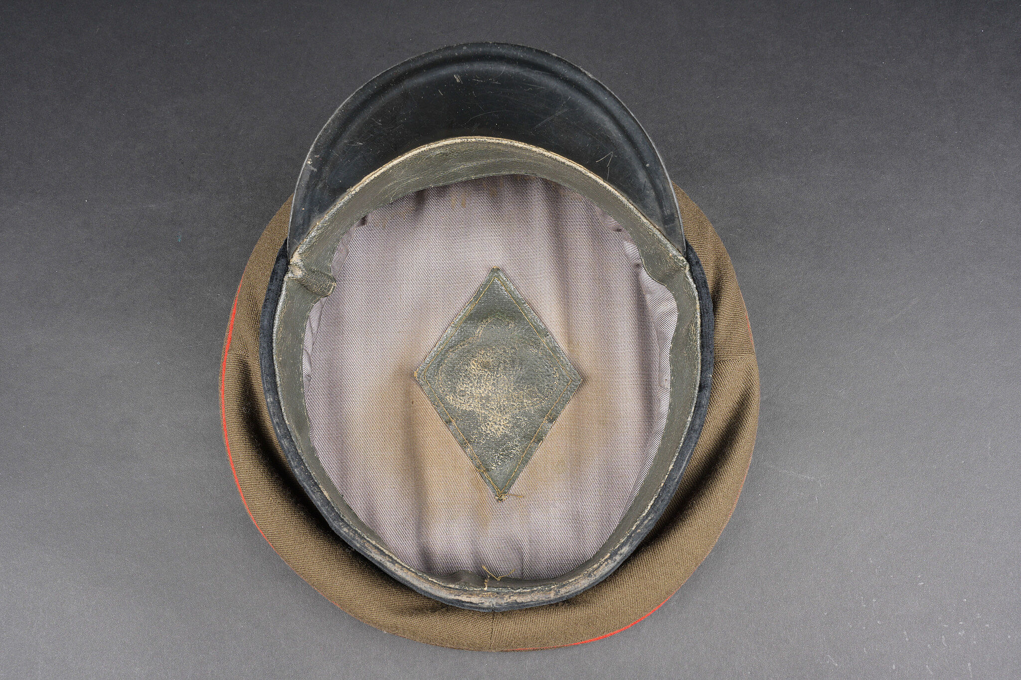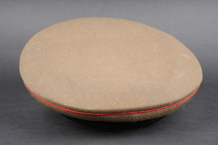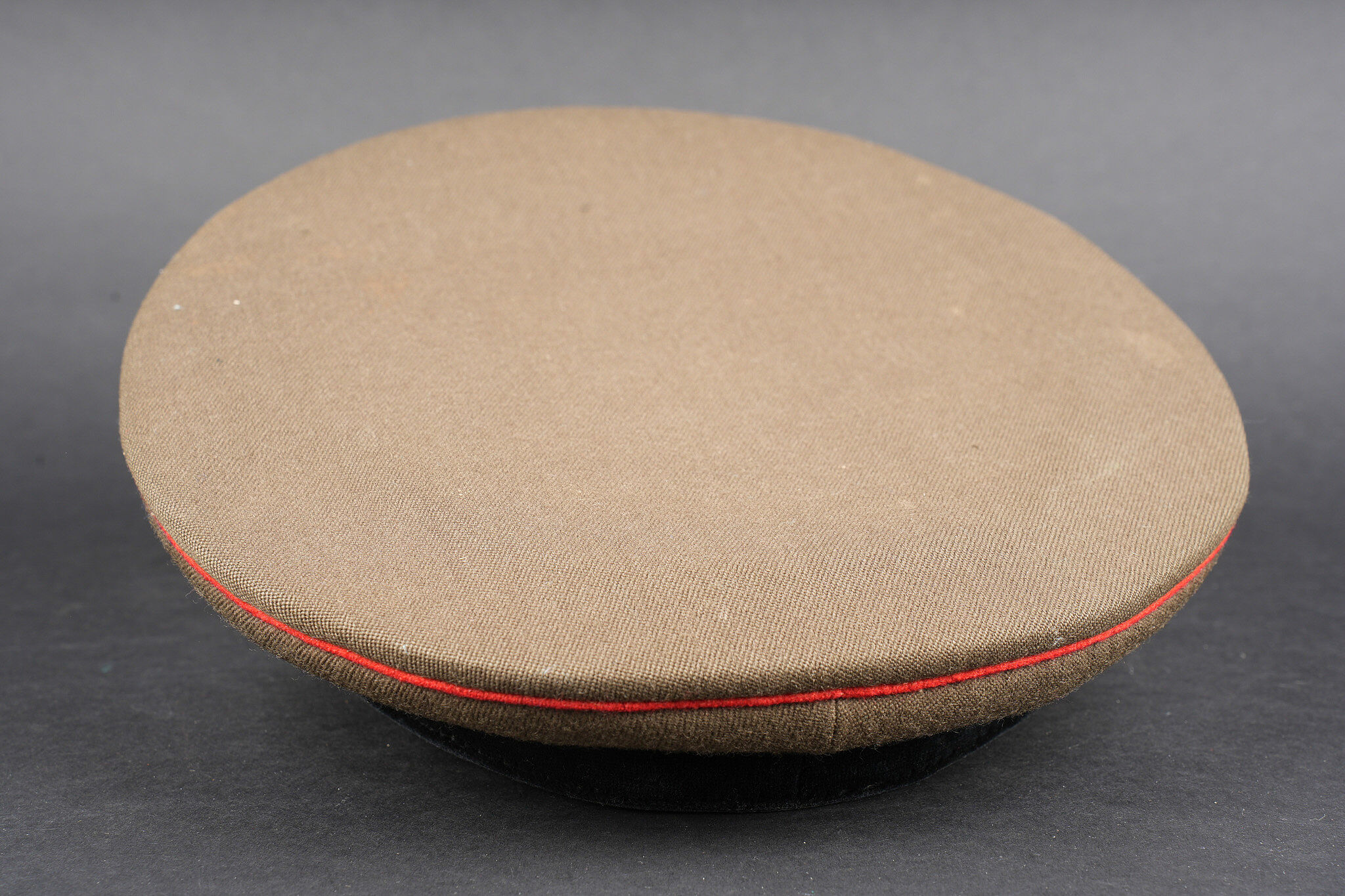 Lot de 2 casquettes russes période guerre froide. En tissu kaki, passepoils rouges, bandeau velours noir. Boutons à l’étoile soviétique, une datée 1958 avec jugulaire, l’autre sans. Usure d’usage. Lot of two Russian Cold War period service caps. Khaki cloth construction with red piping and black velvet band. Buttons bearing the Soviet star. One dated 1958 with chinstrap, the other without chinstrap. Service wear.