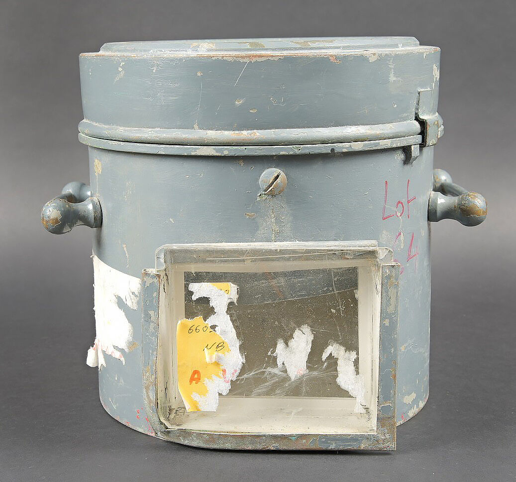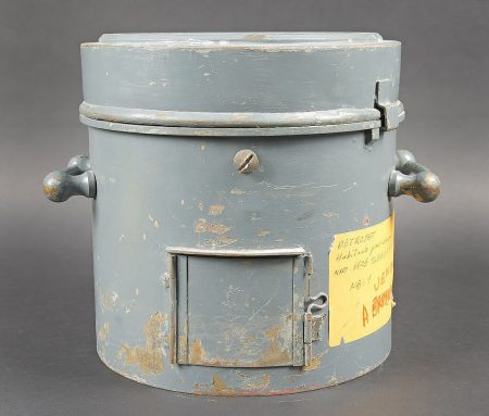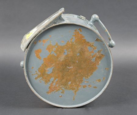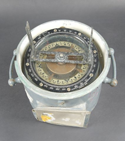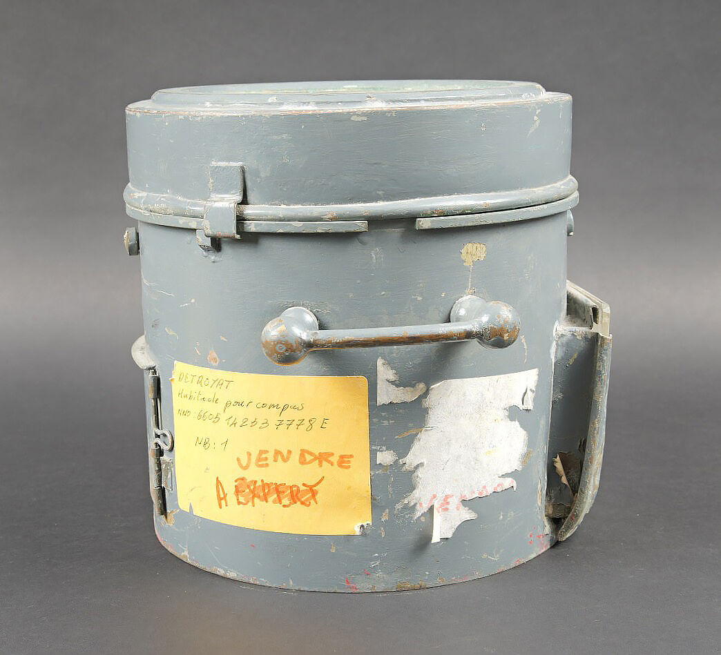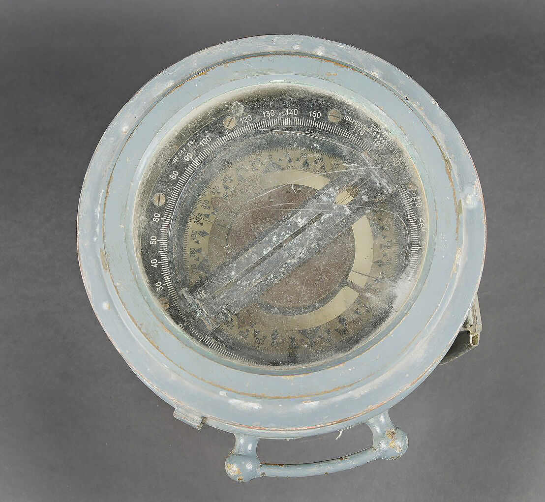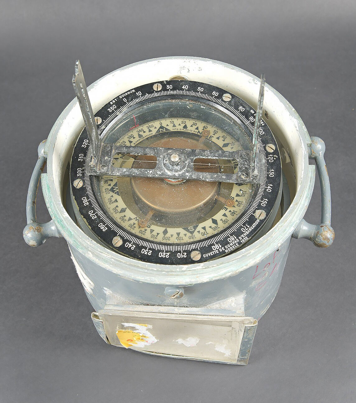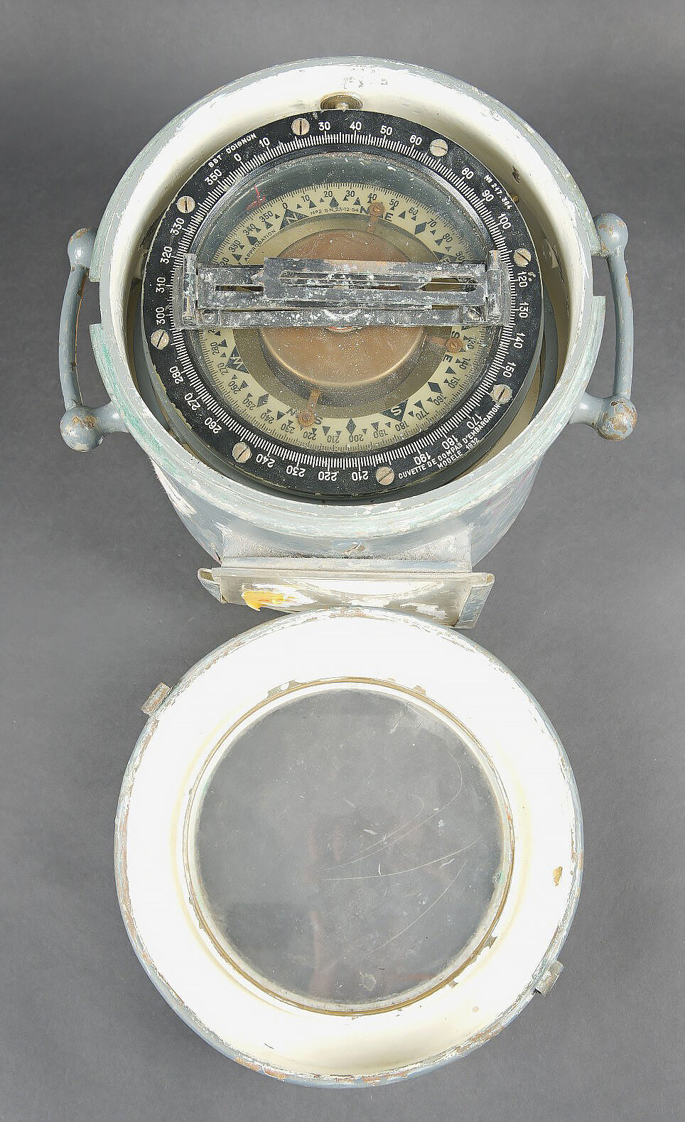 Compas de navigation français 1932. Compas en métal, le liquide est complet. Trois bulles d’air sont visibles. Marquages Cuvette de compas d’embarcation Modèle 1932. Boitier en métal, fortement déformé avec des bosses. Les poignées de fixation sont présentes. Verre complet. A noter une certaine usure et patine de la pièce. Etat II+. French navigation compass, 1932. Metal compass with complete liquid and three visible air bubbles. Marked Cuvette de compas d’embarcation Modèle 1932. Metal housing heavily dented with fixing handles present and complete glass. Noteworthy overall wear and an attractive period patina. Condition II+.