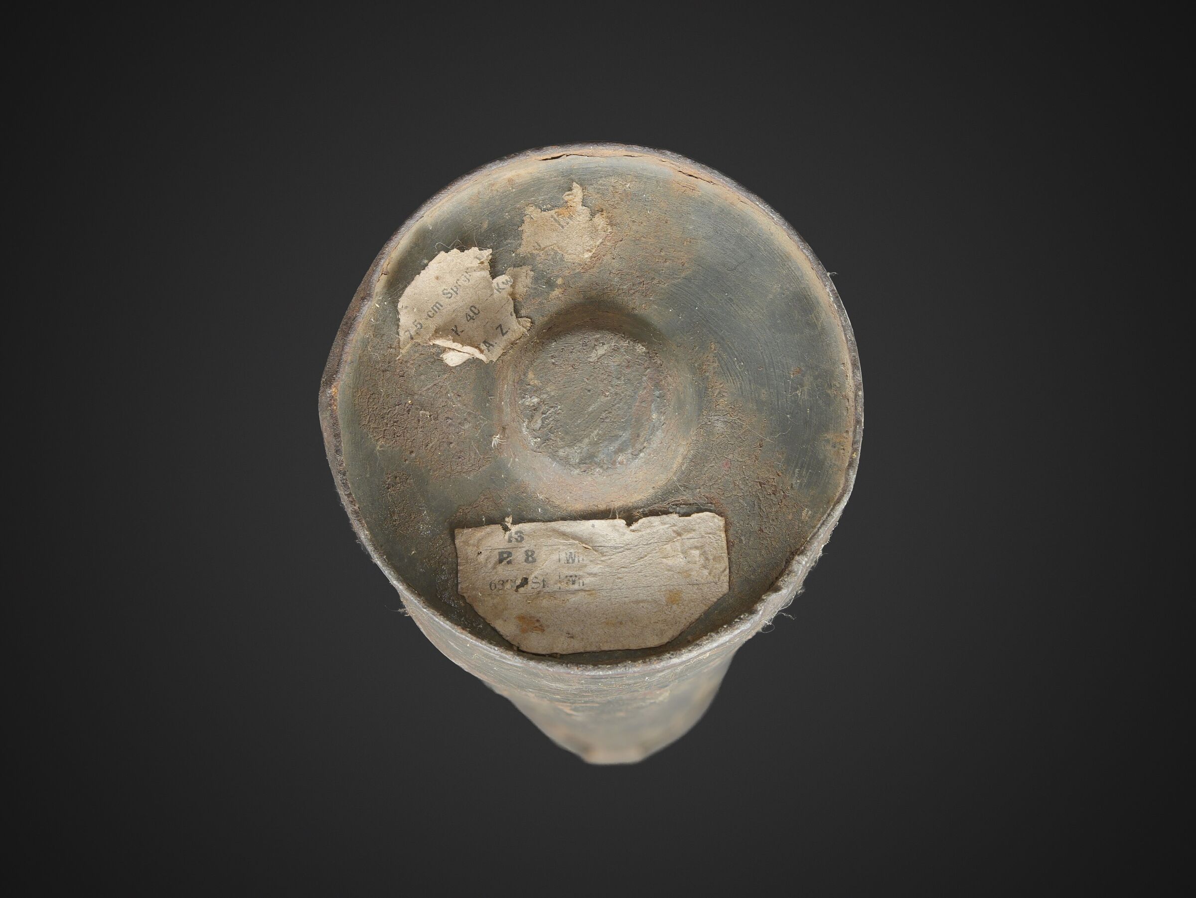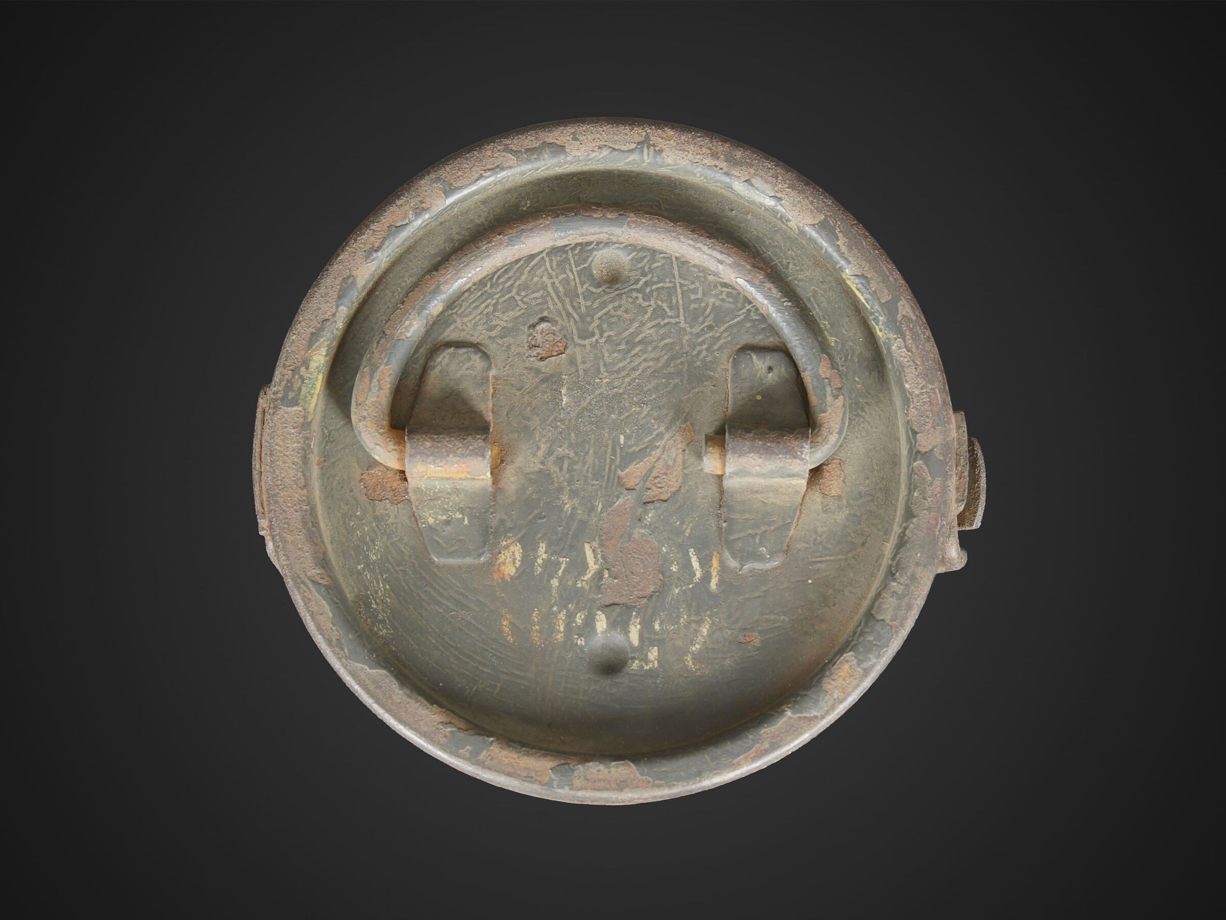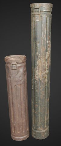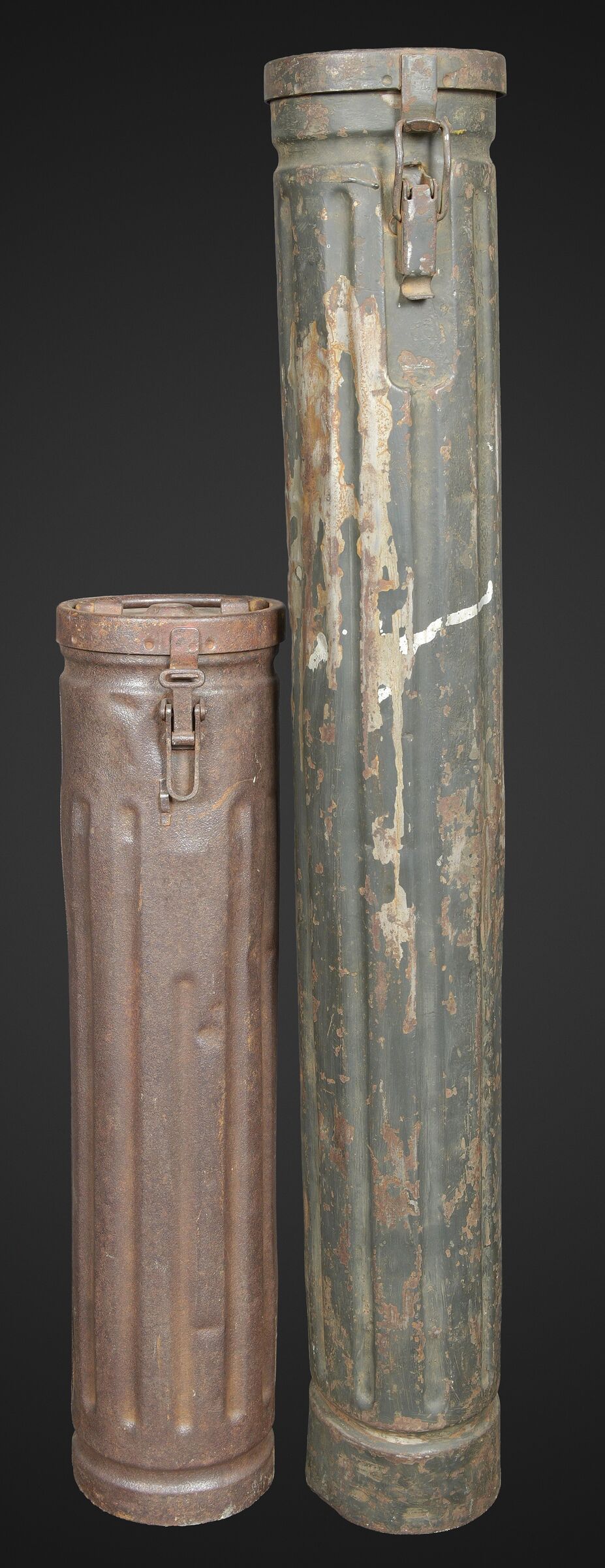 Containers à obus. Deux modèles différents de container en métal. Les couvercles sont présents. Les crochets de fermeture sont complets, ainsi que les poignées de transport. Les marquages sont illisibles. A noter une certaine usure et patine des pièces, ainsi que des bosses. Etat II+. Shell containers Two different metal models with lids, complete locking hooks and carrying handles. Markings illegible. Showing normal wear, dents and patina. Condition II+.