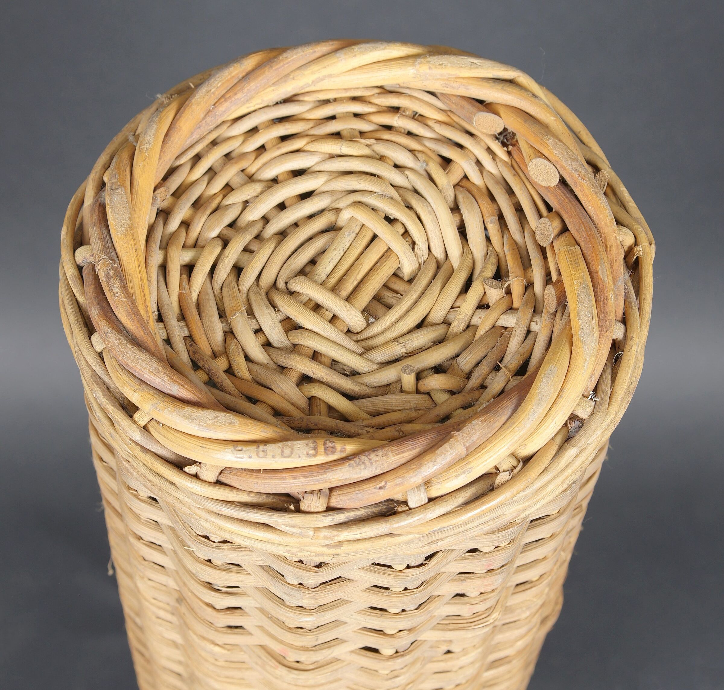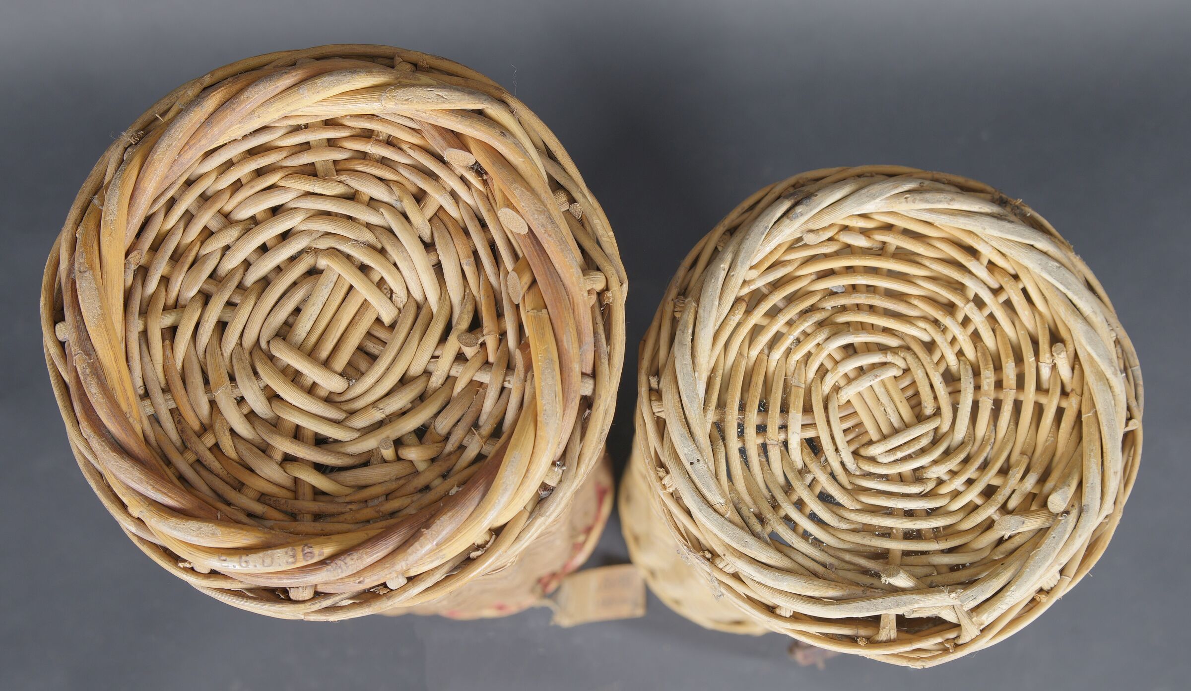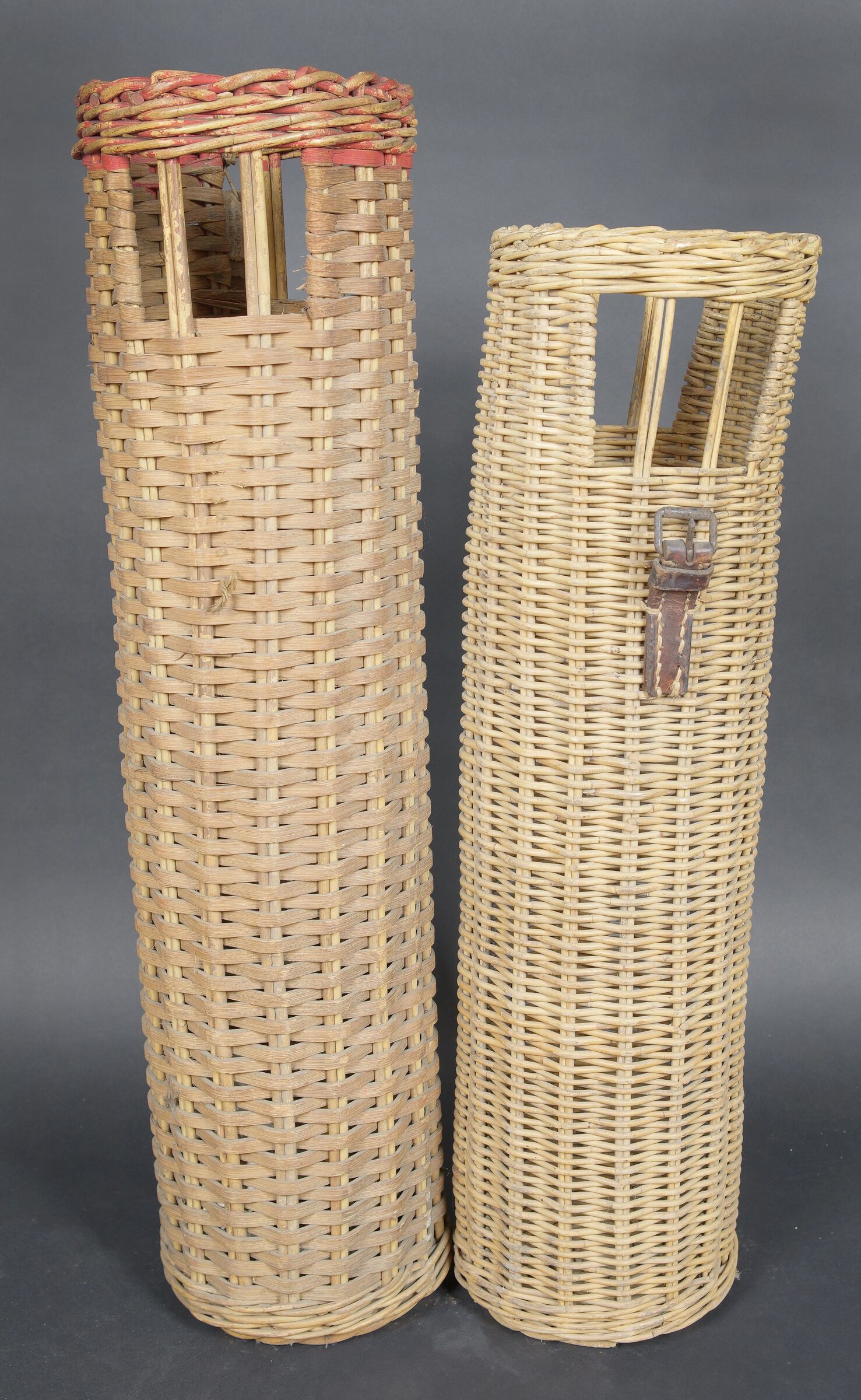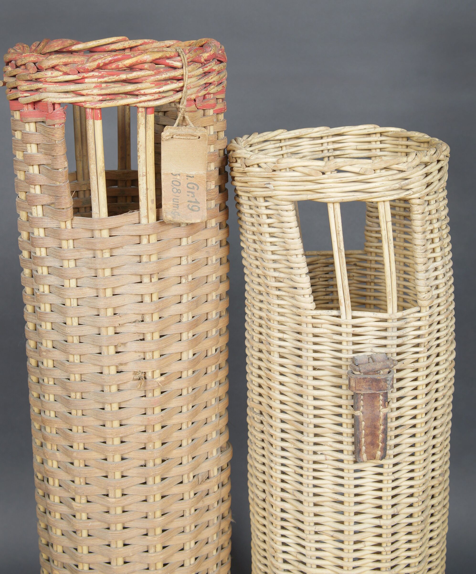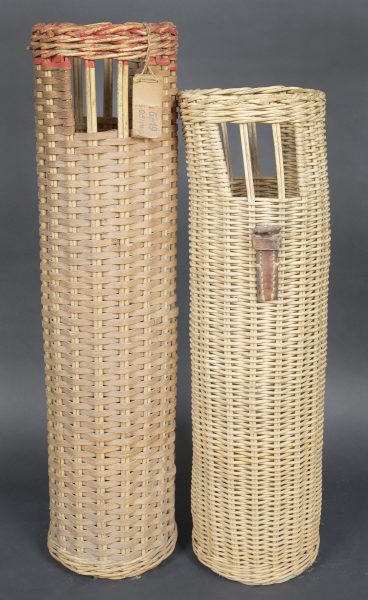 Containers en osier pour le transport des obus. Deux modèles différents de panier. Les couvercles sont manquants. Reste d’étiquette sur un container. Seul un tube dispose d’une partie de ses sangles en cuir. Fabrication 1936. A noter une certaine usure et patine des pièces. Etat II+. Wicker shell transport baskets Two different wicker basket models, both without lids. Remains of label on one example. Only one retains part of its leather carrying straps. Dated 1936. Showing normal wear and patina. Condition II+.