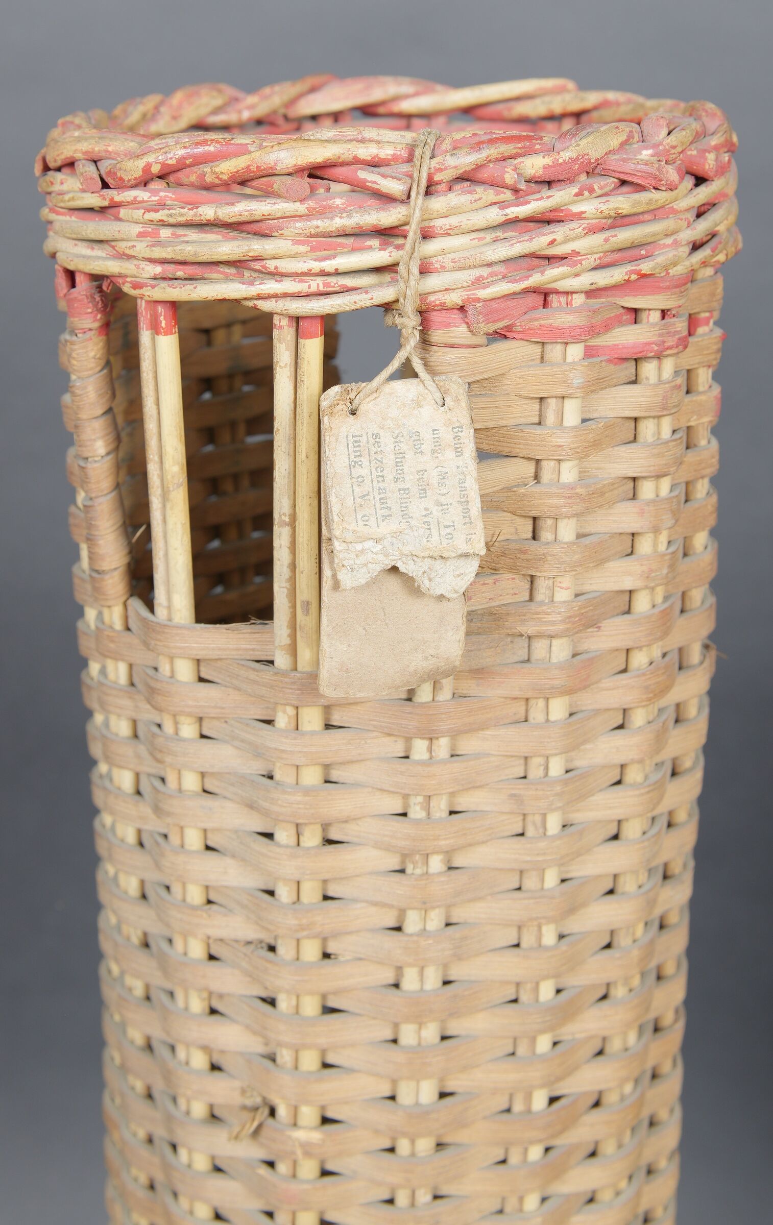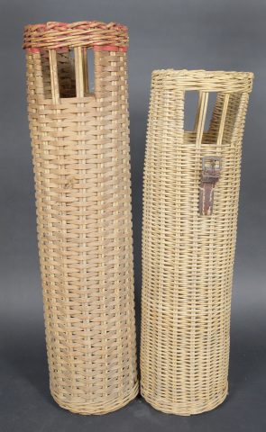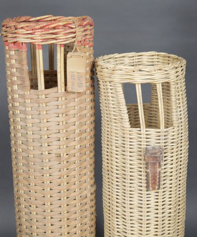 Détails de la vente >Containers en osier pour le transport des obus. Deux modèles différents de panier. Les couvercles sont manquants. Reste d’étiquette sur un container. Seul un tube dispose d’une... en savoir plus
