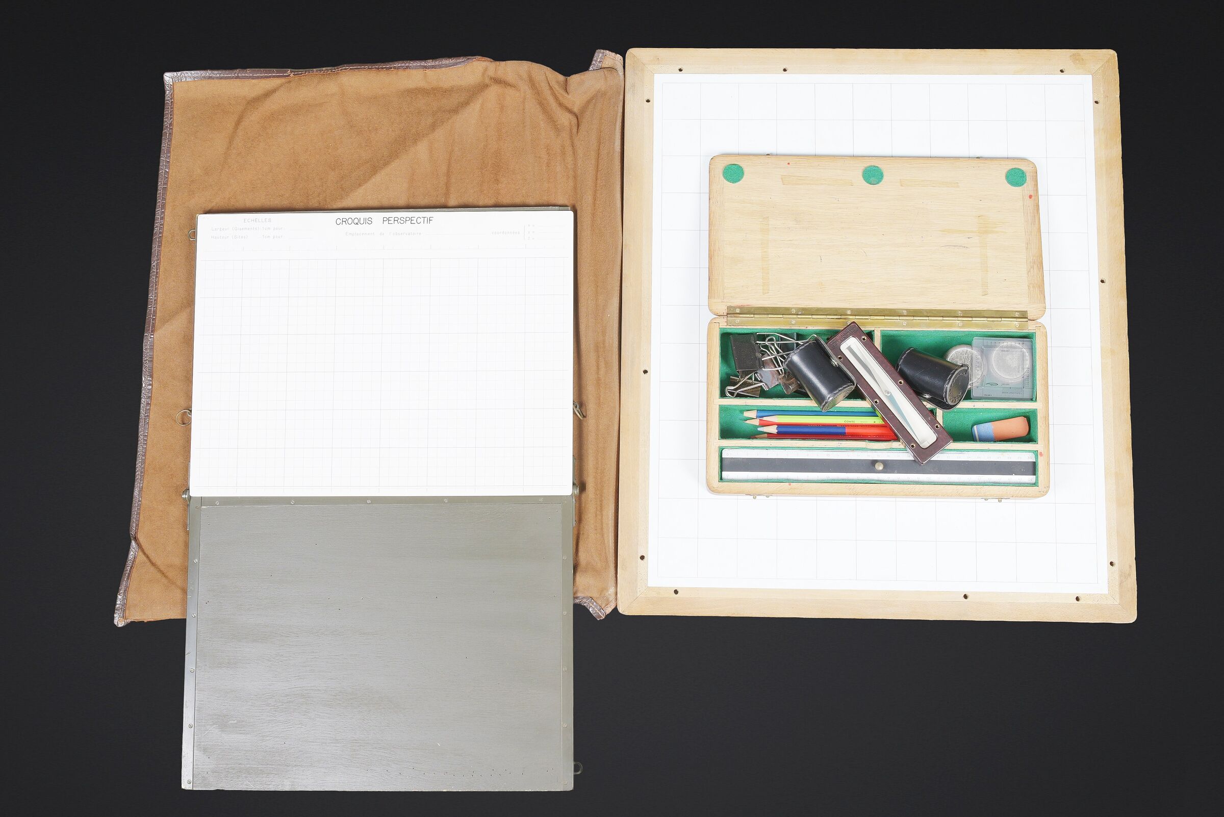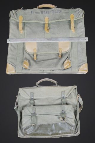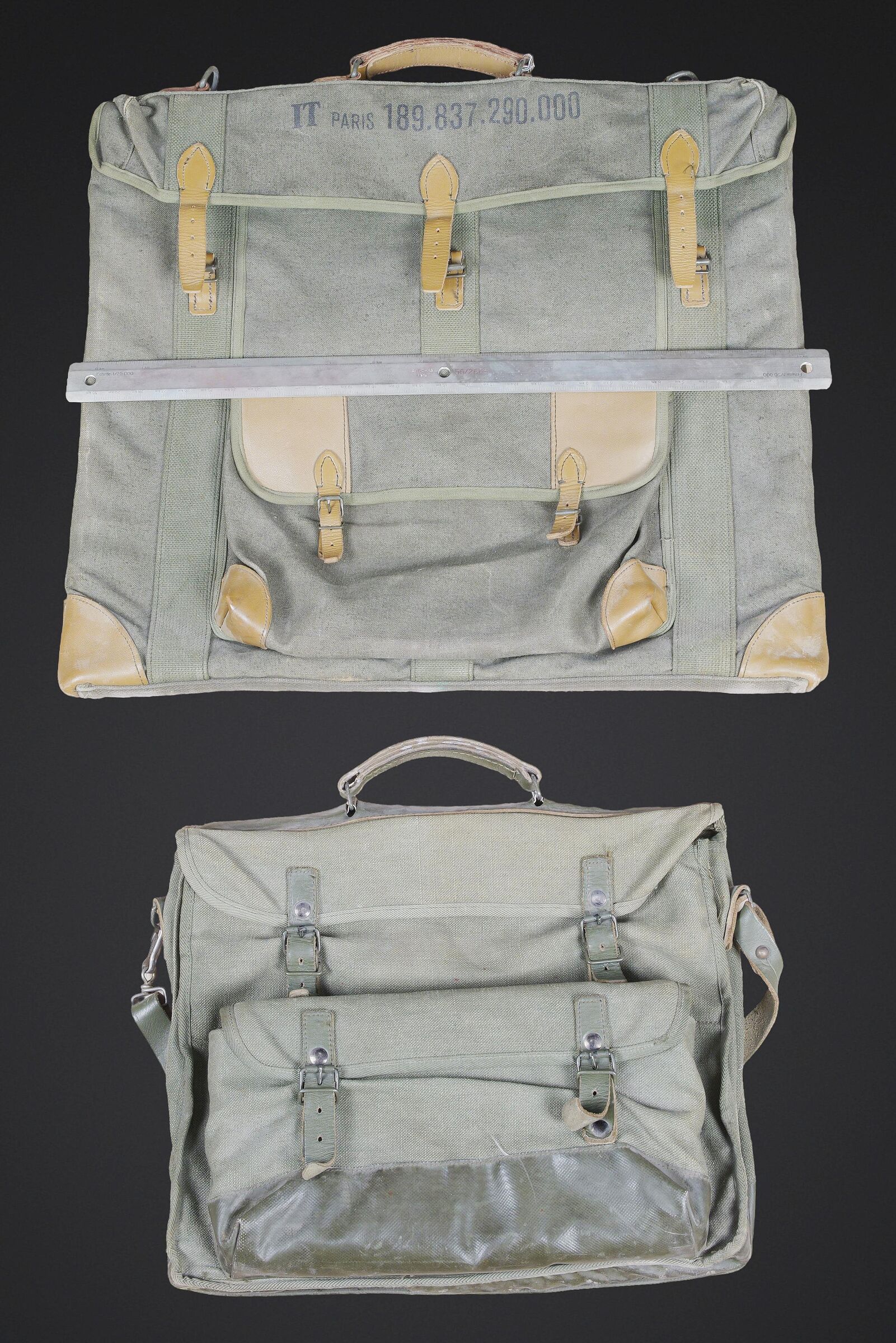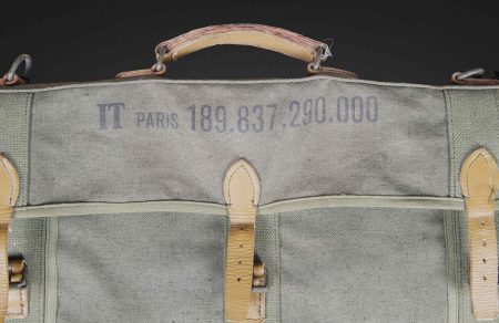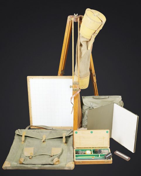 Equipement du génie. Comprenant Une housse en toile kaki et cuir fauve. La sangle de transport est présente. Trépied en bois et laiton. Trois pointes de fixation au sol. Sans marquages visibles. Modèle de trépied permettant de fixer une table. Housse en forte toile kaki et cuir marron. La sangle de transport est présente. Marquages IT Paris 189-837-290-000. Contenant une table d’artillerie ou génie en bois. Une sacoche en forte toile kaki avec sa sangle de transport. Contenant de nombreux accessoires. A noter une certaine usure et patine de la pièce. Etat II+. Engineer equipment set. Comprising a khaki canvas and fawn leather cover with carrying strap, a wooden and brass tripod with three ground spikes for mounting a table, a heavy khaki canvas and brown leather cover marked IT Paris 189-837-290-000 containing a wooden artillery or engineer table, and a khaki canvas satchel with numerous accessories. Noteworthy overall wear and an attractive period patina. Condition II+.