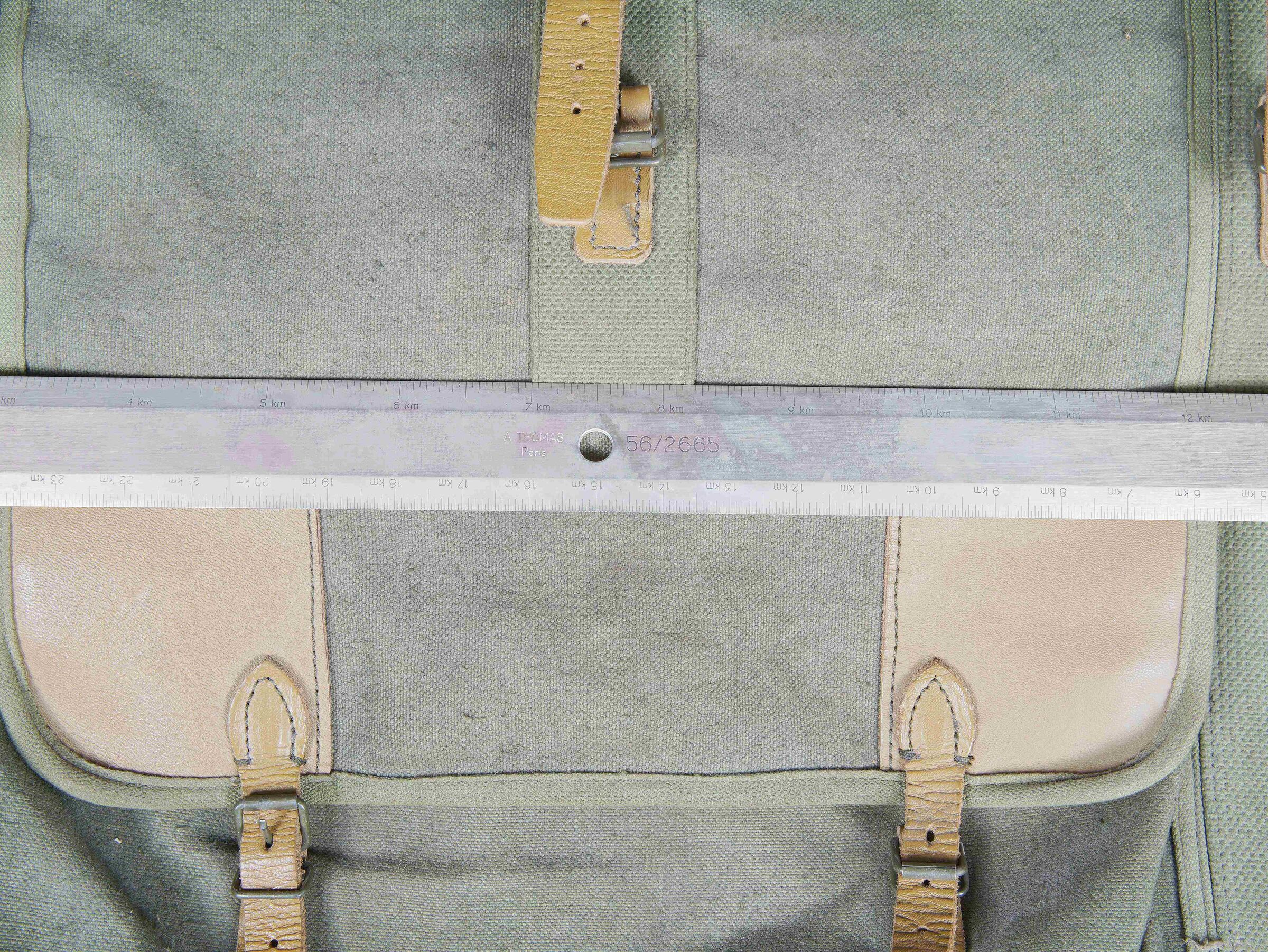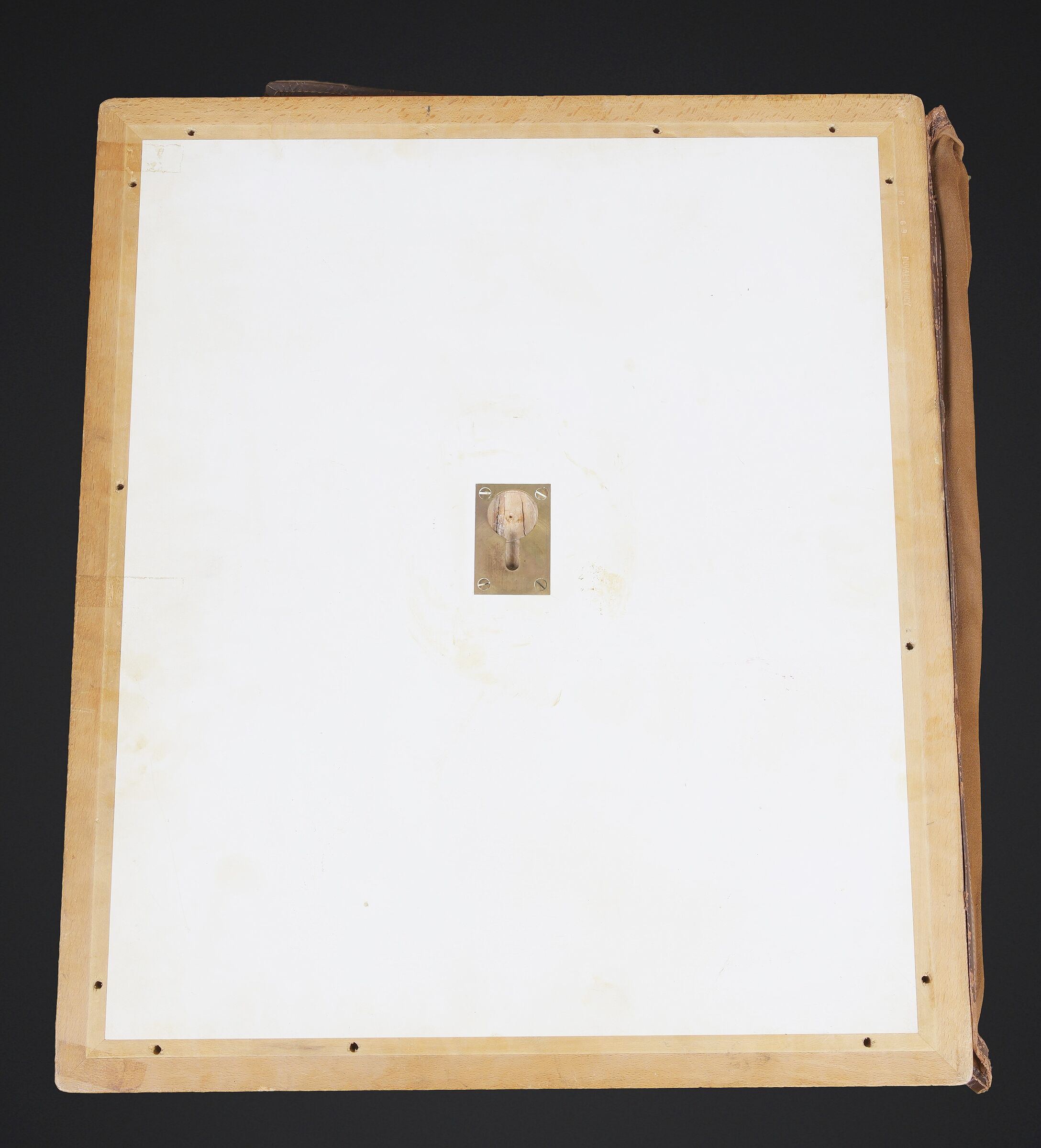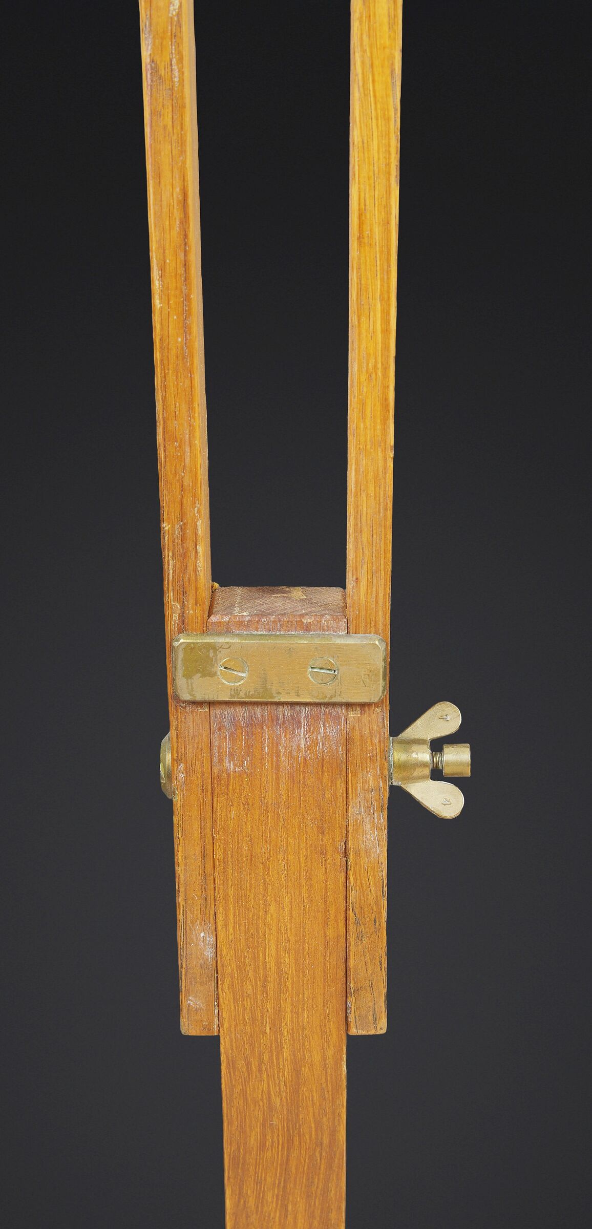 Equipement du génie. Comprenant Une housse en toile kaki et cuir fauve. La sangle de transport est présente. Trépied en bois et laiton. Trois pointes de fixation au sol. Sans marquages visibles. Modèle de trépied permettant de fixer une table. Housse en forte toile kaki et cuir marron. La sangle de transport est présente. Marquages IT Paris 189-837-290-000. Contenant une table d’artillerie ou génie en bois. Une sacoche en forte toile kaki avec sa sangle de transport. Contenant de nombreux accessoires. A noter une certaine usure et patine de la pièce. Etat II+. Engineer equipment set. Comprising a khaki canvas and fawn leather cover with carrying strap, a wooden and brass tripod with three ground spikes for mounting a table, a heavy khaki canvas and brown leather cover marked IT Paris 189-837-290-000 containing a wooden artillery or engineer table, and a khaki canvas satchel with numerous accessories. Noteworthy overall wear and an attractive period patina. Condition II+.