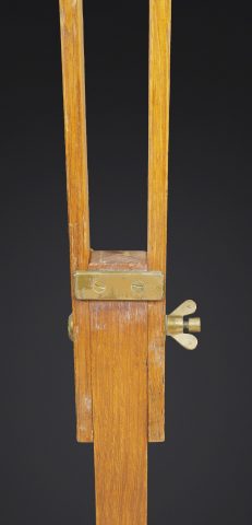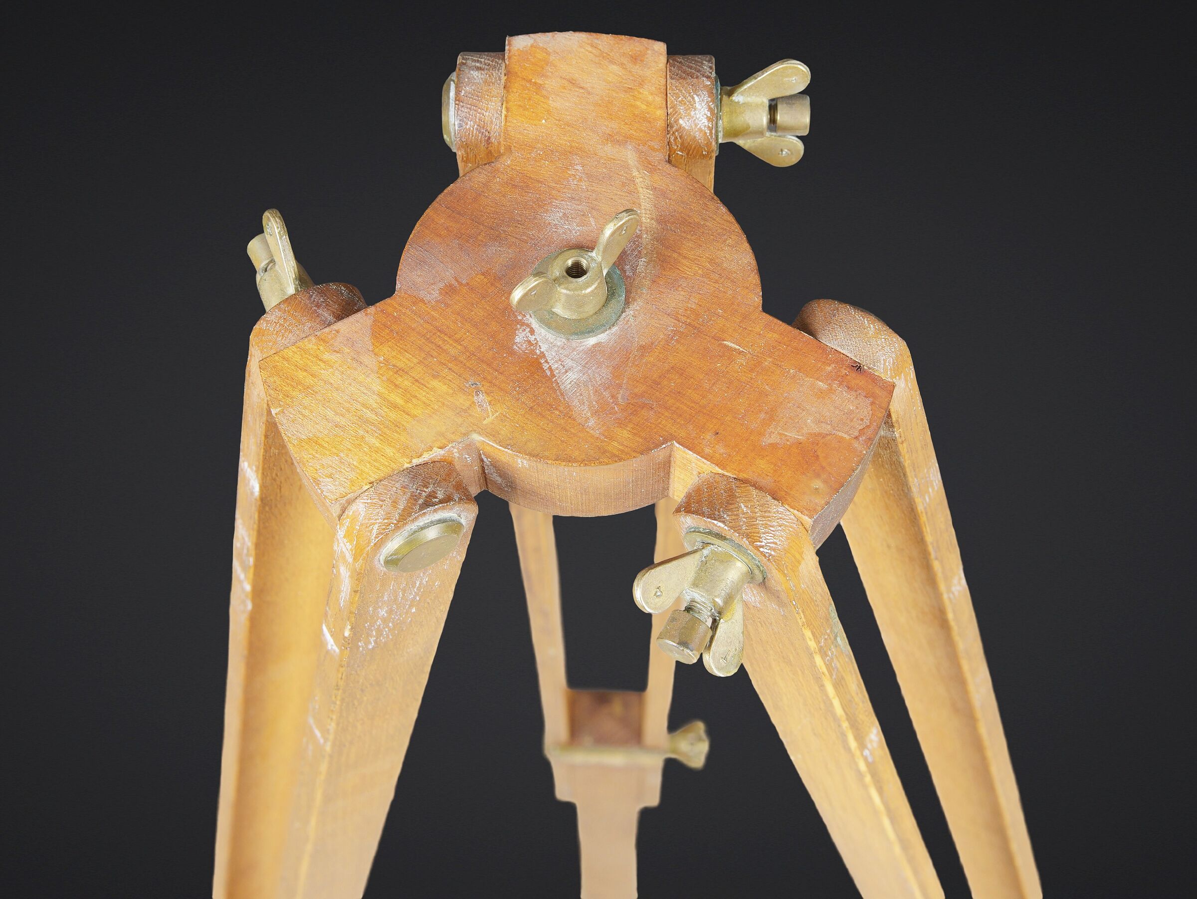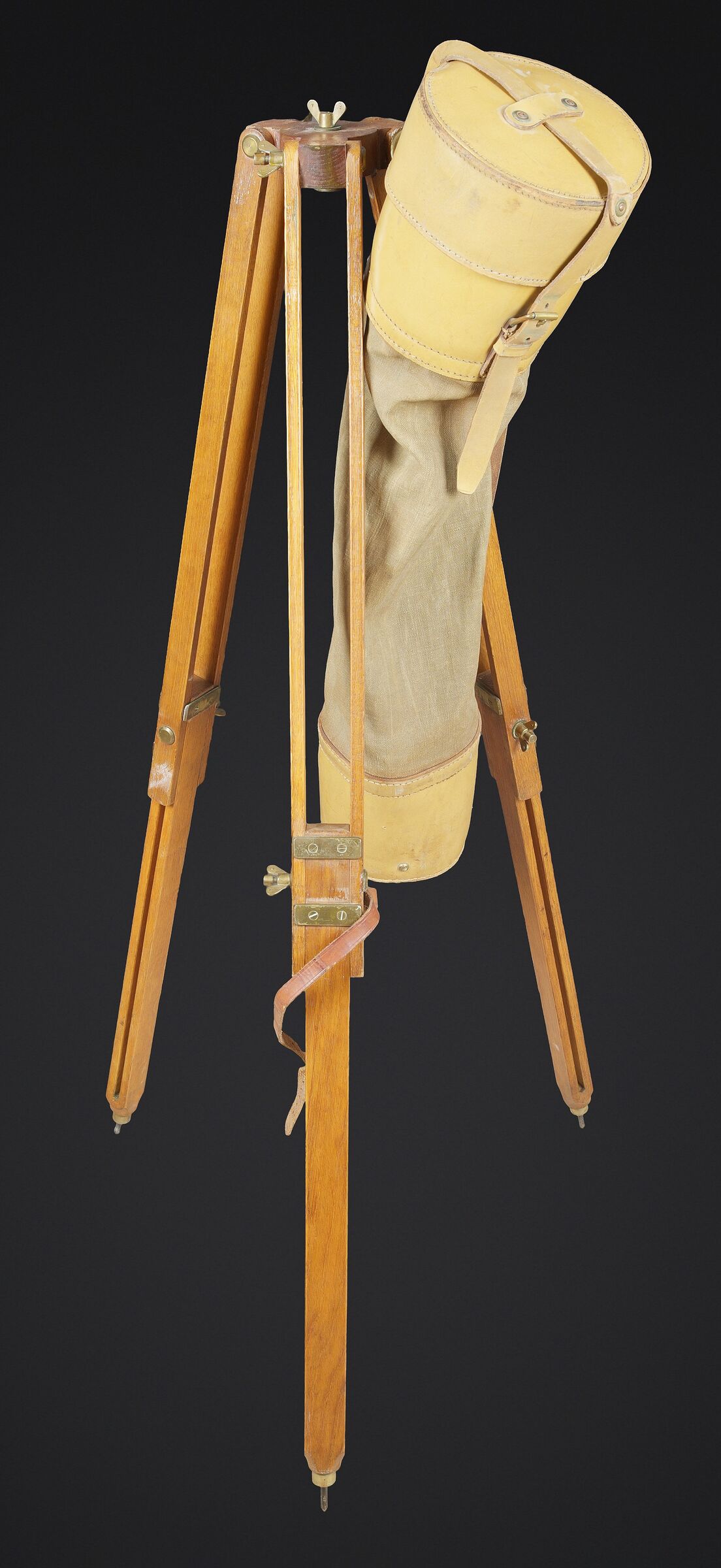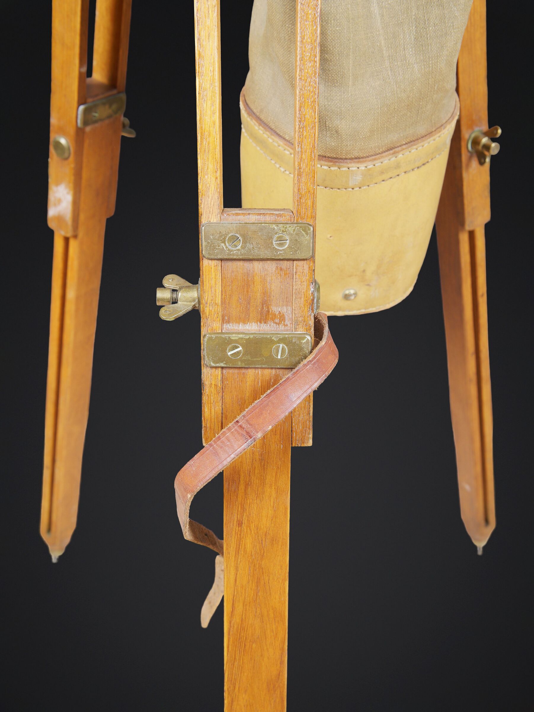 Détails de la vente >Equipement du génie. Comprenant Une housse en toile kaki et cuir fauve. La sangle de transport est présente. Trépied en bois et laiton. Trois pointes de fixation au sol. Sans marquages... en savoir plus