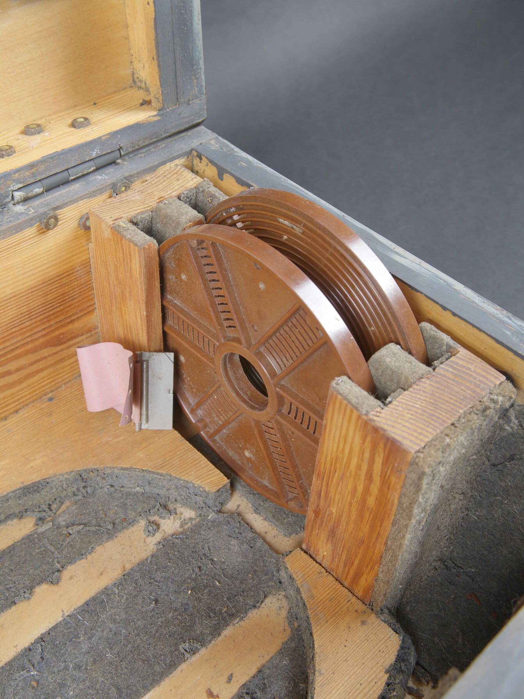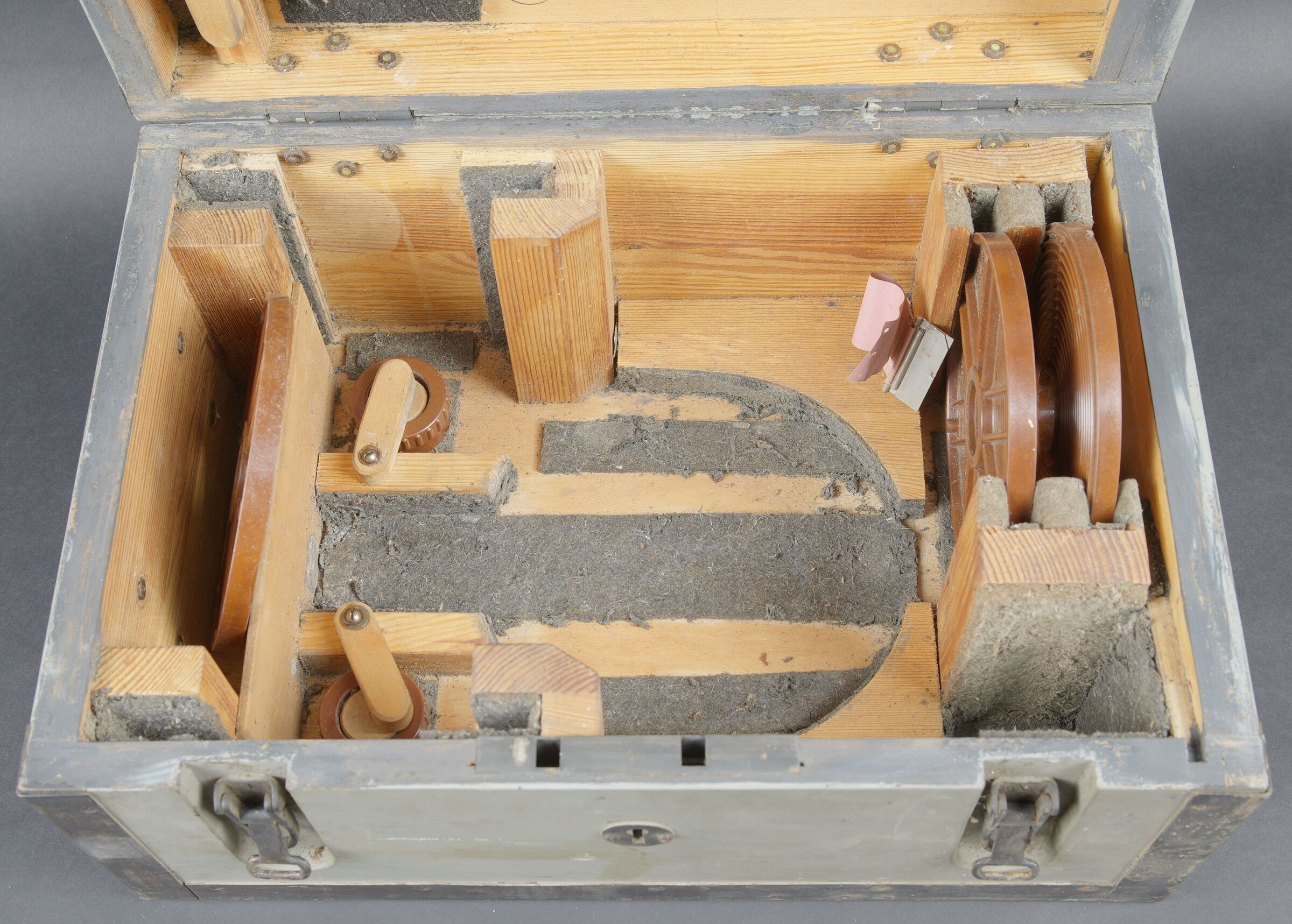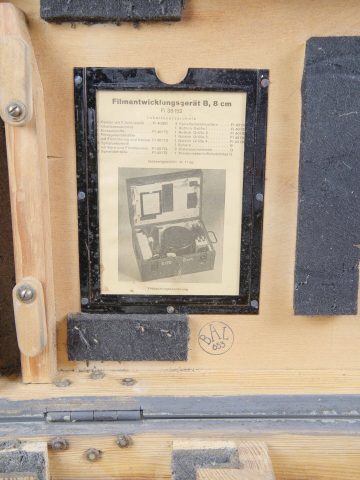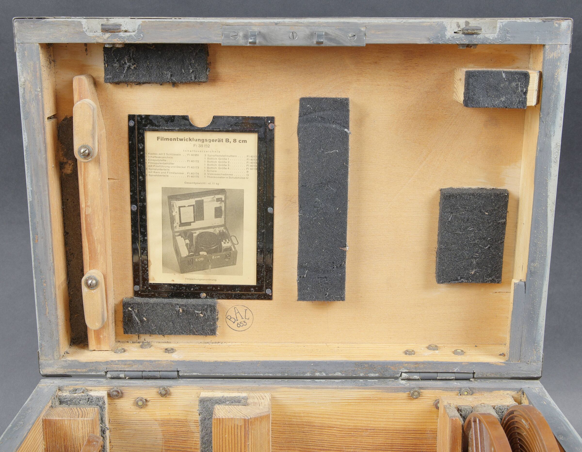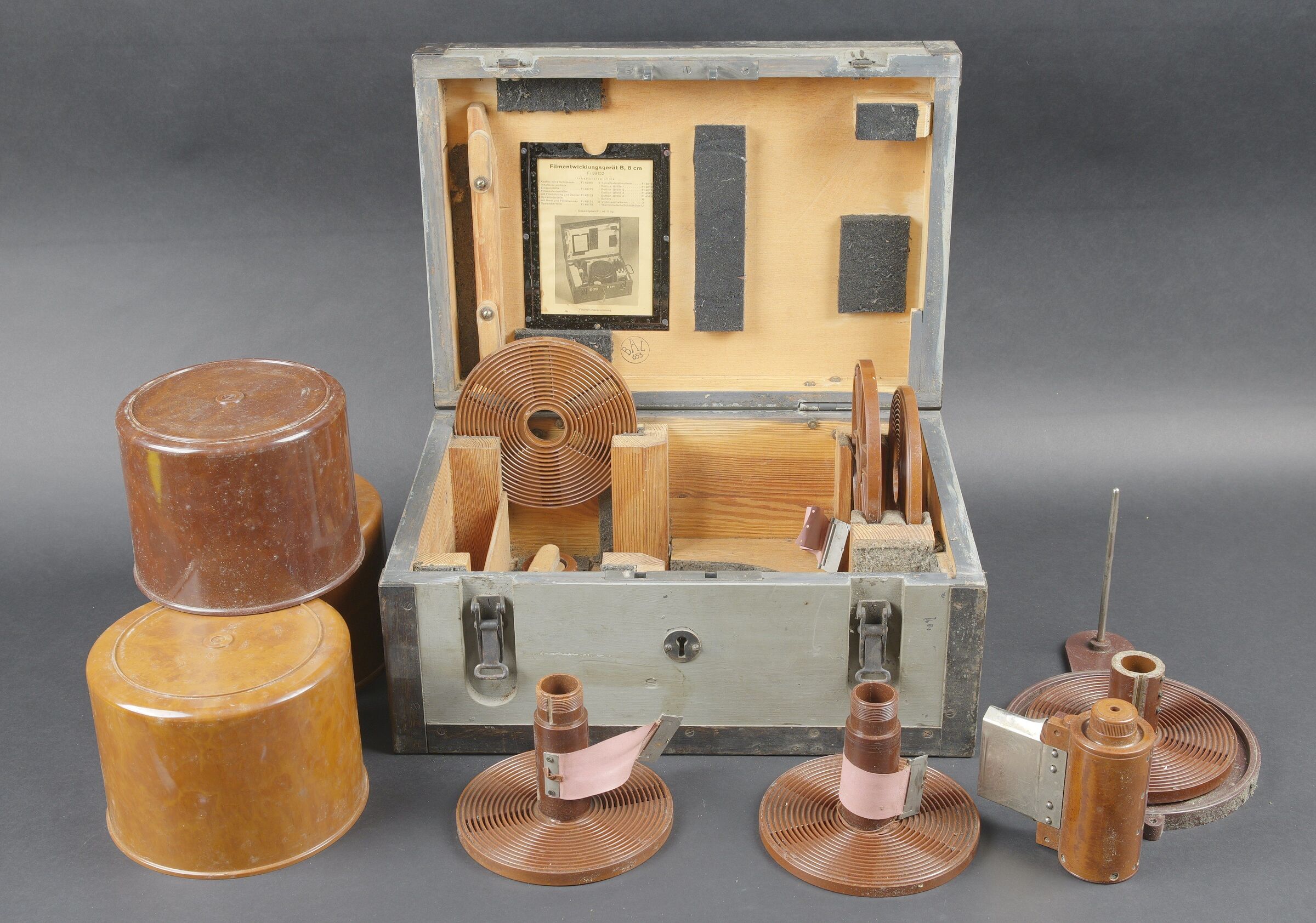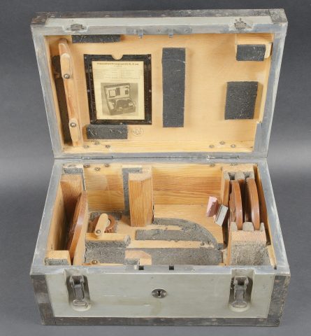 Filmentwicklungsgerät B 8 cm. Belle caisse en bois avec renfort métallique. Les poignées de transport sont présentes. Les crochets de fermeture sont fonctionnels. Belle peinture gris/bleu à 70%. Les racks interne sont présents et recouvert de feutrine noire. La majorité des accessoires en bakélite marron sont présents. Couvercle disposant du tampon BAL 653. La notice d’inventaire est présente. Certains accessoires sont manquants. La clé de fermeture est absente. Ces appareils ont été utilisés pour le traitement rapide de photos aériennes, par exemple à partir de séries telles que le 20cm. A noter une certaine usure et patine de la pièce. Etat II+. Filmentwicklungsgerät B for 8 cm film. Wooden case with metal reinforcements, carrying handles present, functional latches, grey-blue paint at 70%. Internal racks lined with black felt. Majority of brown bakelite accessories present. Lid stamped BAL 653. Inventory list present. Key missing. Used for rapid processing of aerial reconnaissance film. Showing normal wear and patina. Condition II+.