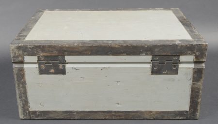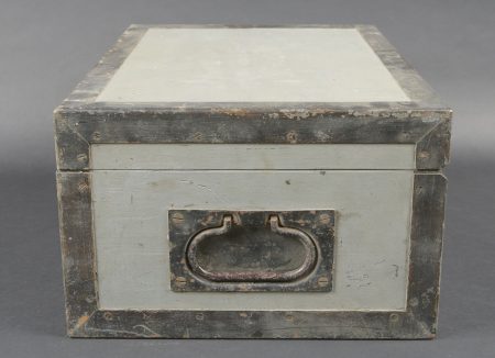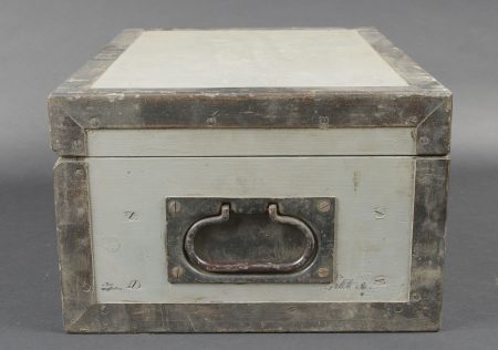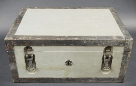Détails de la vente >Filmentwicklungsgerät B 8 cm. Belle caisse en bois avec renfort métallique. Les poignées de transport sont présentes. Les crochets de fermeture sont fonctionnels. Belle peinture gris/bleu à... en savoir plus