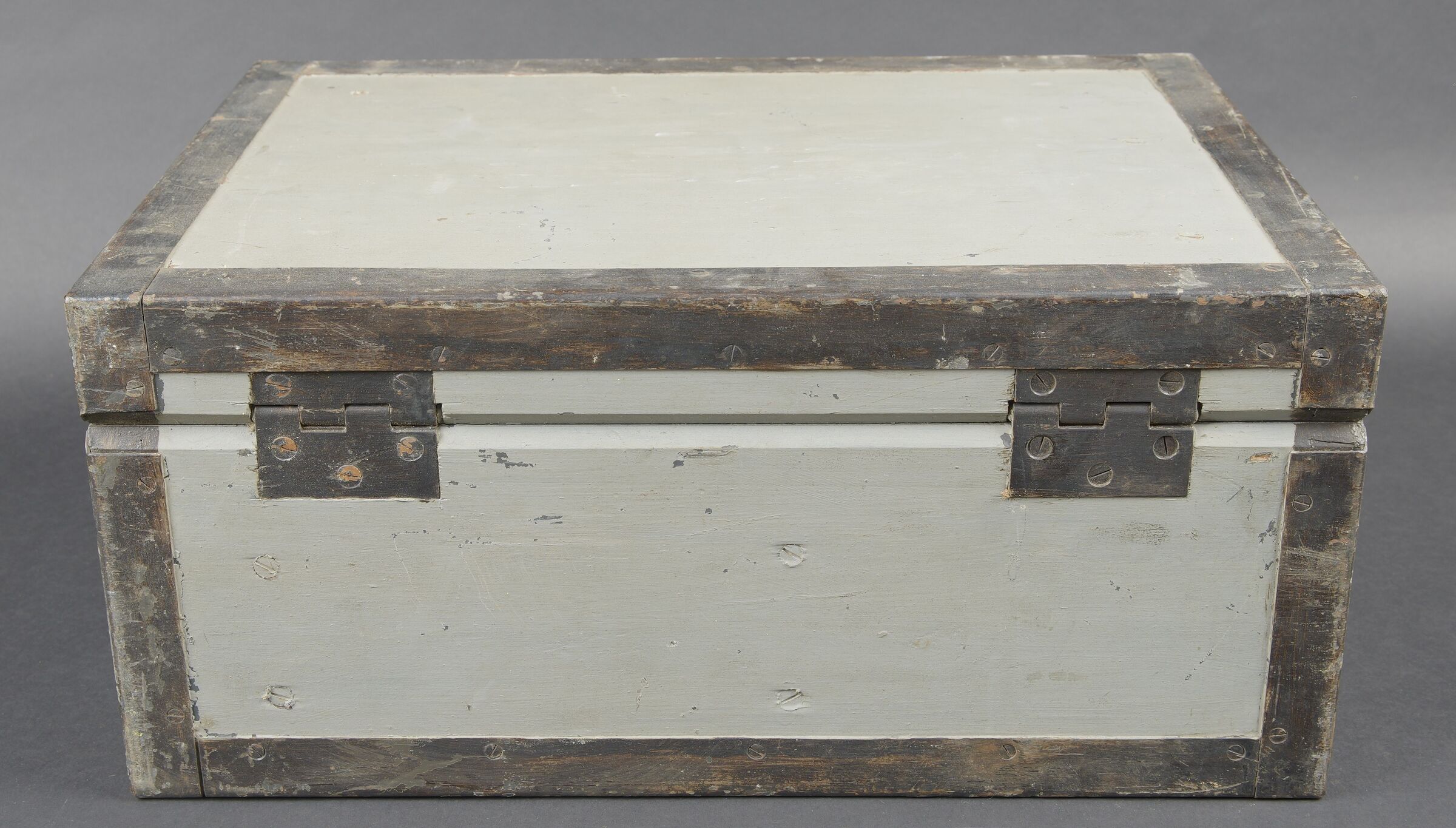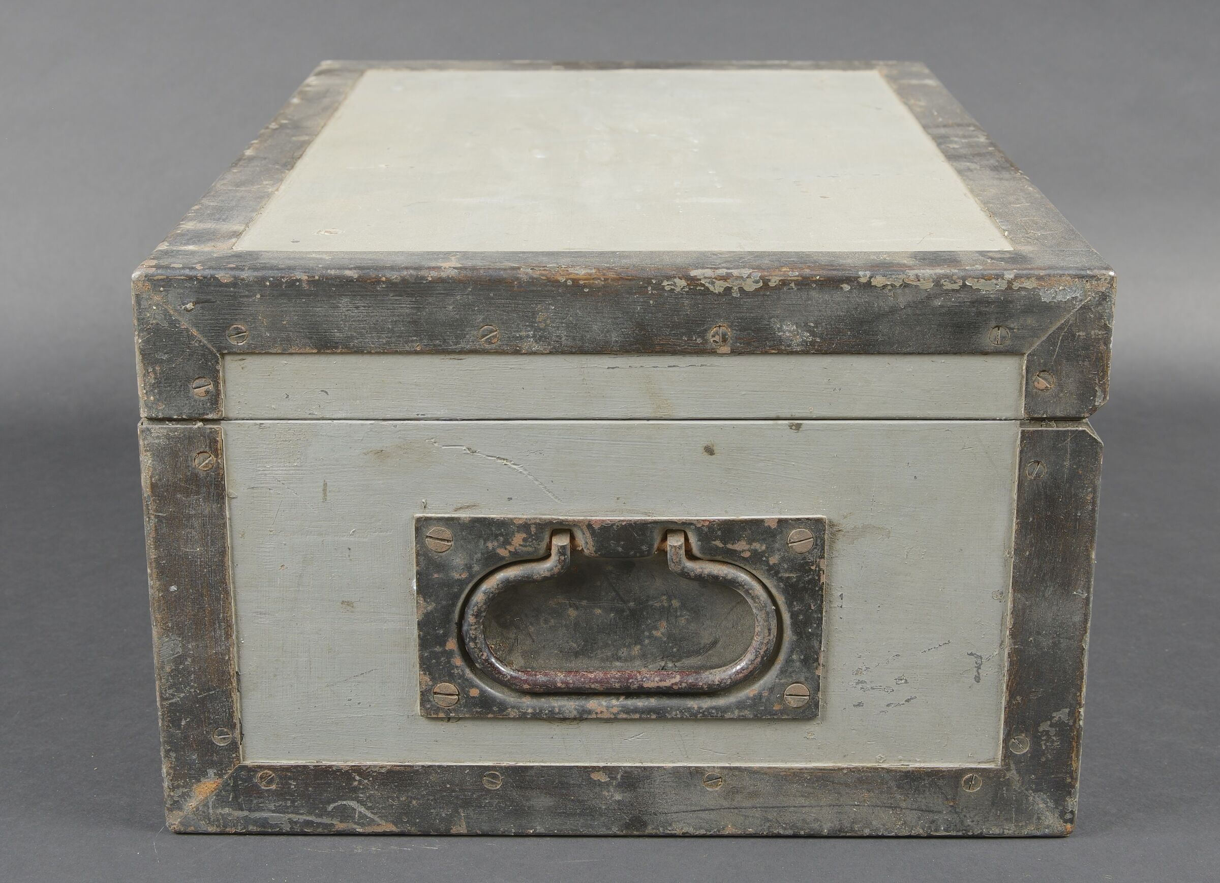 Filmentwicklungsgerät B 8 cm. Belle caisse en bois avec renfort métallique. Les poignées de transport sont présentes. Les crochets de fermeture sont fonctionnels. Belle peinture gris/bleu à... en savoir plus