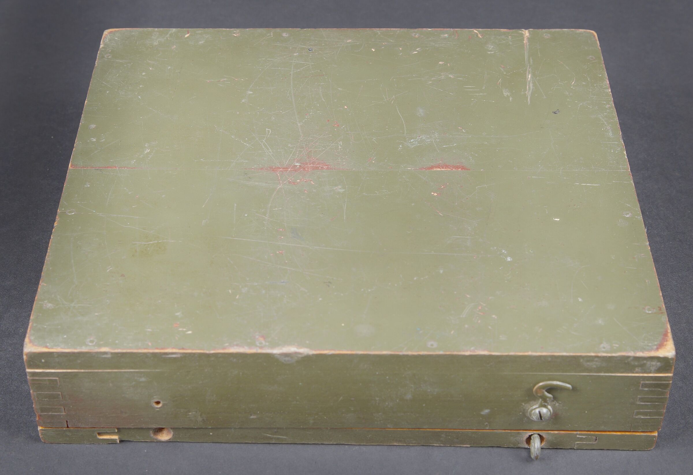 Détails de la vente >Gunner Quadrant US. Belle boite en bois avec renfort en métal. Peinture kaki à 80%. Couvercle marqué Chest Packing for Gunner’s quadrant. Chiffre 12 peint à la peinture jaune sur la... en savoir plus
