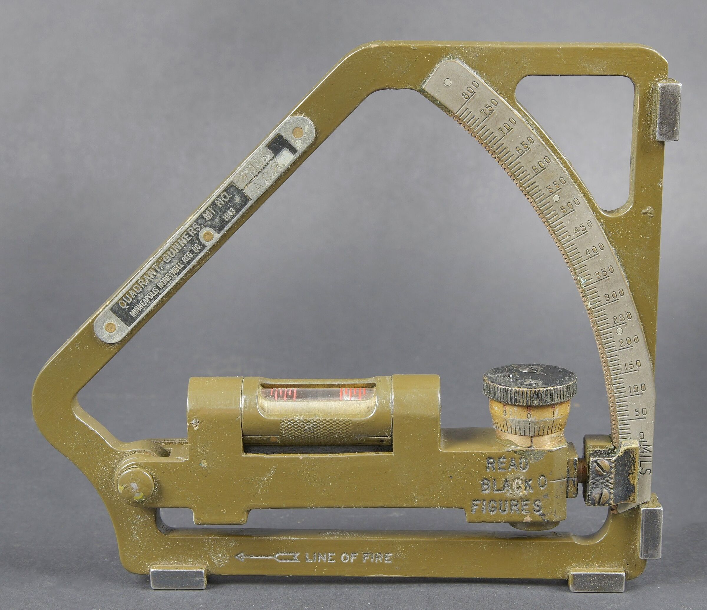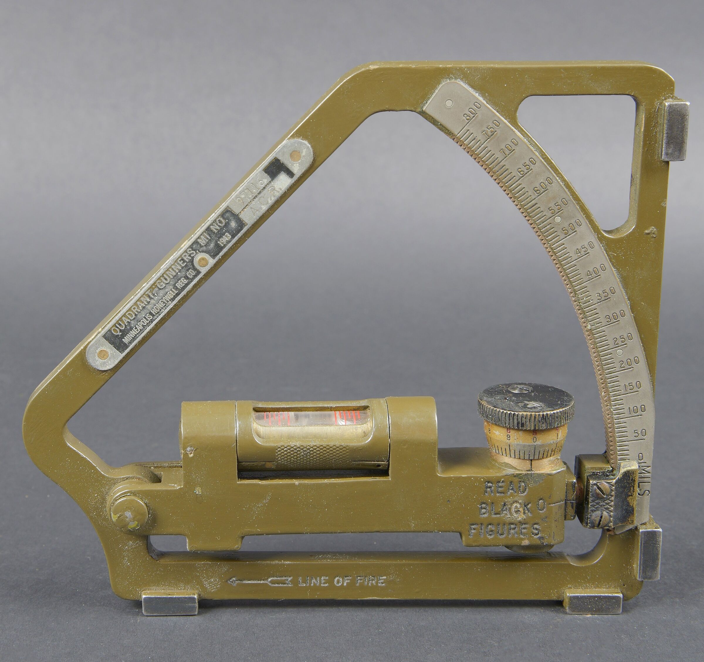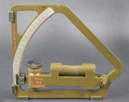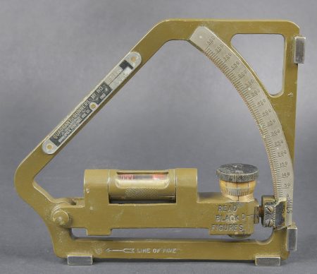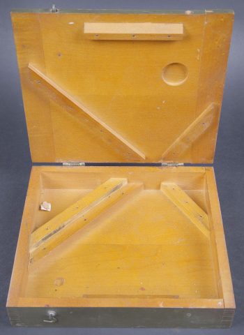 Gunner Quadrant US. Belle boite en bois avec renfort en métal. Peinture kaki à 80%. Couvercle marqué Chest Packing for Gunner’s quadrant. Chiffre 12 peint à la peinture jaune sur la partie basse du couvercle. Un crochet de fermeture est absent. Les racks interne sont présent. Quadrant gunner en métal. Peinture kaki à 90%. Niveau à bulle fonctionnel. Plaquette marquée Quadrant Gunners M1 NO 9/116, Mineapolis Honeywell REG Co 1943 ACR. Numéro C44899. A noter une certaine usure et patine de la pièce. Etat II+. US gunner’s quadrant Fine wooden transport case with metal reinforcements. Khaki paint 80% preserved. Lid marked Chest Packing for Gunner’s Quadrant with yellow painted number 12 on the lower section. One closing hook missing. Internal racks present. Metal quadrant with khaki paint 90% preserved. Functional bubble level. Plate marked Quadrant Gunner’s M1 No. 9/116, Minneapolis Honeywell Reg. Co. 1943 ACR, serial number C44899. Note some wear and patina to the piece. Condition II+.