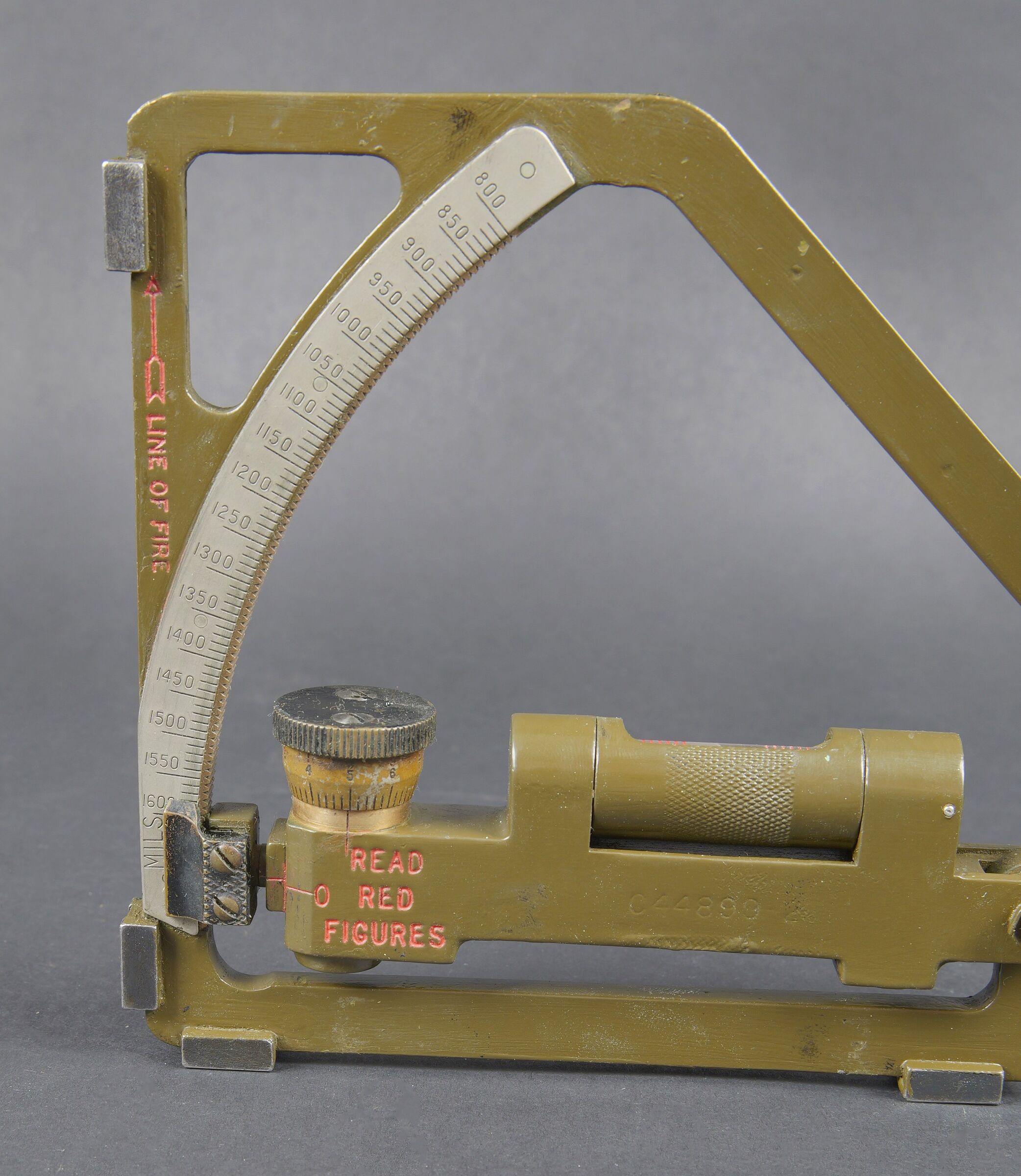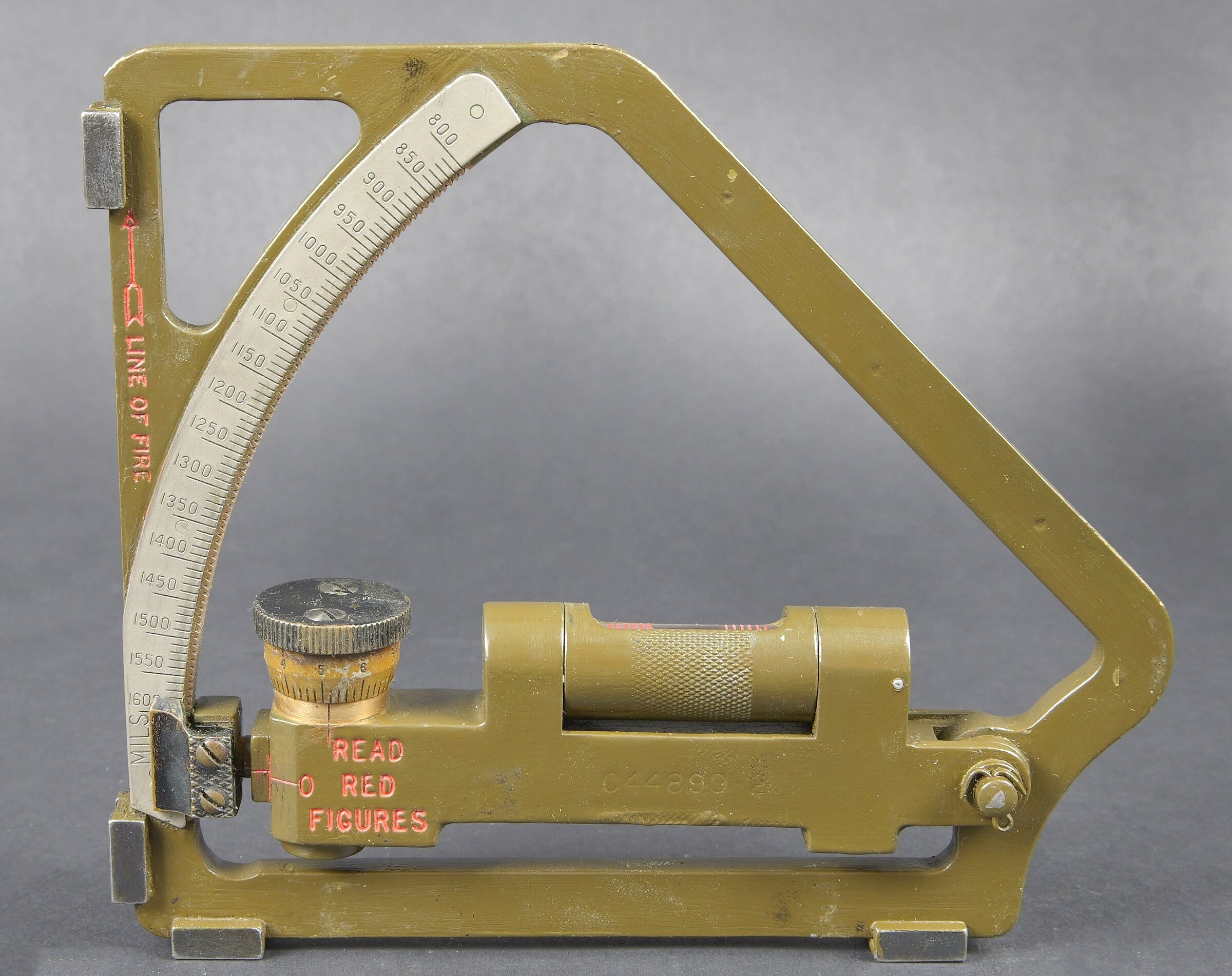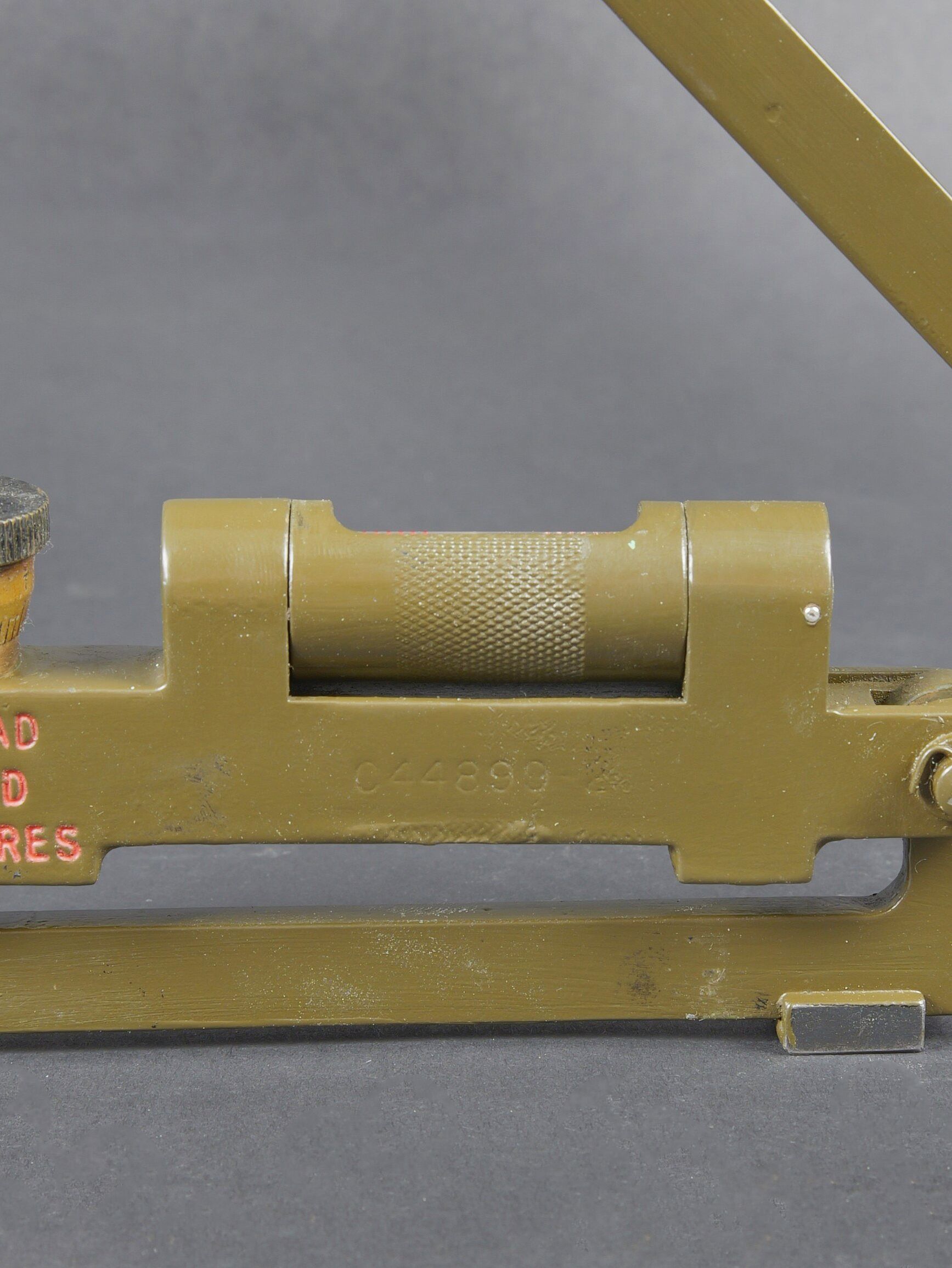 Gunner Quadrant US. Belle boite en bois avec renfort en métal. Peinture kaki à 80%. Couvercle marqué Chest Packing for Gunner’s quadrant. Chiffre 12 peint à la peinture jaune sur la partie basse du couvercle. Un crochet de fermeture est absent. Les racks interne sont présent. Quadrant gunner en métal. Peinture kaki à 90%. Niveau à bulle fonctionnel. Plaquette marquée Quadrant Gunners M1 NO 9/116, Mineapolis Honeywell REG Co 1943 ACR. Numéro C44899. A noter une certaine usure et patine de la pièce. Etat II+. US gunner’s quadrant Fine wooden transport case with metal reinforcements. Khaki paint 80% preserved. Lid marked Chest Packing for Gunner’s Quadrant with yellow painted number 12 on the lower section. One closing hook missing. Internal racks present. Metal quadrant with khaki paint 90% preserved. Functional bubble level. Plate marked Quadrant Gunner’s M1 No. 9/116, Minneapolis Honeywell Reg. Co. 1943 ACR, serial number C44899. Note some wear and patina to the piece. Condition II+.