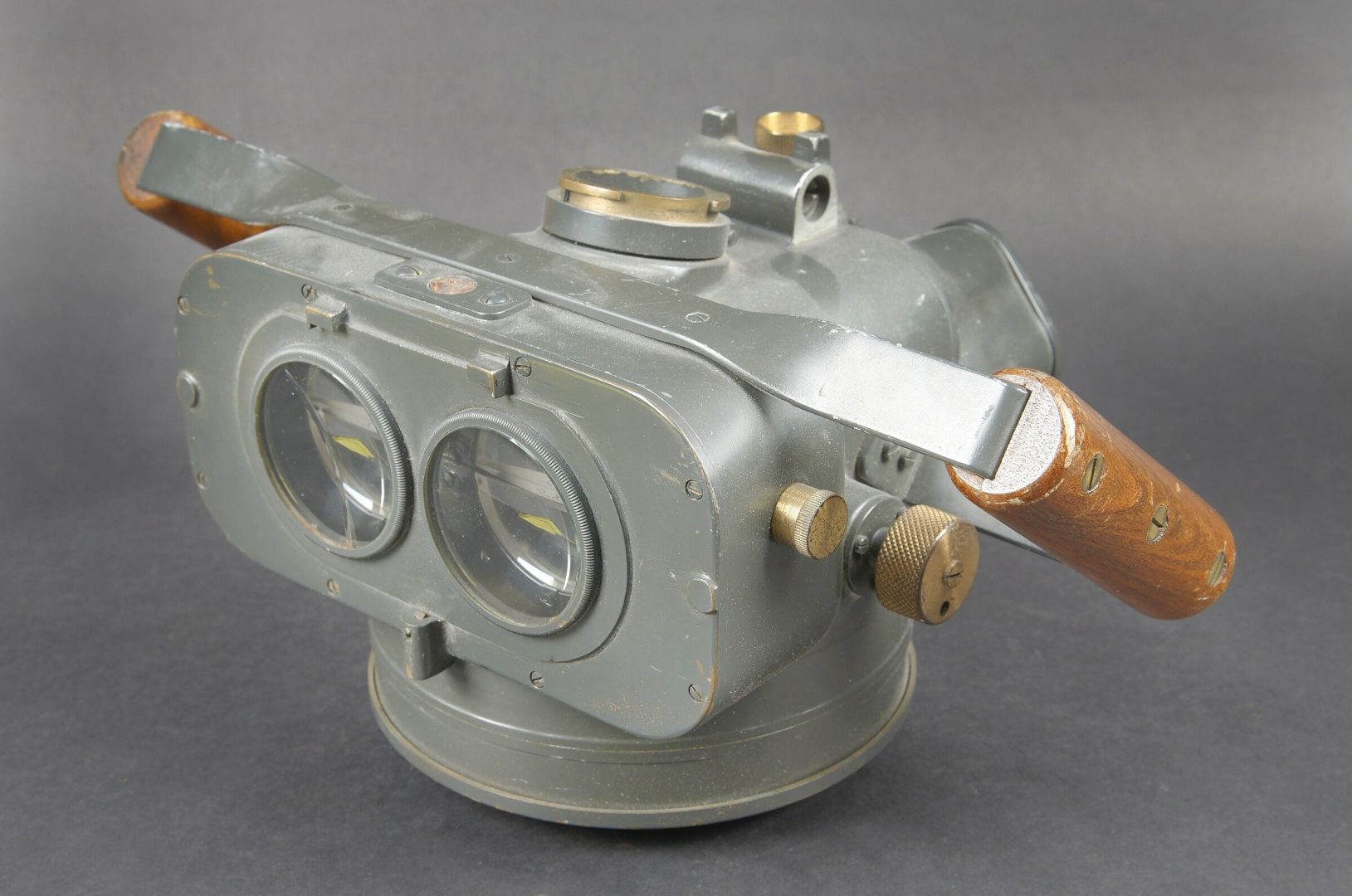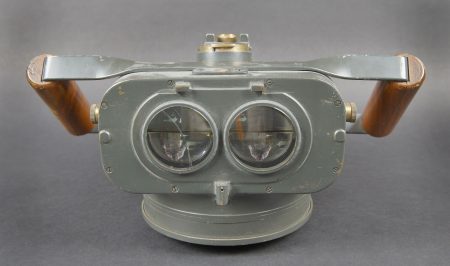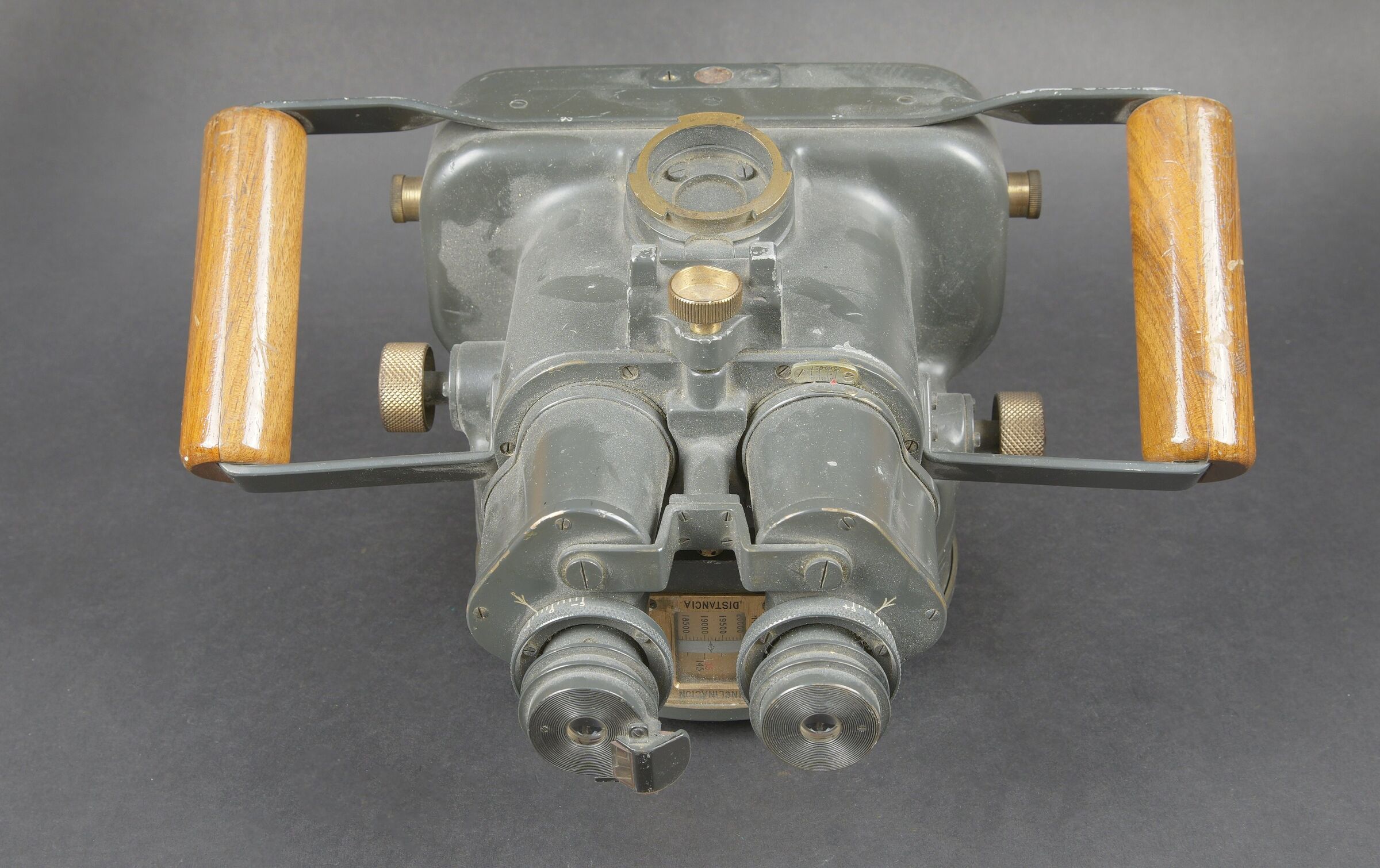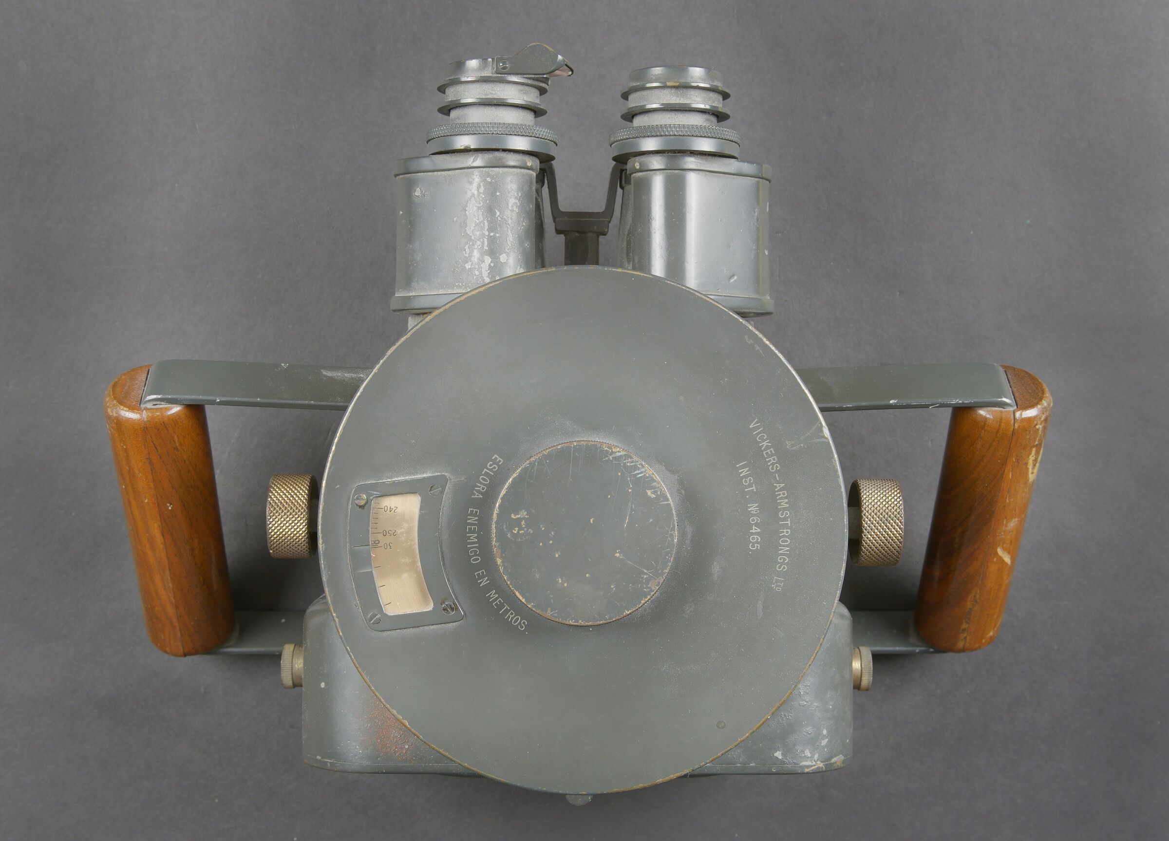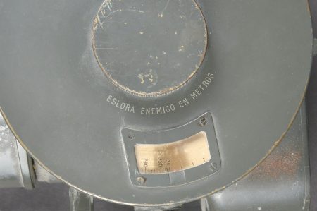 Instrument de visée Vickers Armstrong Inst N6465. Indication Eslora enemigo en metros. En métal. Poignée en bois. Peinture à 70%. Une lentille est fendue. Optique claire présentant quelques tâches. A noter une certaine usure et patine de la pièce. Etat II+. Vickers-Armstrong sighting instrument Inst. N°6465 with the indication Eslora enemigo en metros. Metal body with wooden handle, retaining approximately 70% of its paint. One lens is cracked. Clear optics showing a few spots. Noteworthy overall wear and an attractive period patina. Condition II+.