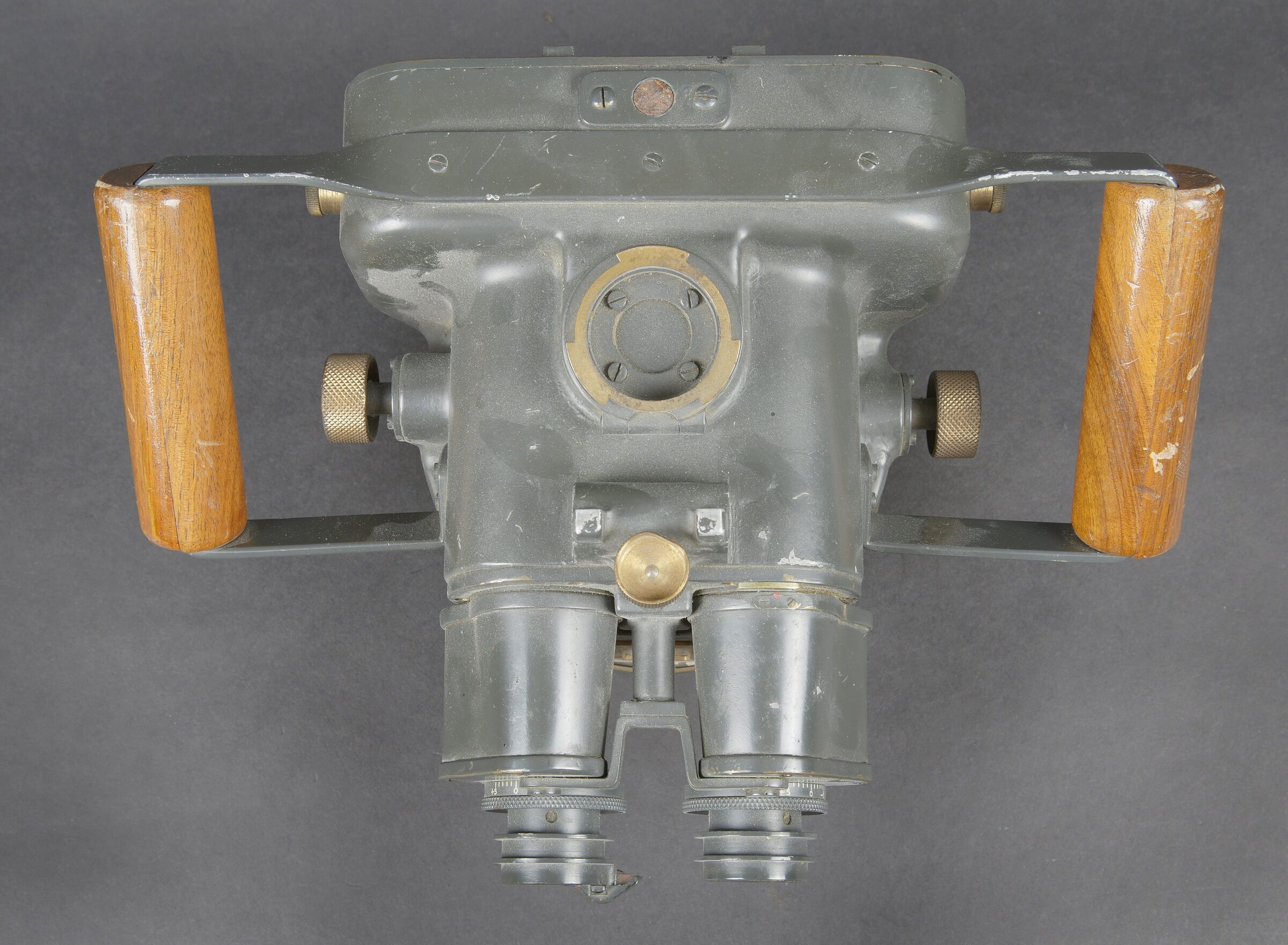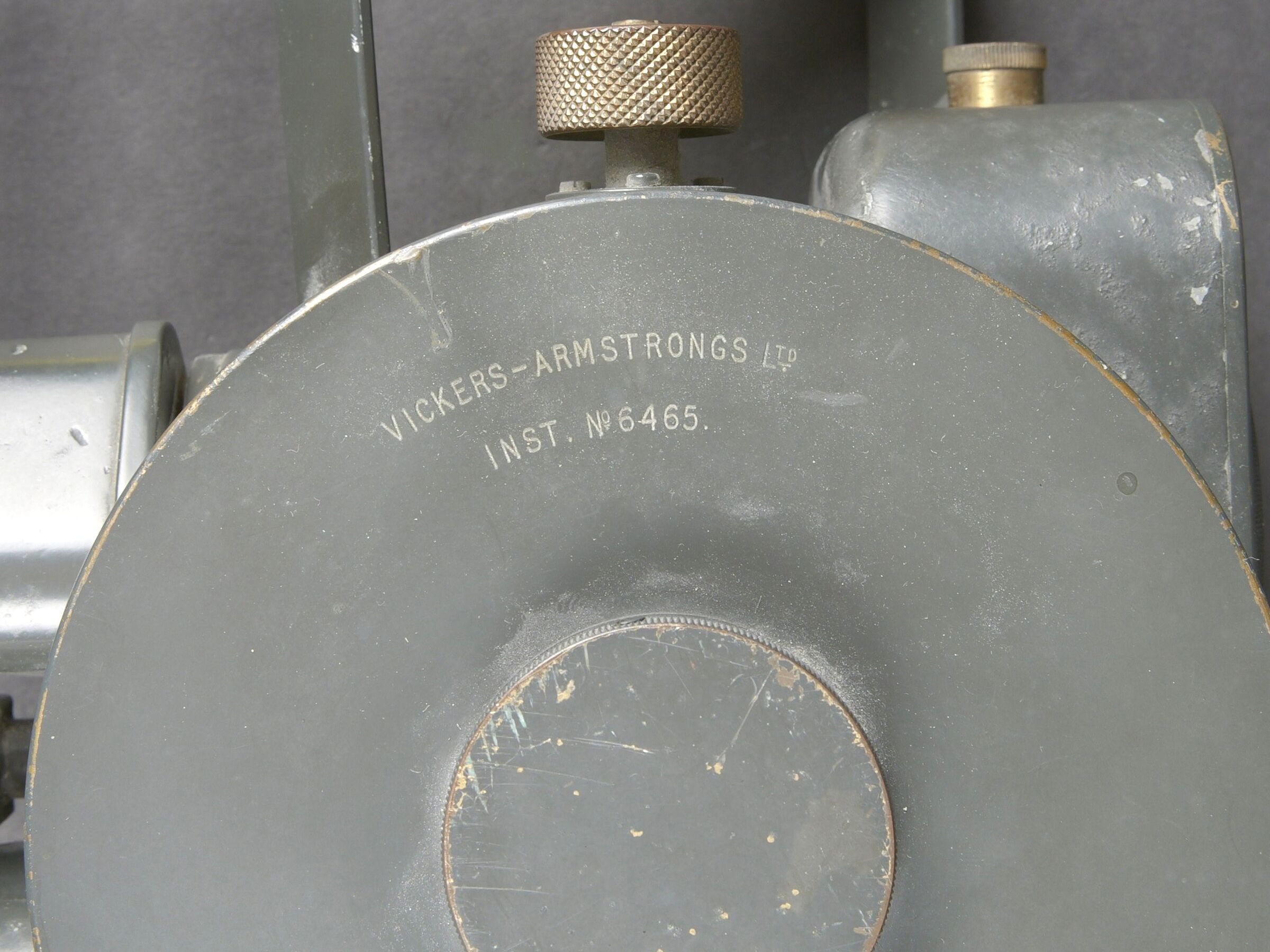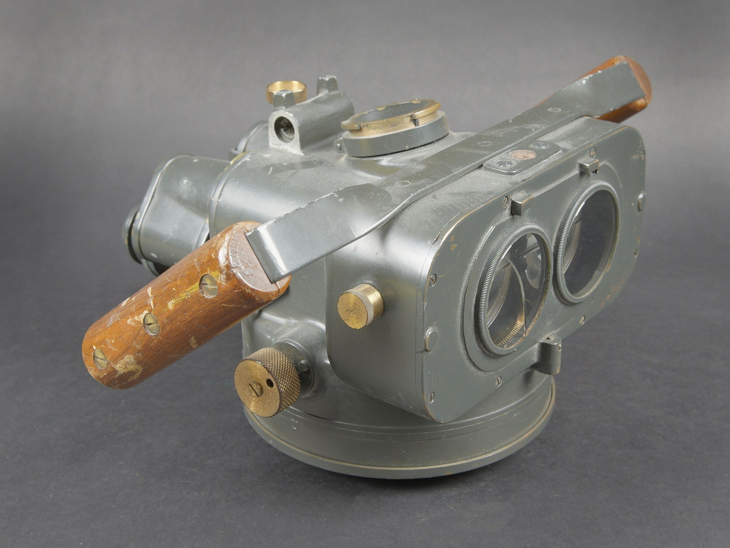 Instrument de visée Vickers Armstrong Inst N6465. Indication Eslora enemigo en metros. En métal. Poignée en bois. Peinture à 70%. Une lentille est fendue. Optique claire présentant quelques tâches. A noter une certaine usure et patine de la pièce. Etat II+. Vickers-Armstrong sighting instrument Inst. N°6465 with the indication Eslora enemigo en metros. Metal body with wooden handle, retaining approximately 70% of its paint. One lens is cracked. Clear optics showing a few spots. Noteworthy overall wear and an attractive period patina. Condition II+.