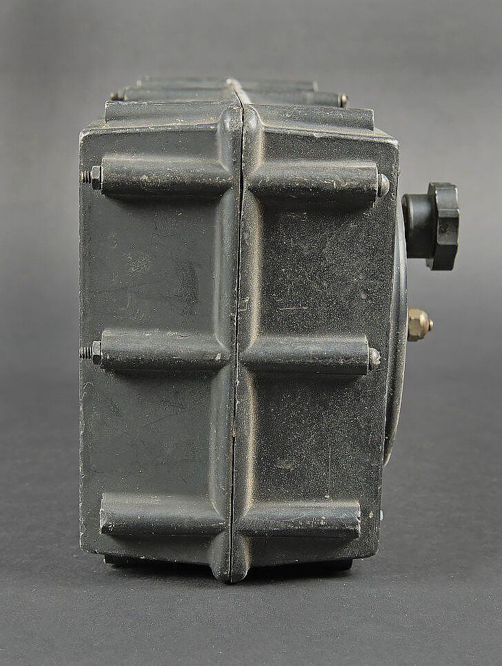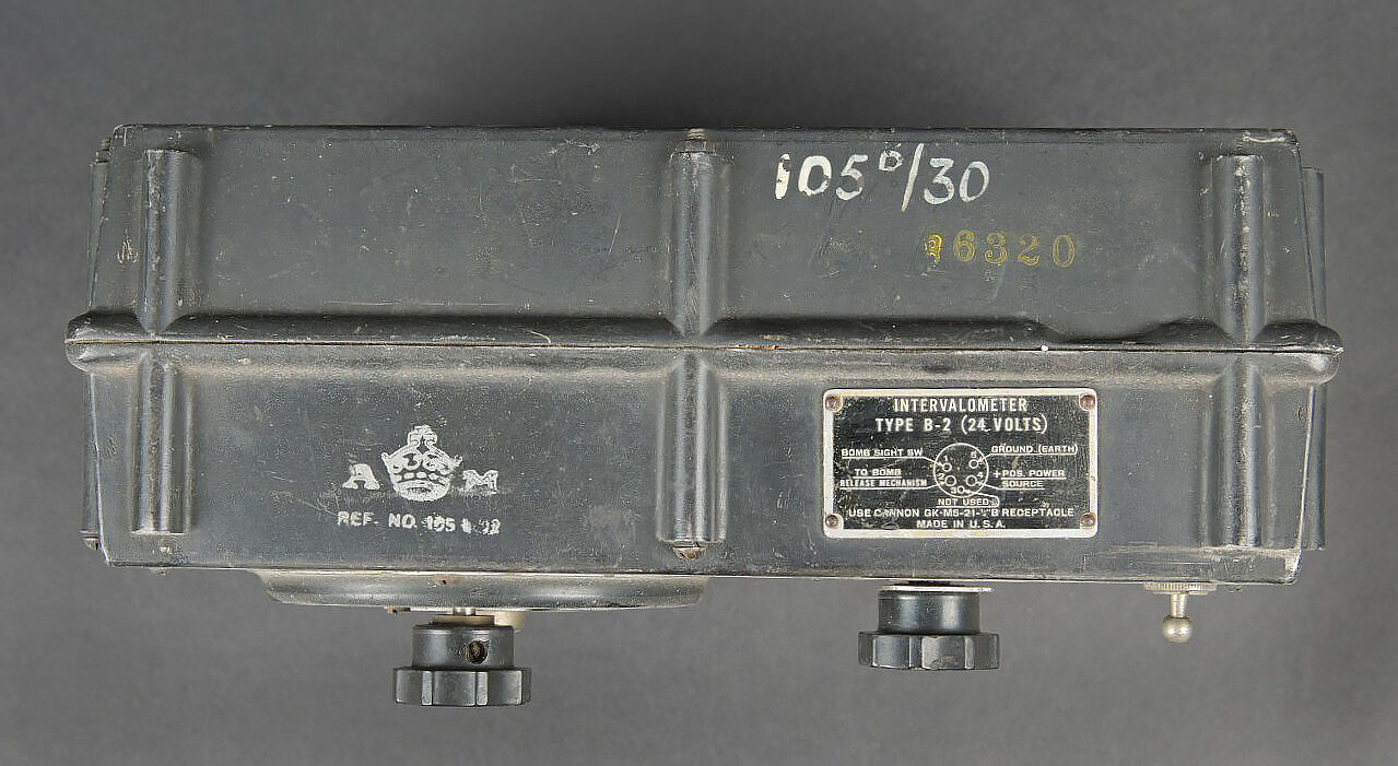 Intervalometer type B-2. Caisson en bakélite et aluminium. Plaquette marquée Intervalometer Type B-2. Fabrication américaine. Marquages à la peinture AM sous couronne. Toutes les pièces mobiles sont présentes. A noter une certaine usure et patine de la pièce. Etat II+. Les avions bombardiers peuvent libérer toutes les bombes à la fois ou larguer des bombes individuelles à intervalles. Un bombardier qui sélectionne ce dernier peut programmer un intervallomètre pour contrôler le taux de libération de la bombe, qui détermine à quelle distance elles atterrissent dans la zone cible. Intervalometer Type B-2 Bakelite and aluminium case. Plate marked Intervalometer Type B-2. American manufacture with Air Ministry crowned marking. All moving parts present and functional. Used in bomber aircraft to control bomb release interval for pattern bombing. Note some wear and patina to the piece. Condition II+.