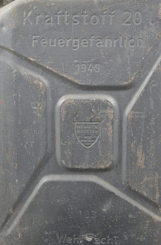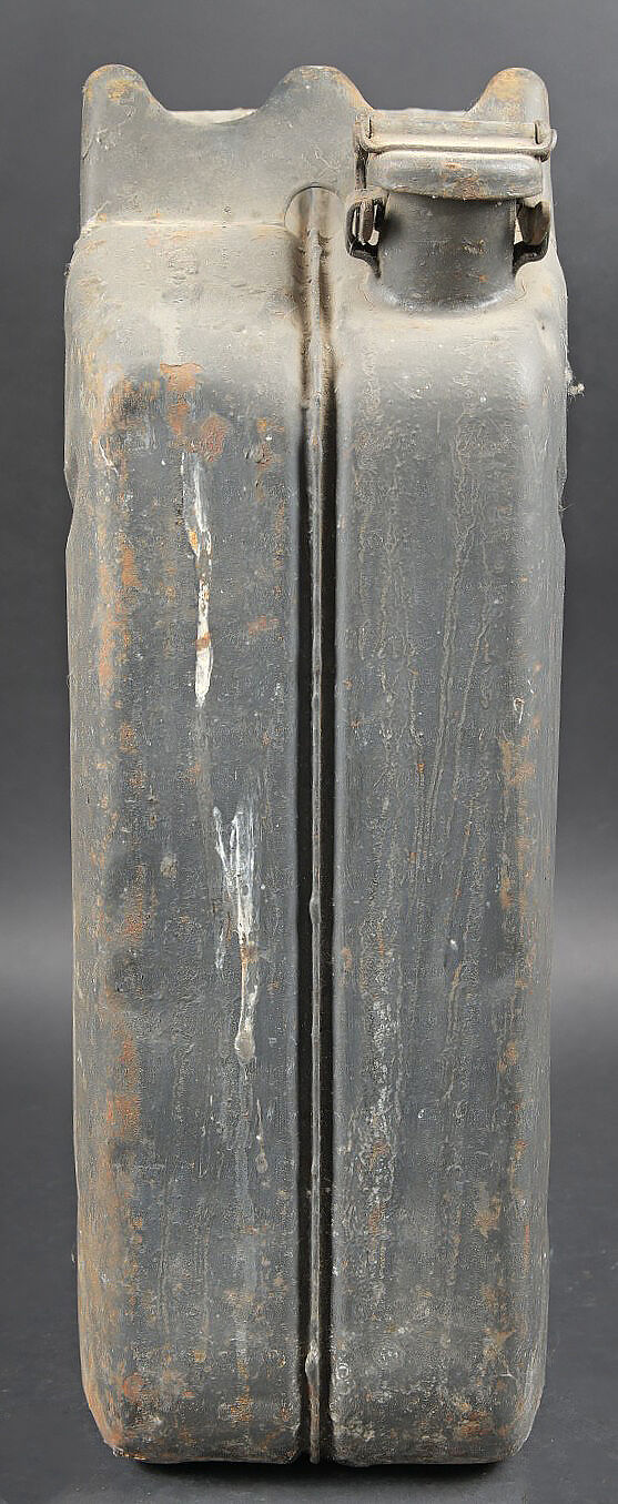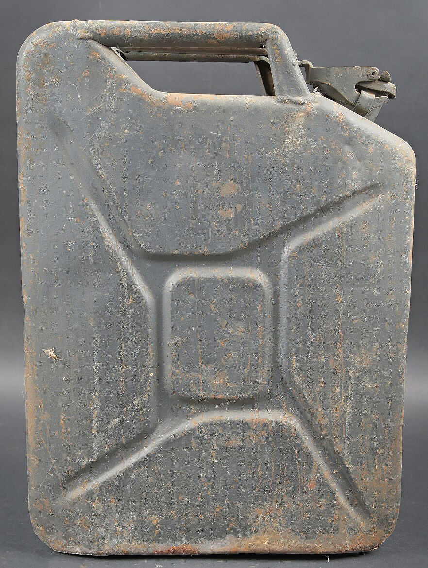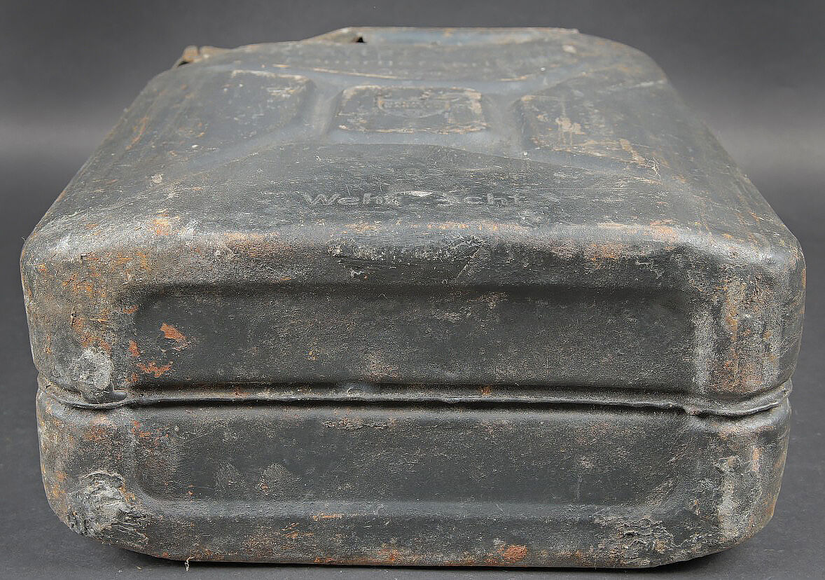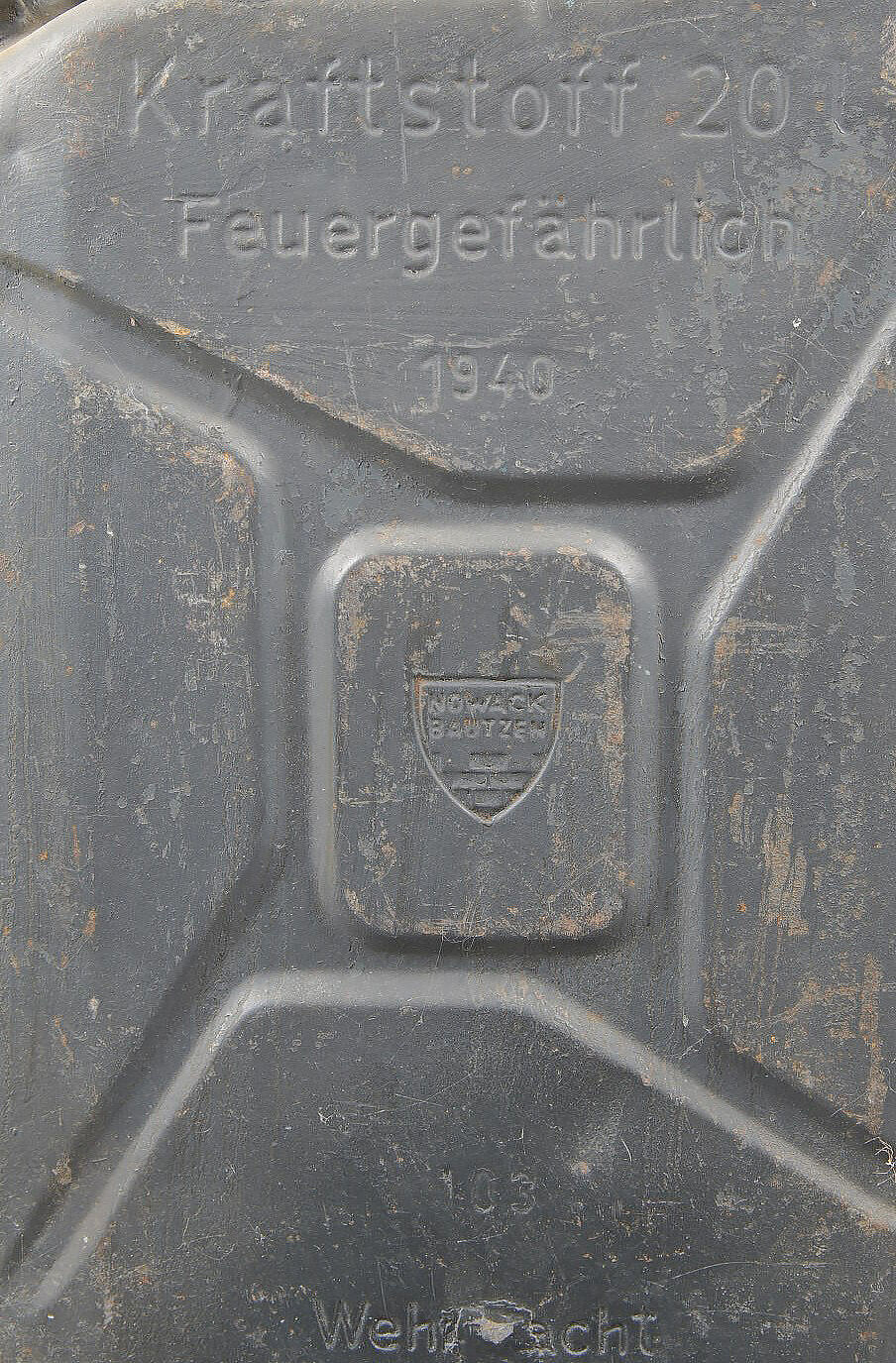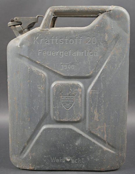 Jerrycan WH. En métal, modèle pour essence. Peinture visiblement postérieure. Marquages Kraftstoff 20L Feuergefährlich 1940, fabrication Nowak. Numéro.103. Bouchon complet. A noter une certaine usure et patine de la pièce. Etat II+. WH jerrycan (fuel). Metal construction with later repaint. Marked Kraftstoff 20L Feuergefährlich 1940, maker Nowak, number 103. Complete cap. Showing wear and patina. Condition II+.