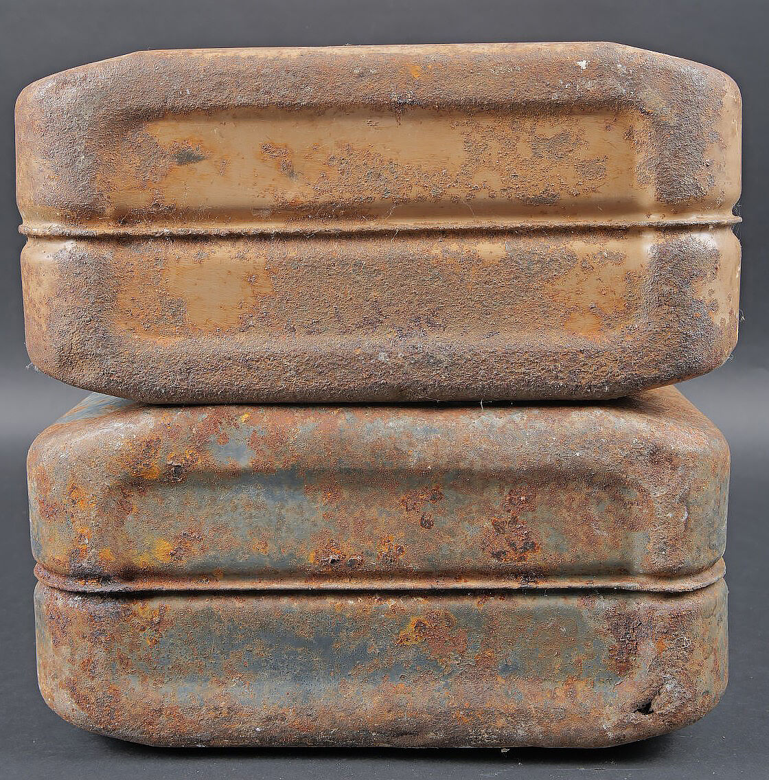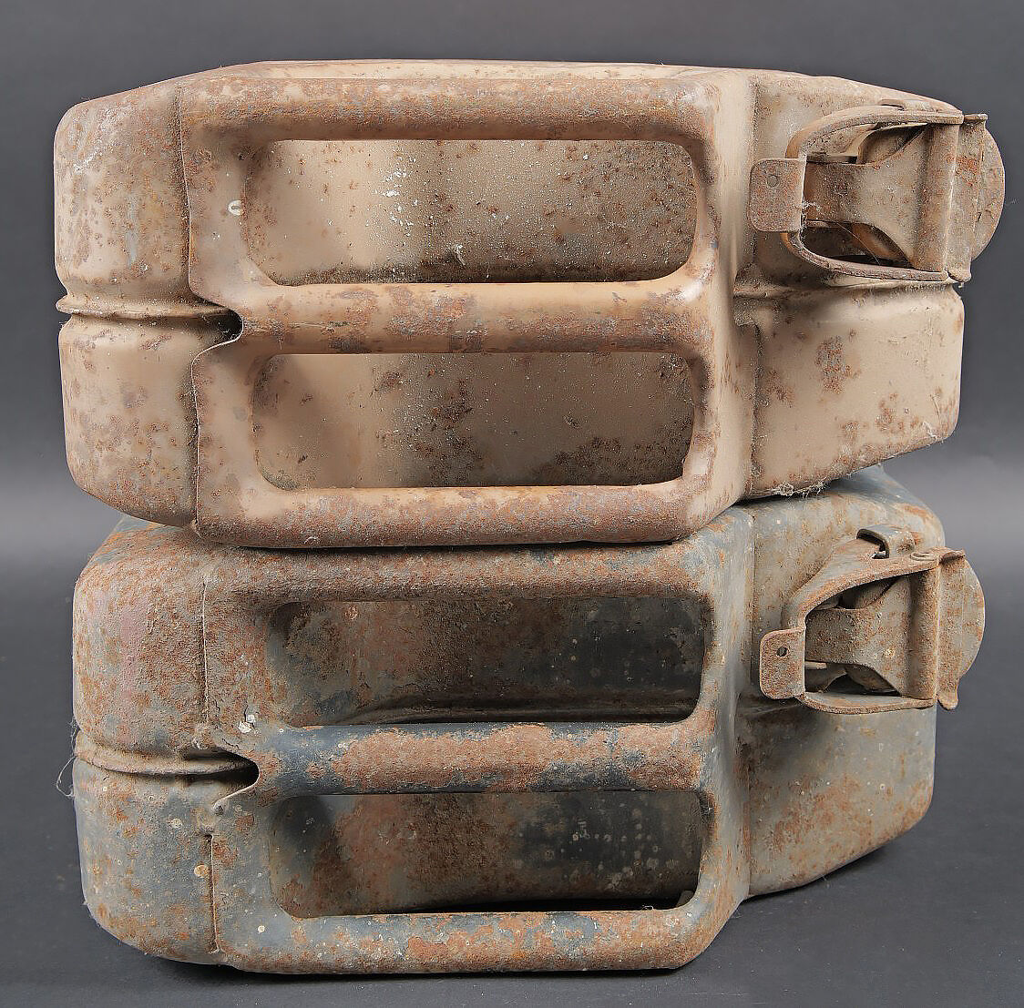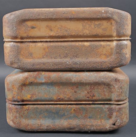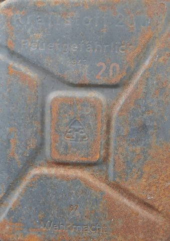 Détails de la vente >Jerrycans WH. Deux jerrycan à essence en métal. Comprenant un jerrycan, peinture à 40%. Déformation au dos. Le bouchon est complet. Marquages Kraftstoff 20L Feuergefährlich 1943, Wehrmacht,... en savoir plus